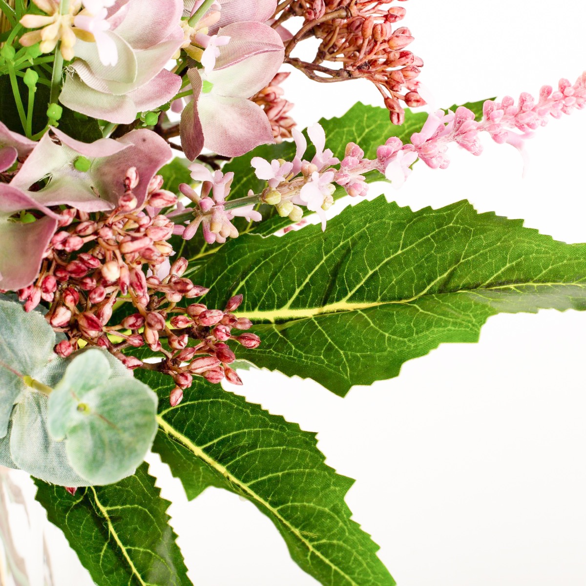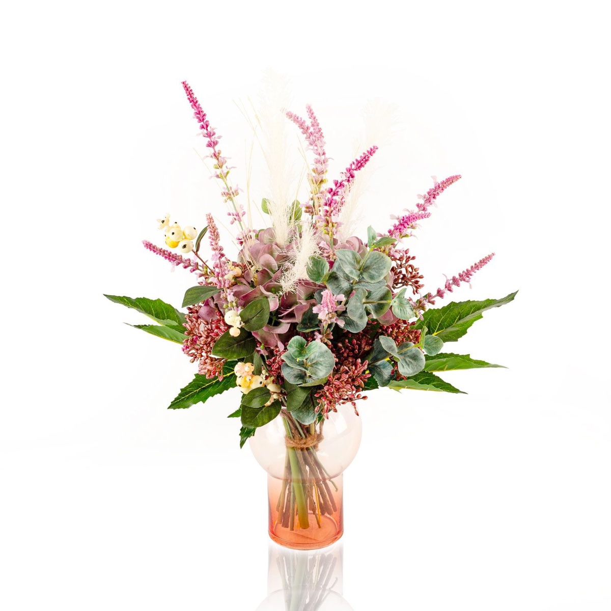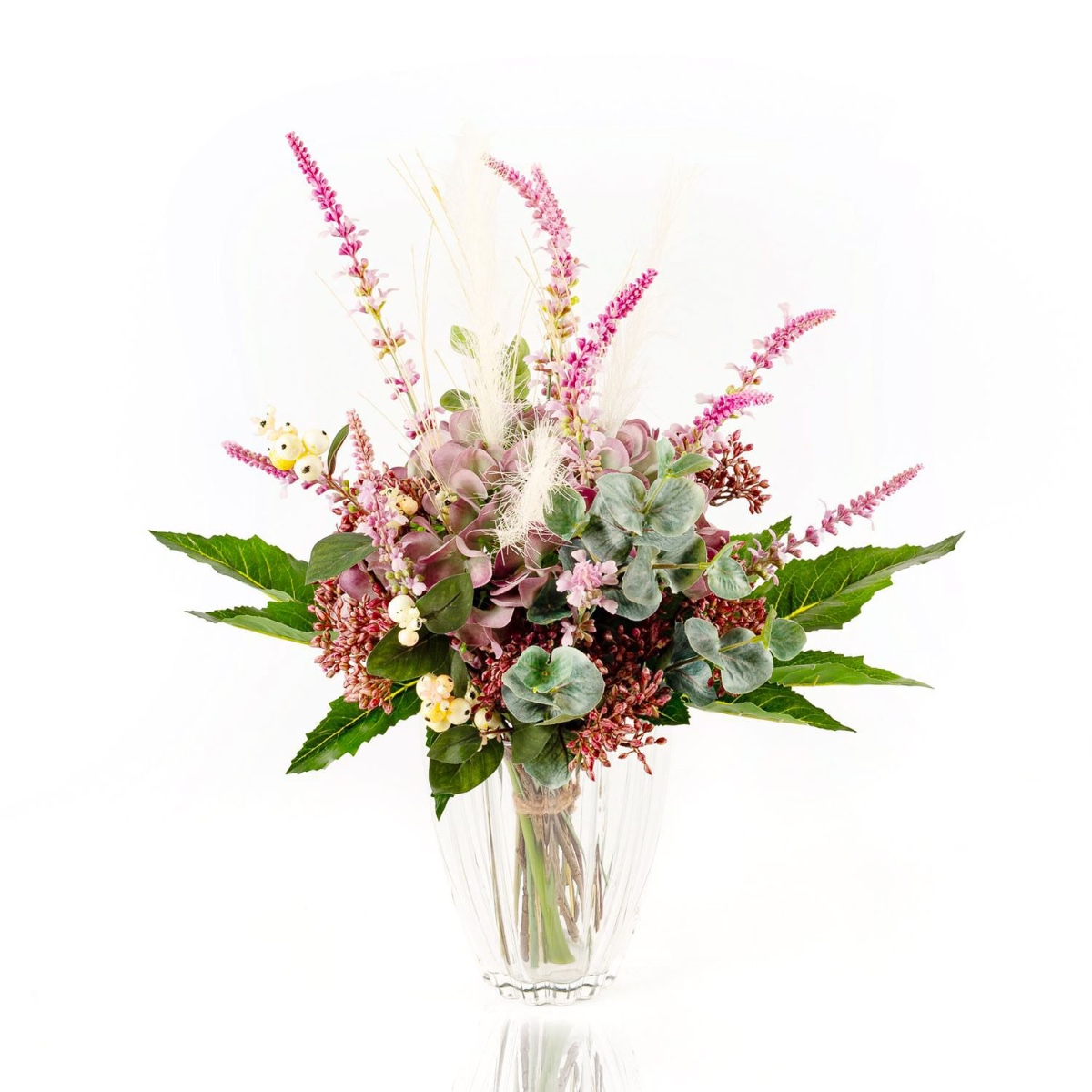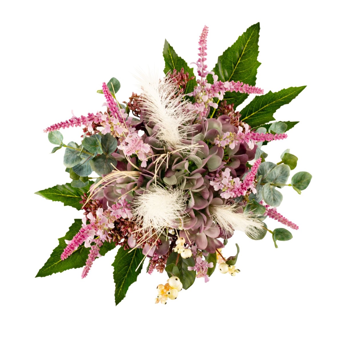 - Arreglo floral artificial atado a mano compuesto por hortensia, Symphoricarpos, brezo, viburno, eucalipto, hierba Pennisetum y aralia en color violeta-rosa-verde