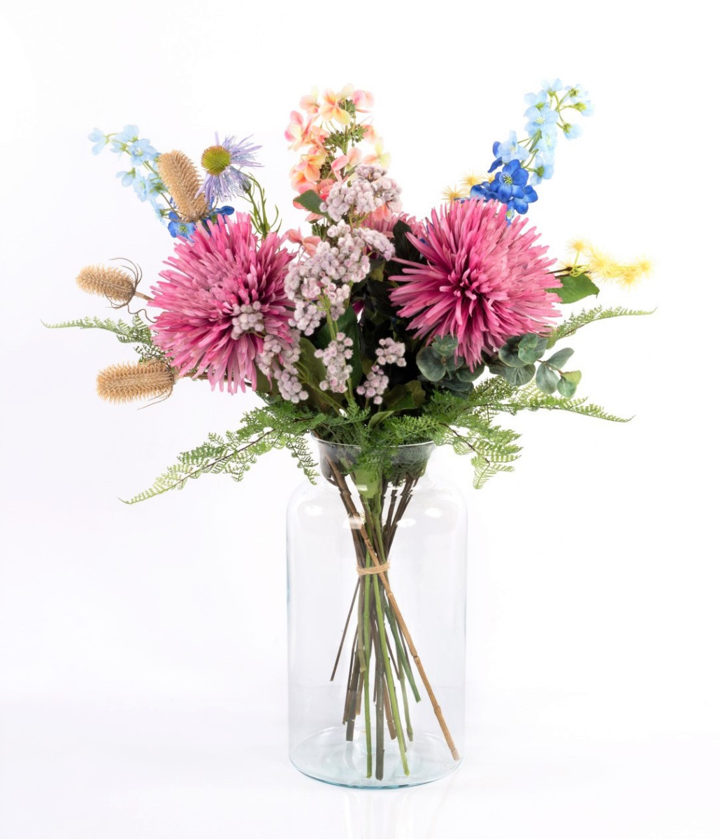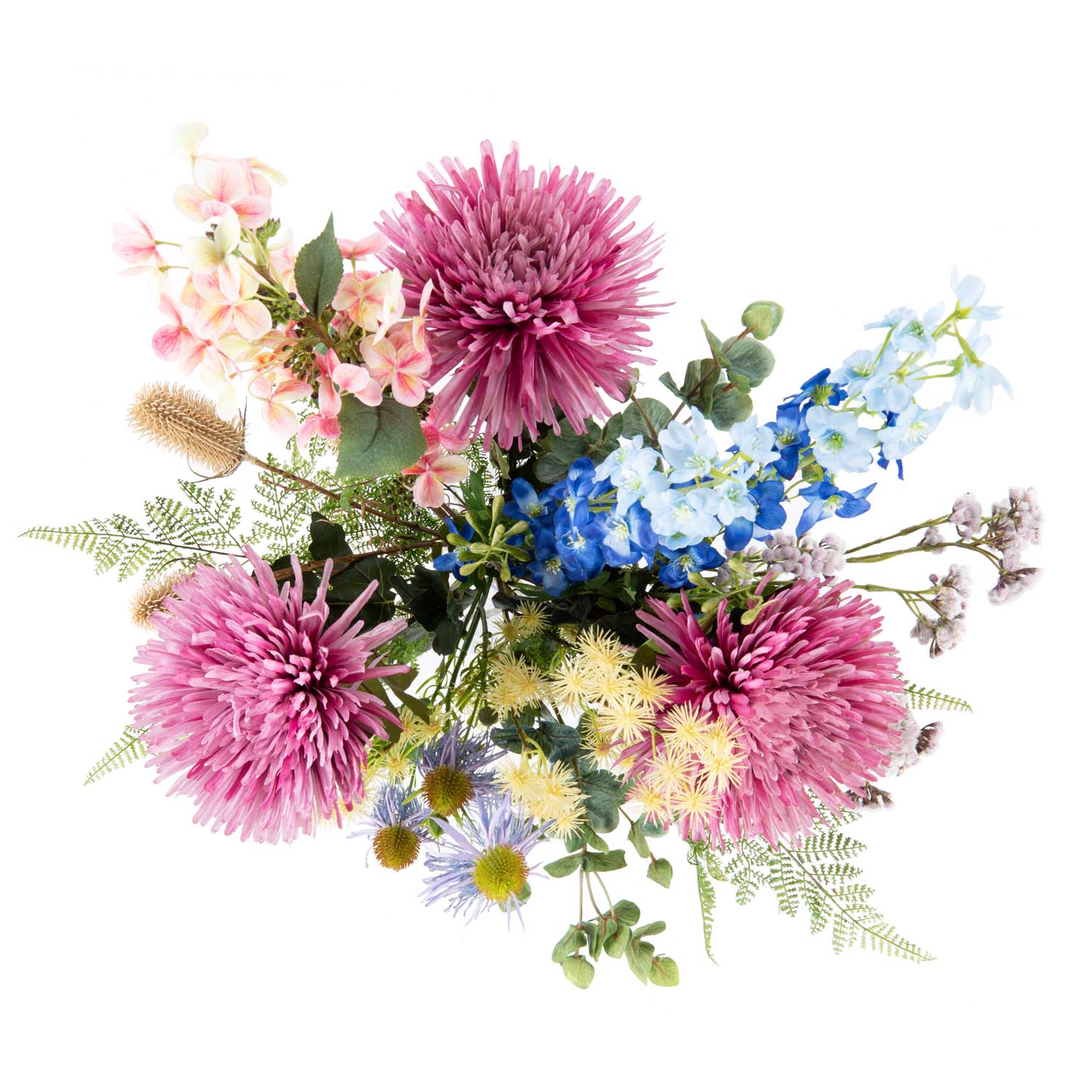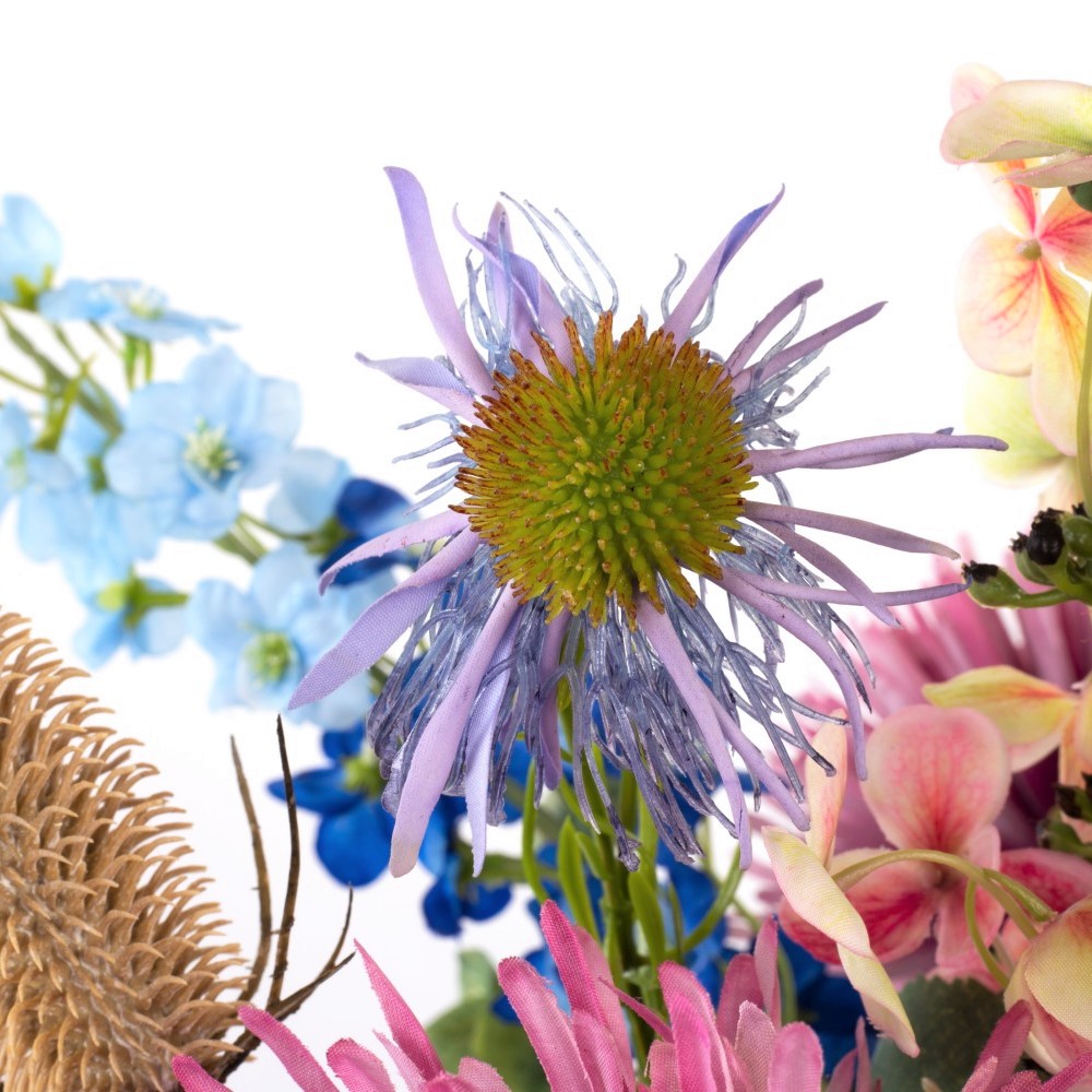 Este ramo de flores artificiales LOLANA es una encantadora forma de dar la bienvenida al verano. Junto al exuberante crisantemo, la juguetona echinacea y el simpático cardo silvestre, el delphinium y la hortensia destacan en el conjunto floral.