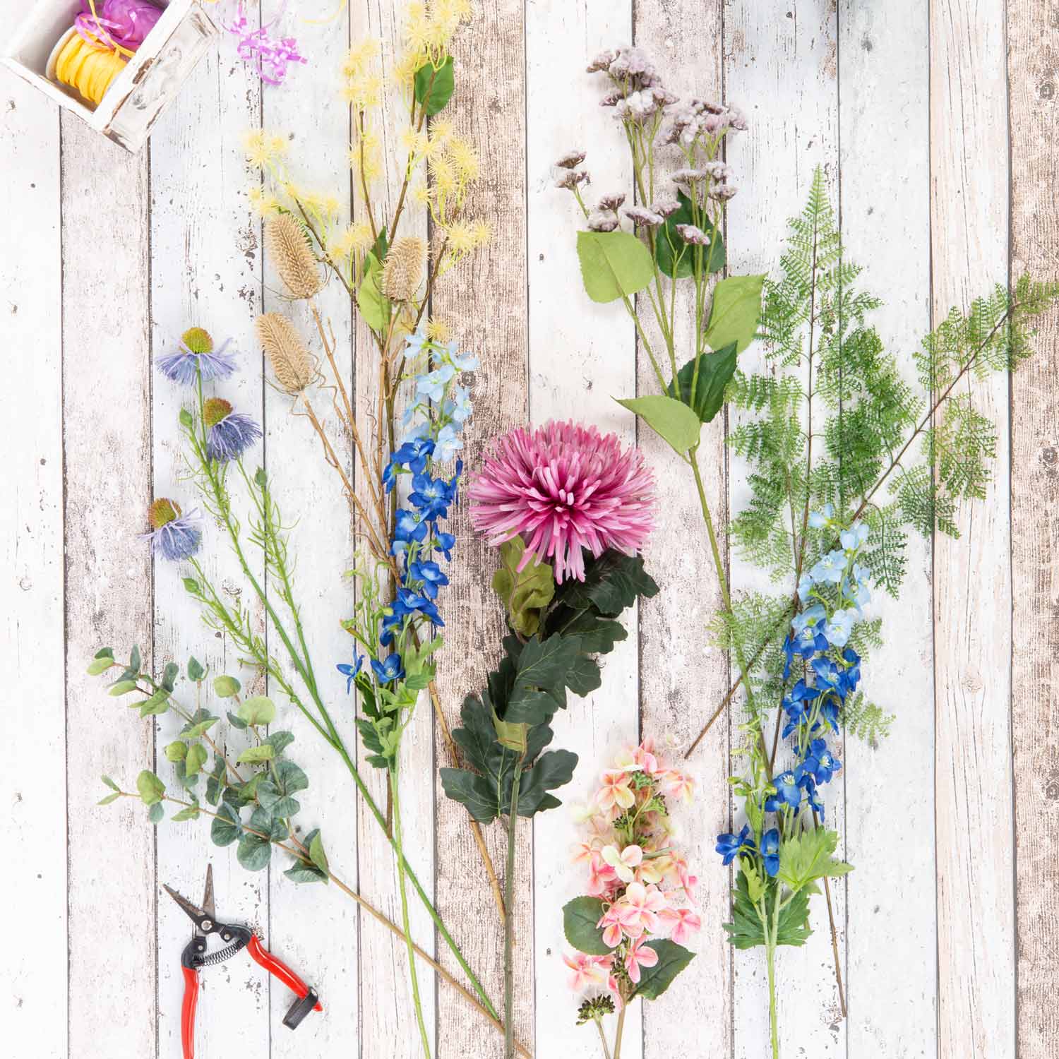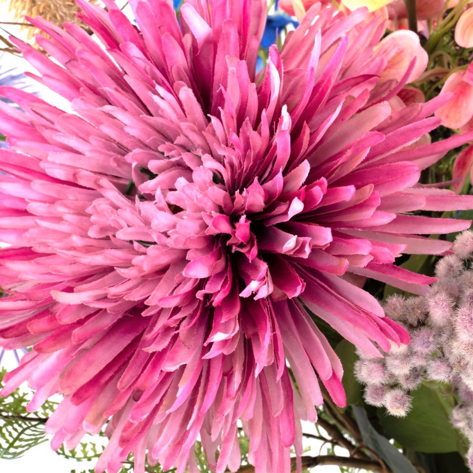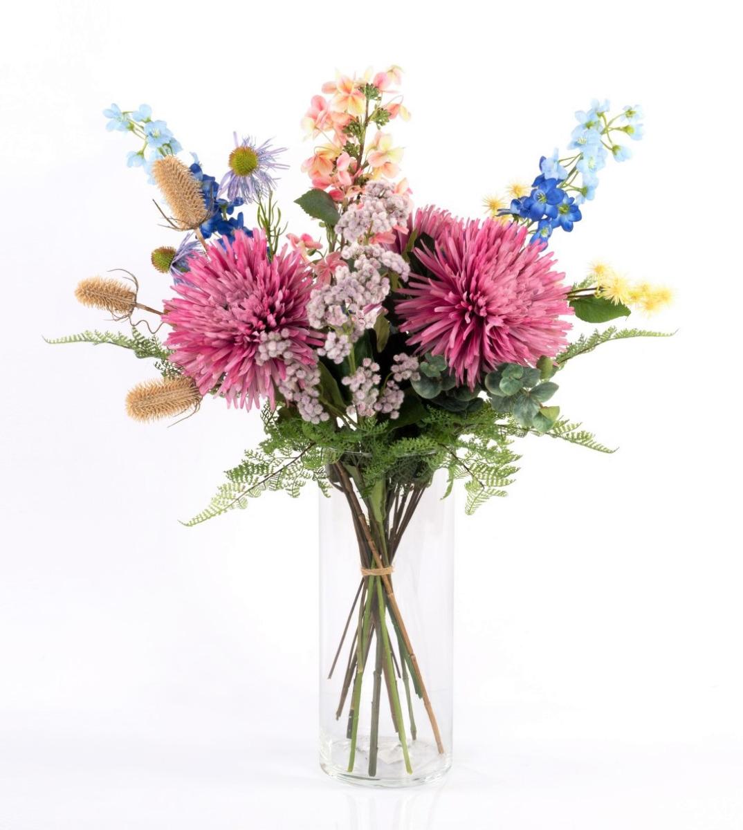 Este ramo de flores artificiales LOLANA es una encantadora forma de dar la bienvenida al verano. Junto al exuberante crisantemo, la juguetona echinacea y el simpático cardo silvestre, el delphinium y la hortensia destacan en el conjunto floral.