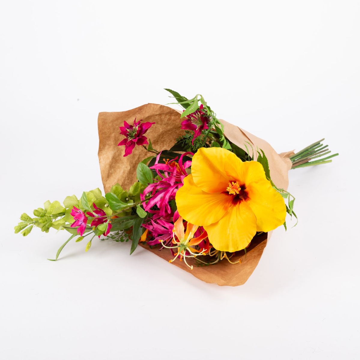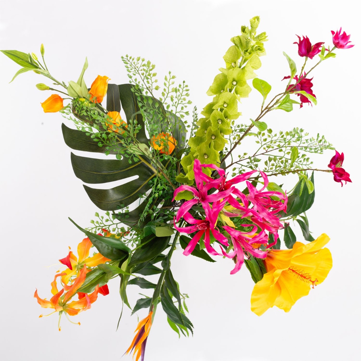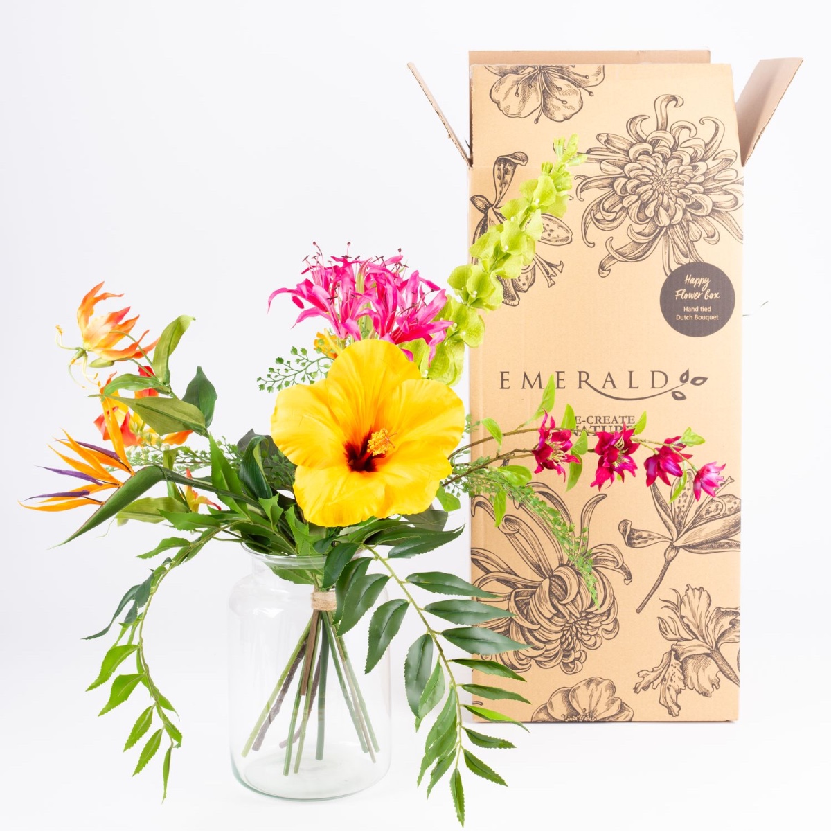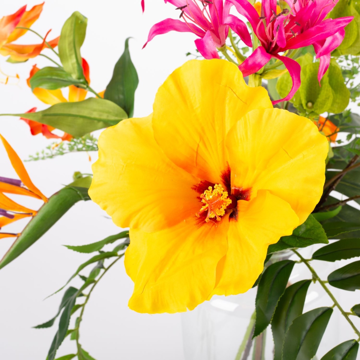 Exótico y colorido. ¡Julio es un mes caluroso! ¿Y qué mejor que un ramo con flores de las zonas tropicales y subtropicales del mundo? La brillante flor de hibisco amarillo anaranjado es el centro de atención de este ramo, enmarcada por una strelitzia, una gloriosa, un amarilis de jardín y otras plantas de aspecto tropical. Este ramo te pondrá de buen humor nada más verlo.