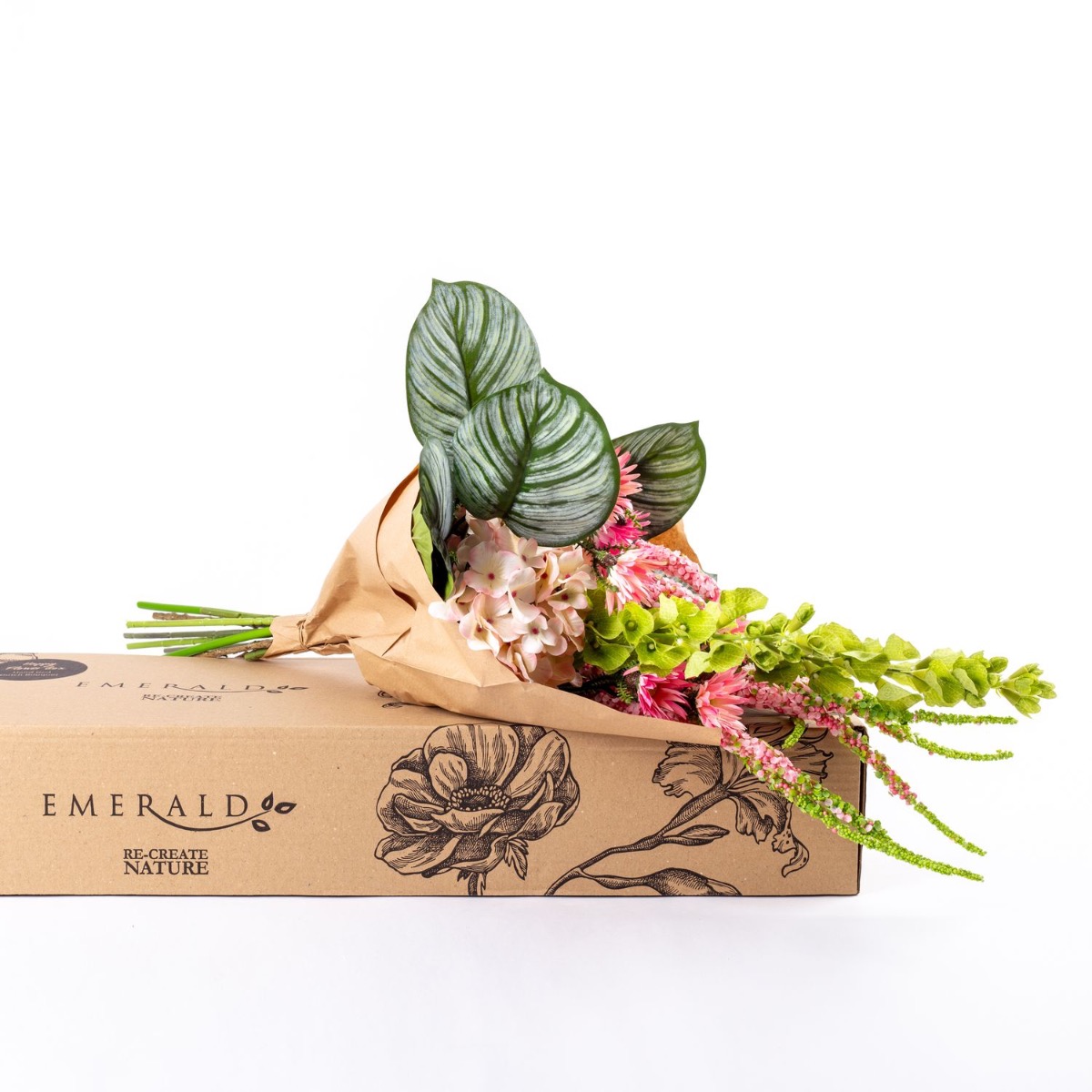 Un moderno ramo de verano PRIJA con flores de todo el mundo que, con su intenso color rosa y las hojas de calathea que lo enmarcan, iluminará cualquier estancia. La rama de amaranto parece una cascada y realza la exuberante hortensia. ¡A quien le gustan las flores, le encantará este ramo! Ya sea como regalo o simplemente para darse un capricho. ¡Este ramo atado a mano combina con cualquier decoración!