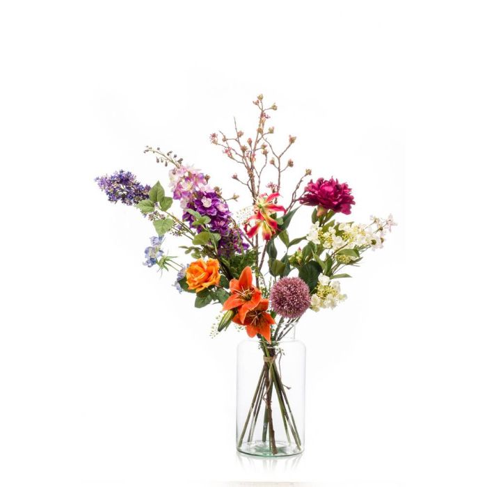 El arreglo floral artificial ligado a mano FEME combina muchas flores de verano diferentes en un juego armonioso. Los coloridos tonos de los arreglos florales artificiales crean un buen ambiente y embellecen la decoración de verano.