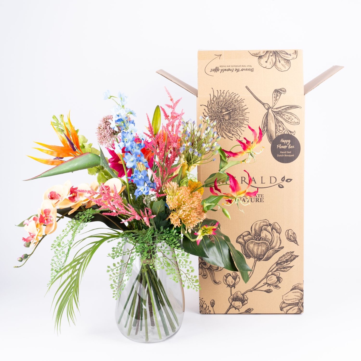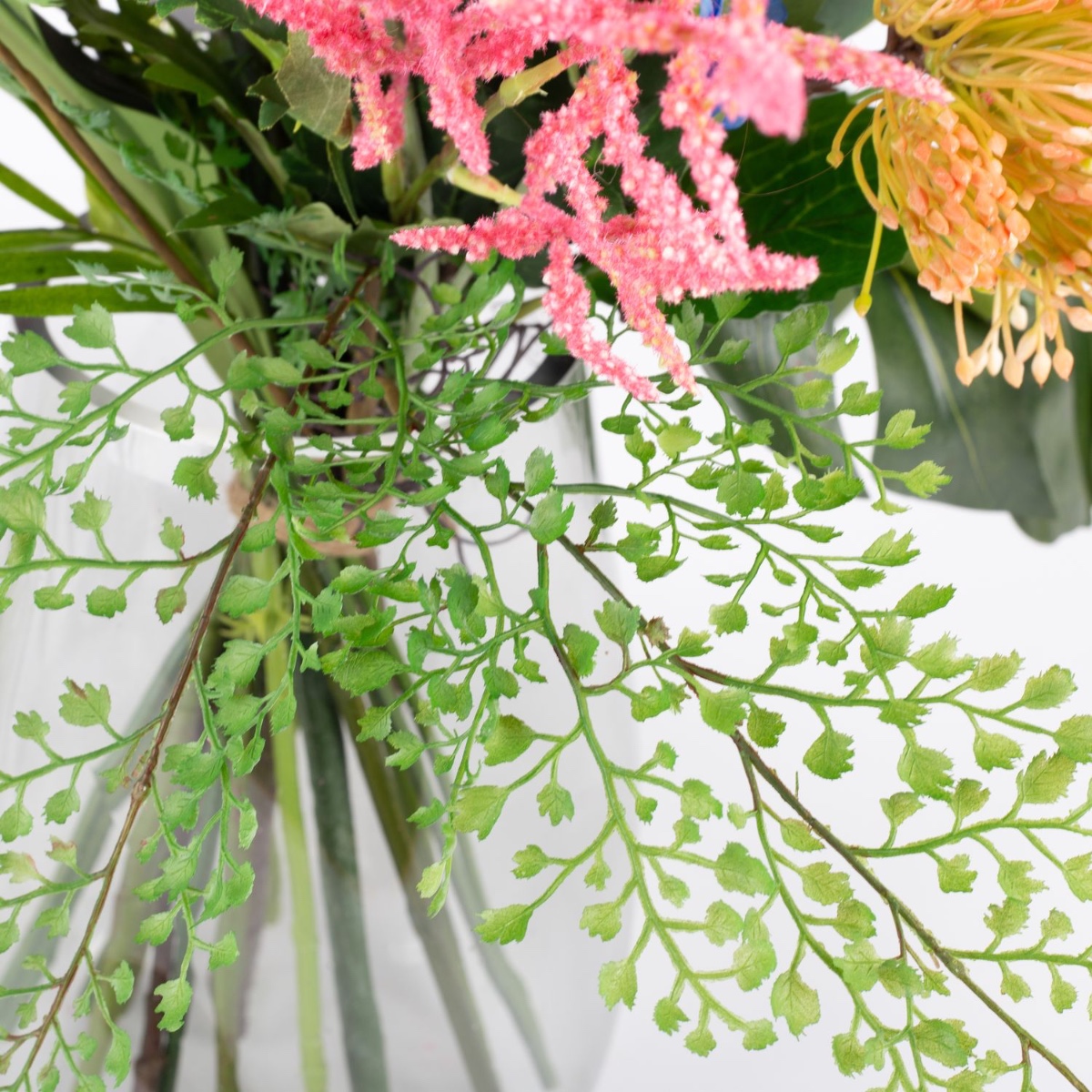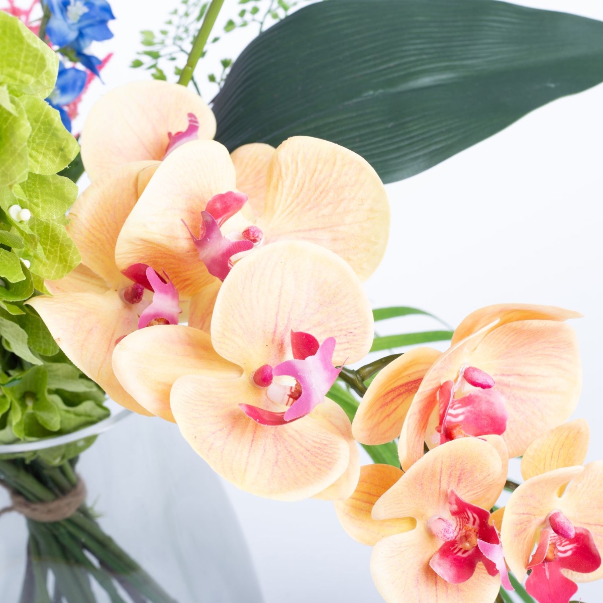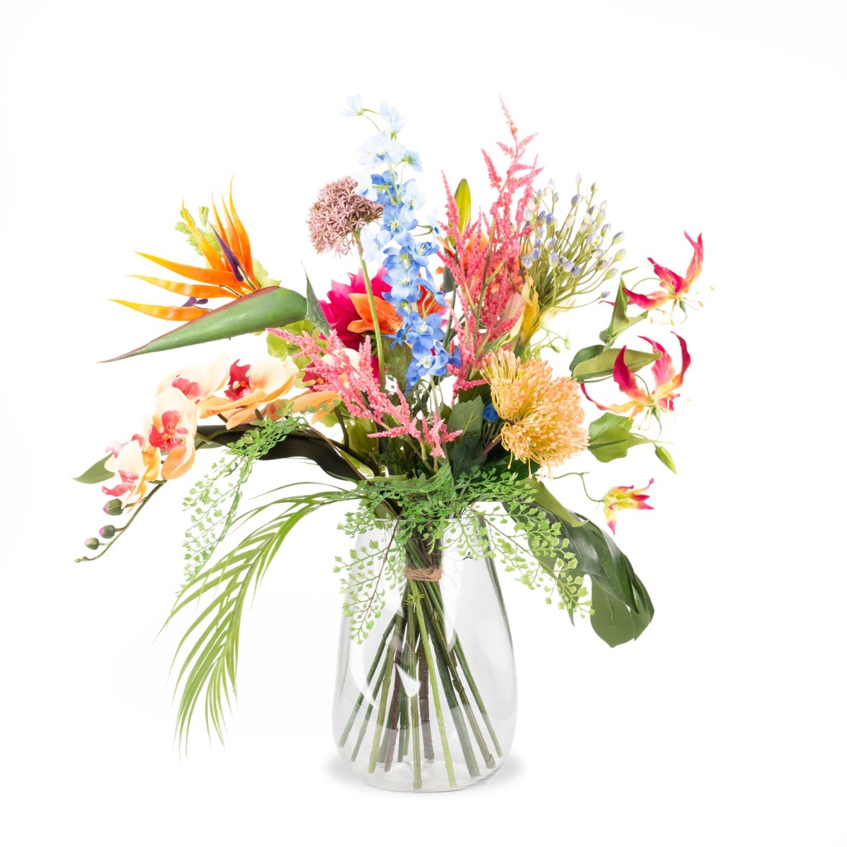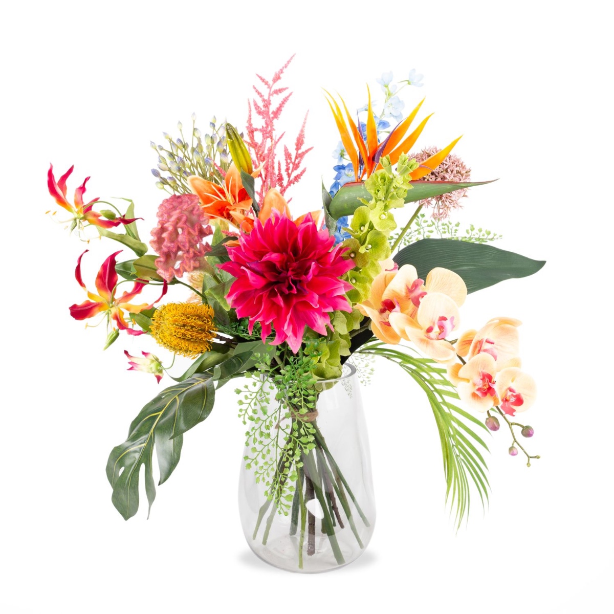 El exótico y artificial ramo de flores FEME es realmente llamativo con sus fuertes colores. La combinación creativa de flores atrae todas las miradas hacia el exuberante arreglo floral artificial.