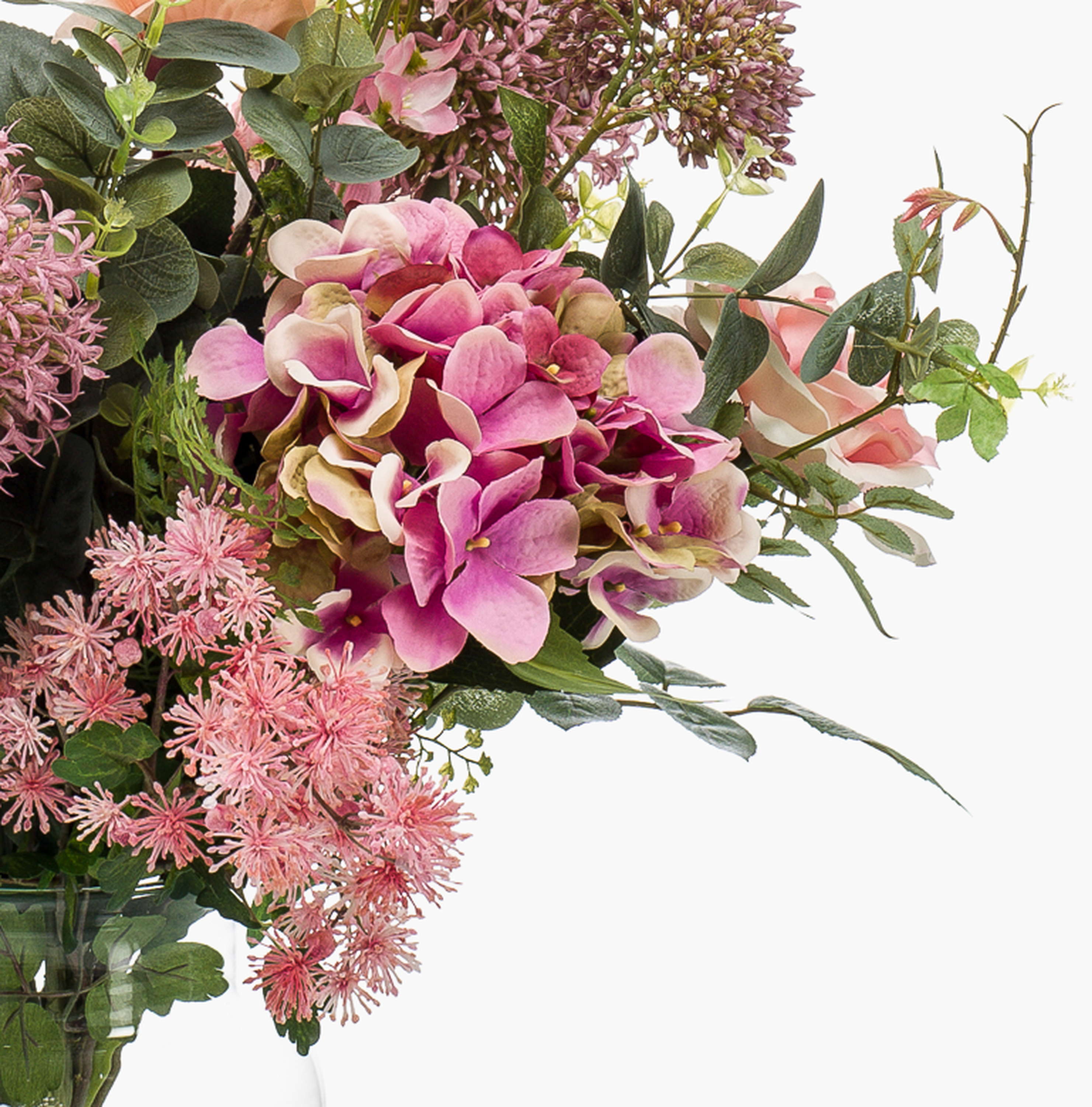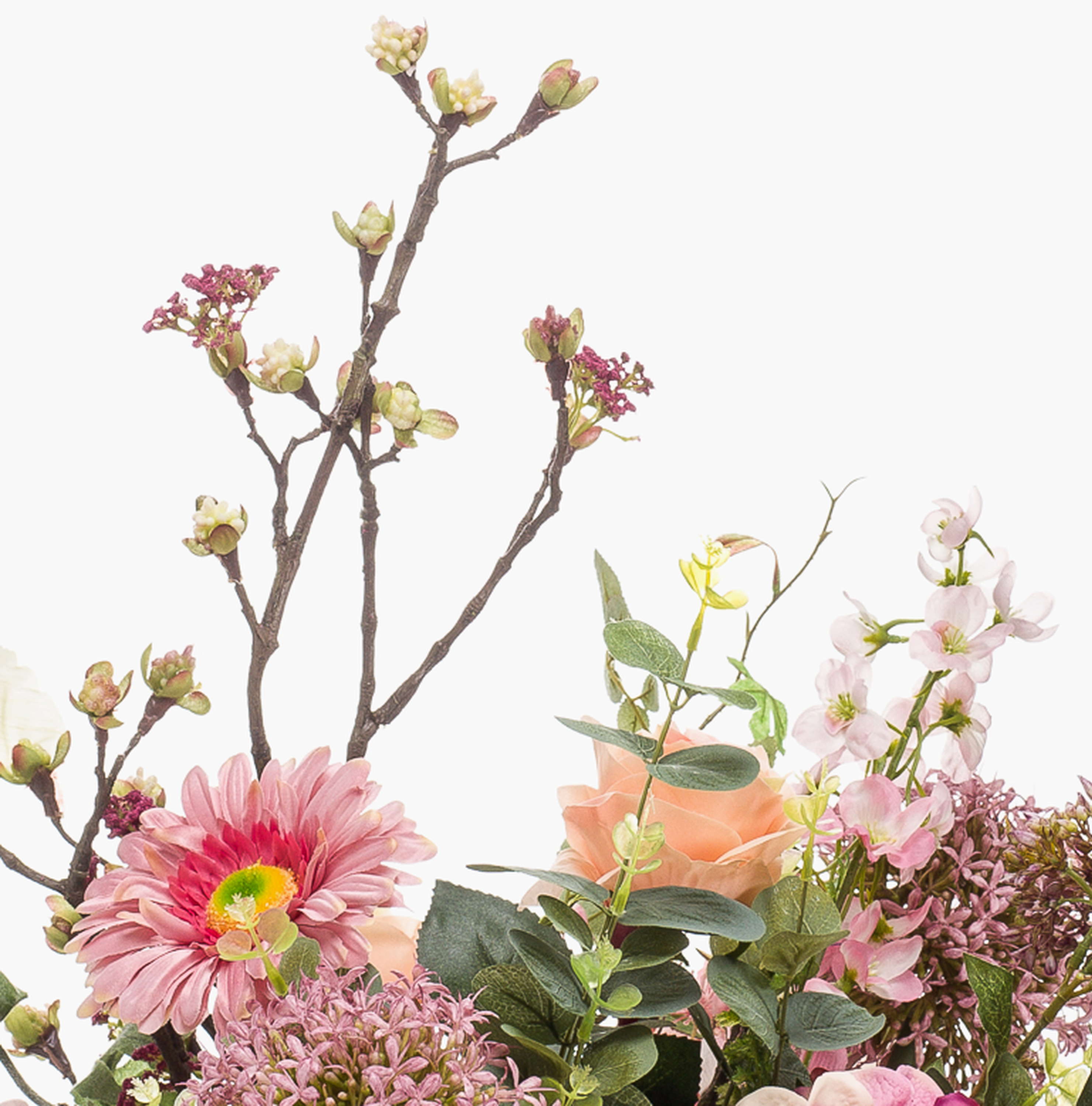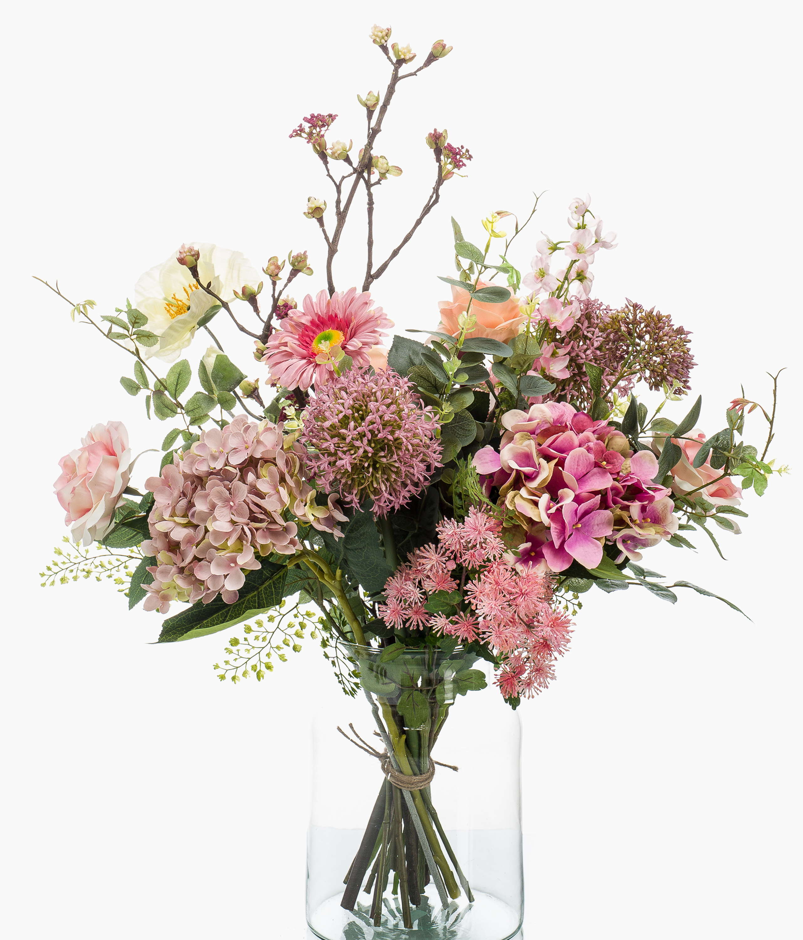 El exuberante y artificial ramo de flores FEME está atado a mano con cuidado. No son sólo los colores rosas los que hacen del conjunto de flores una decoración especial, sino que además la combinación armoniosa de una gran variedad de flores hace que la decoración brille.