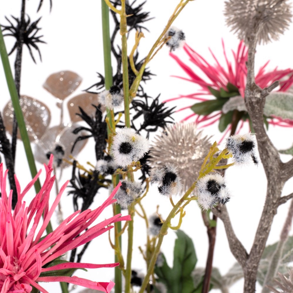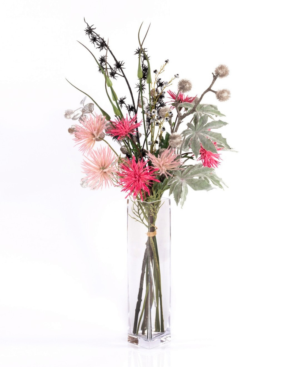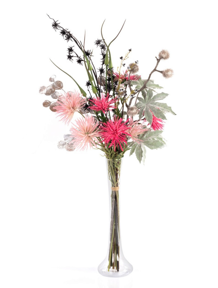 KAAMI significa "felicidad" en hawaiano, un nombre absolutamente apropiado para nuestro ramillete artificial de Nochevieja. La interacción de las flores sintéticas crea un espectáculo único. Los ajos ornamentales se elevan en el aire como cohetes, los crisantemos en rosa y fucsia crean una llamarada y el hamamelis una lluvia de cometas. El espectáculo del conjunto floral está enmarcado de forma elegante y festiva con papel de plata brillante y esponjosas hojas de stirlingia y papaya.