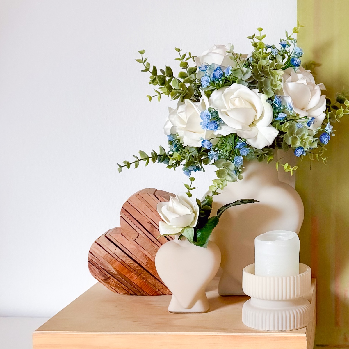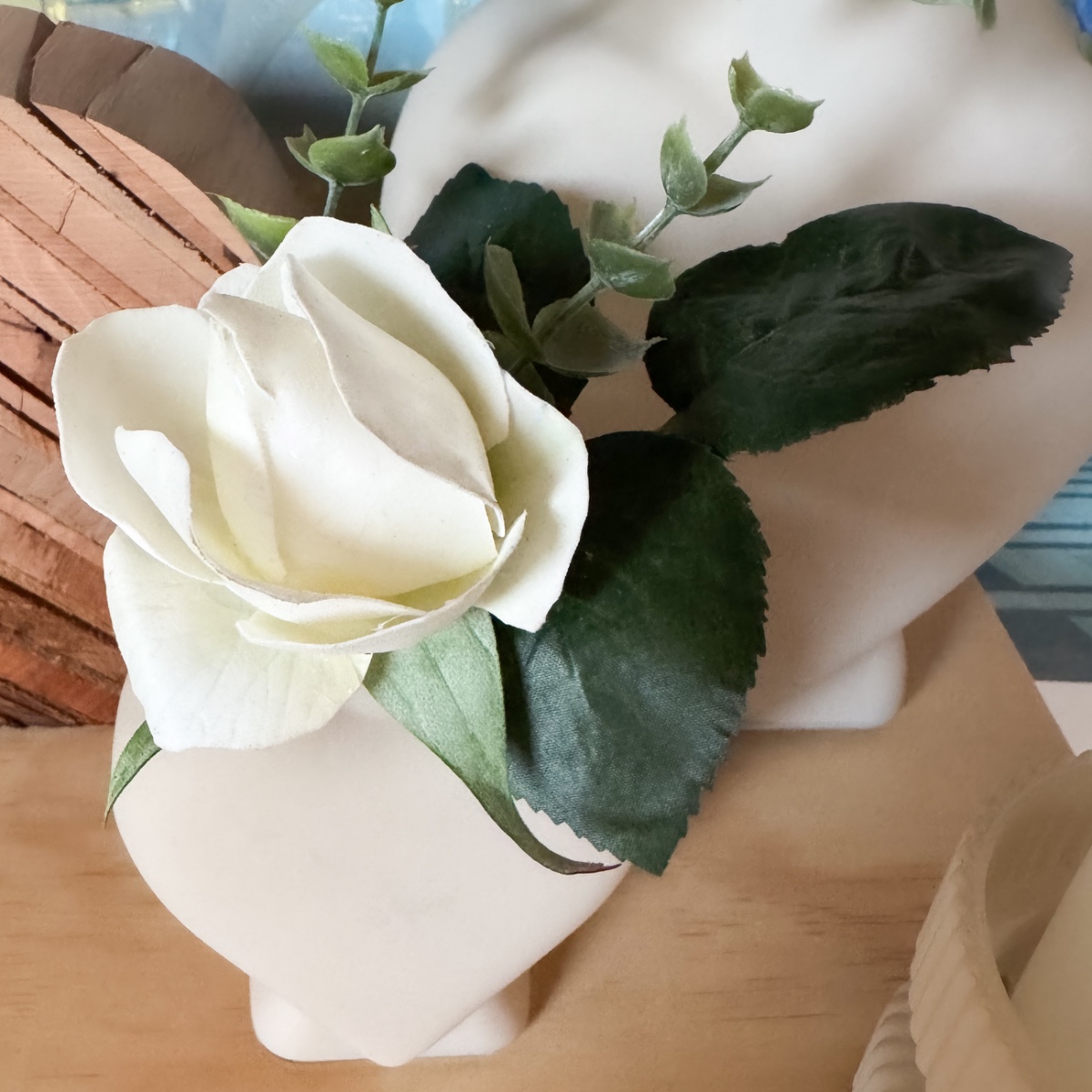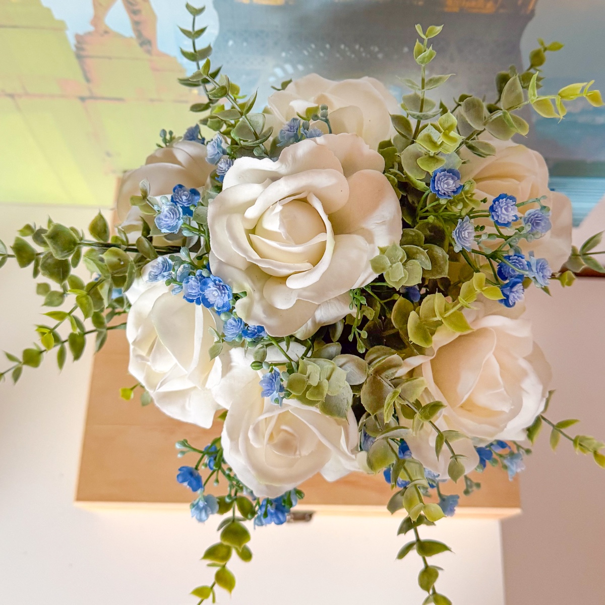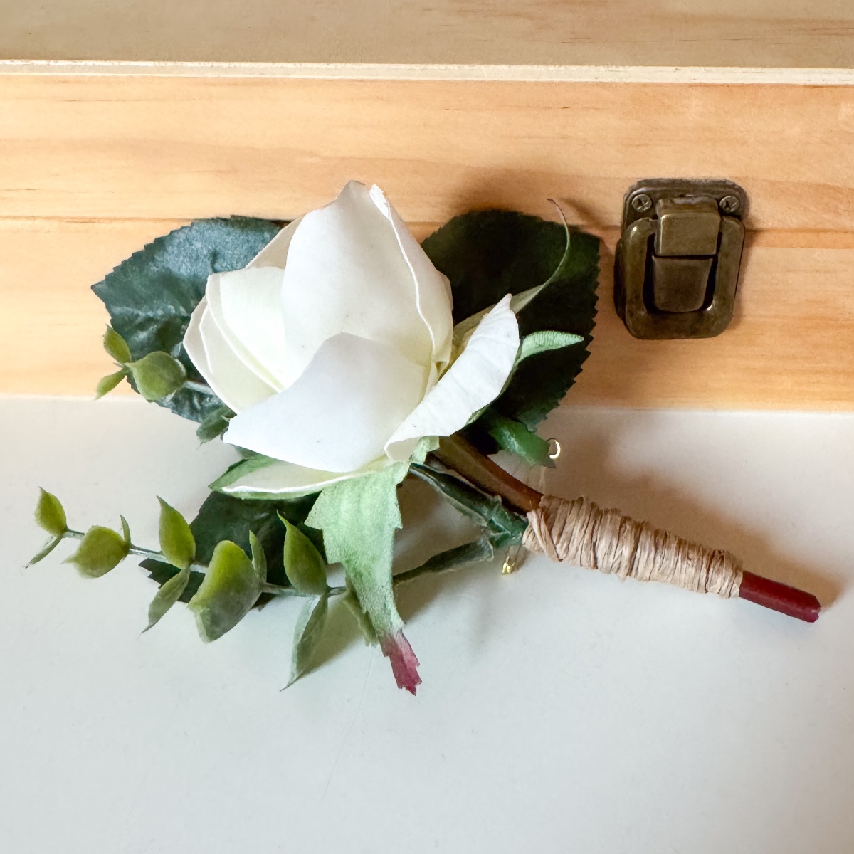 ¡Flores que conservan el amor para siempre! Para Andy y Janine hemos creado un ramo para su gran día. Las rosas de color crema irradian una belleza clásica, son especialmente realistas y casi parecen flores auténticas. La gypsophila aporta suaves toques de color azul claro, mientras que el eucalipto resalta la frescura natural. A juego, hemos creado un elegante alfiler para el novio que completa armoniosamente el look. Ya sea para las fotos, para el camino hacia el altar o como recuerdo para toda la vida, este ramo de novia captura con cariño los momentos más bonitos. ¡Compra el look!