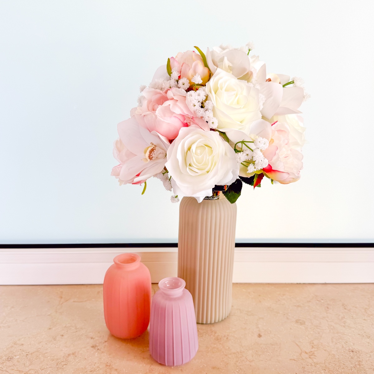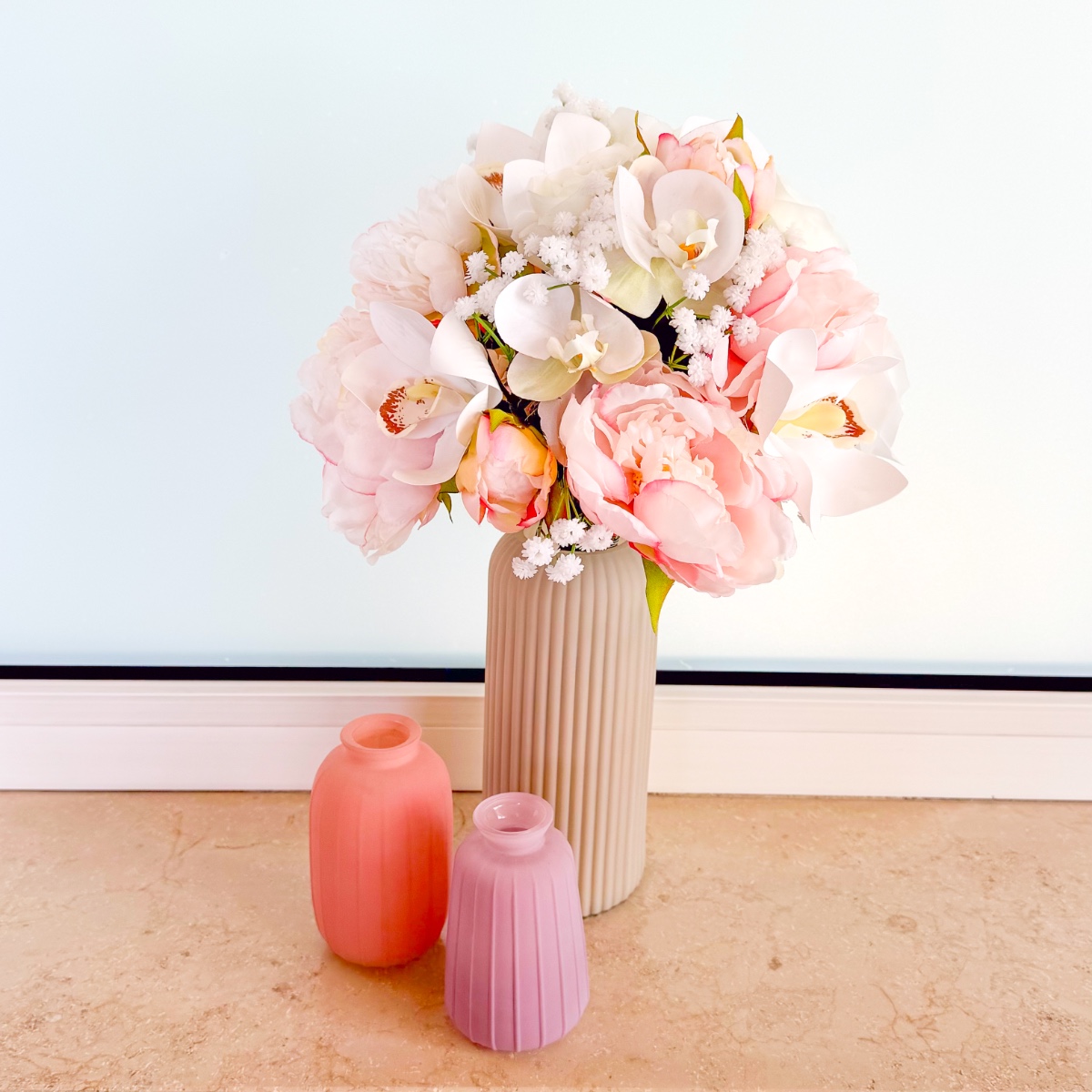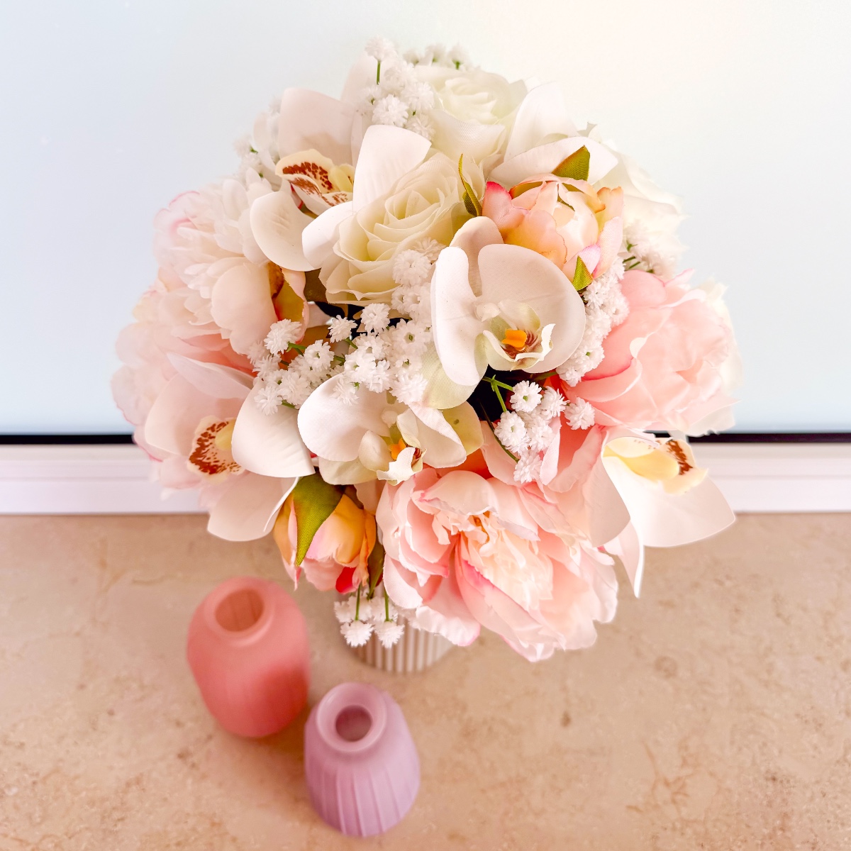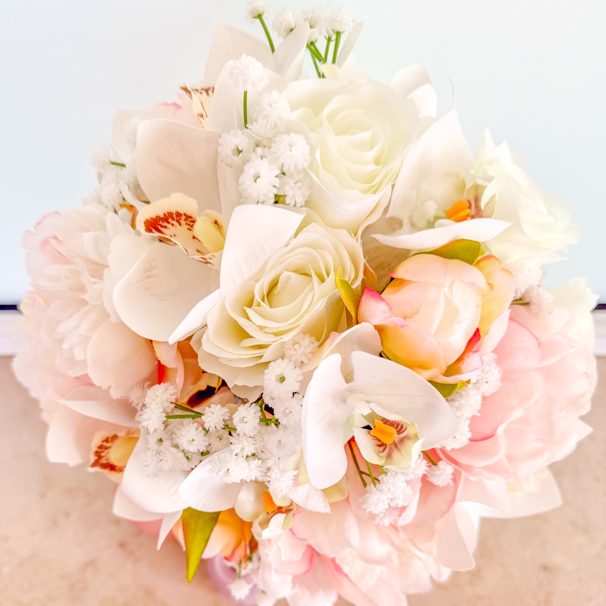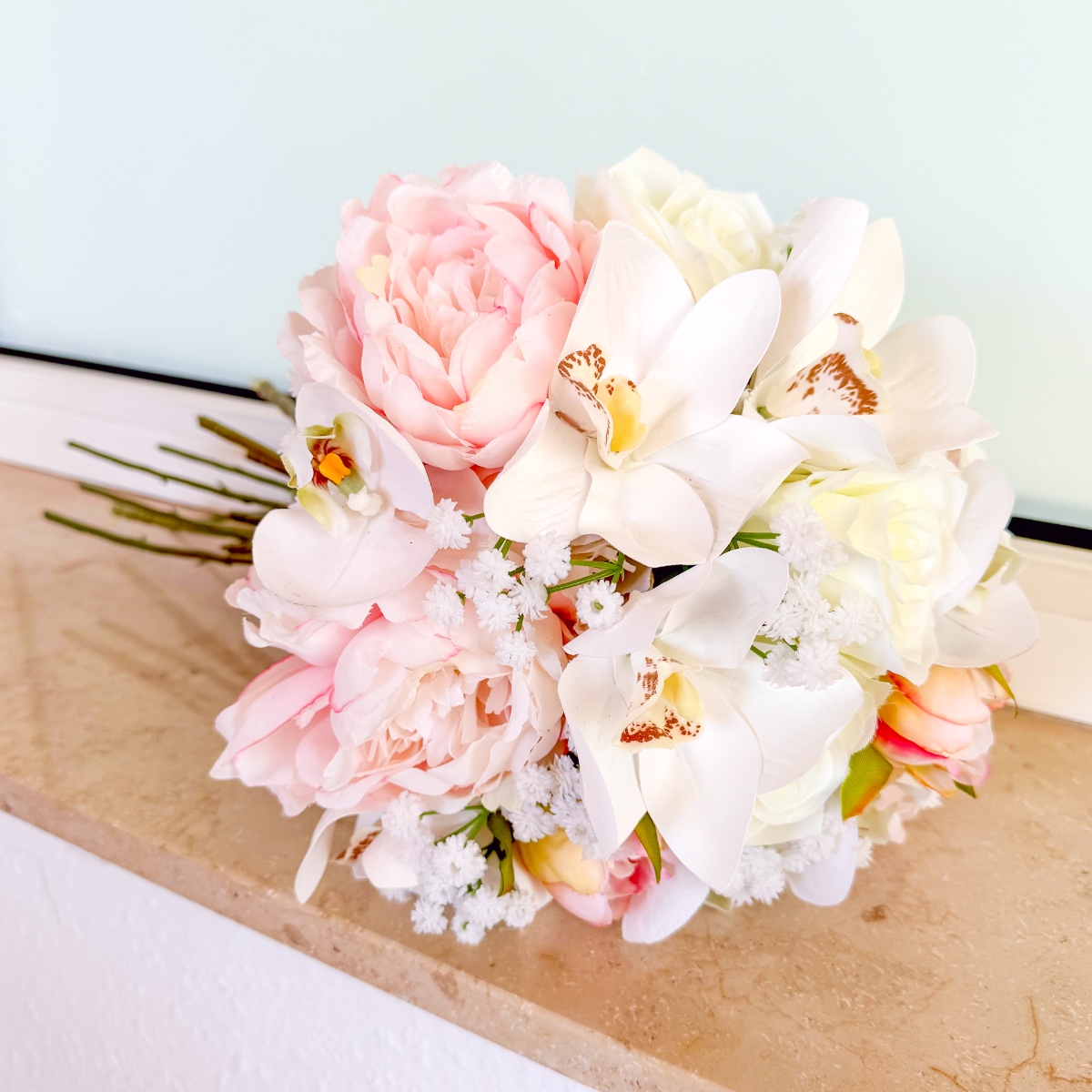 Flor de elegancia: ¡el ramo de tus sueños para ese día tan especial! Un ramo de novia elegante que combina la elegancia atemporal con la delicadeza romántica. Las magníficas orquídeas blancas Cymbidium y Phalaenopsis forman el corazón de esta creación y le dan al ramo un aire exclusivo y lujoso. Las delicadas peonías rosas añaden un toque juguetón, mientras que las clásicas rosas blancas simbolizan la pureza. La delicada gypsophila completa el arreglo y aporta ligereza y armonía. ¡Déjate encantar por este ramo de novia y haz que tu día sea inolvidable! ¡Compra el look!