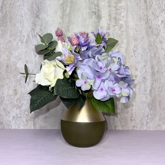 ¡El amor florece para siempre! Mientras navegaba por nuestra tienda online, nuestra clienta habitual Monika se topó con el proyecto de un antiguo cliente de ramo de novia. Se preguntó si sería posible recrear su propio ramo de novia y nos escribió un mensaje. El ramo debe ser una sorpresa inolvidable para su esposa, que le recuerde el día de su boda. Una hermosa declaración de amor, pensamos. Una exuberante hortensia con delicadas rosas violetas y crema llenan el ramo. Estos se complementaron con finas clemátides y follaje verde de ramas de manzano y eucalipto. Por primera vez también utilizamos flores secas, que aportaban un toque de color entre los pétalos de rosa. Nuestro cliente quedó muy contento con nuestra réplica de ramo de novia. ¿Quieres también un ramo de novia artificial para la eternidad? ¡Compra el look!