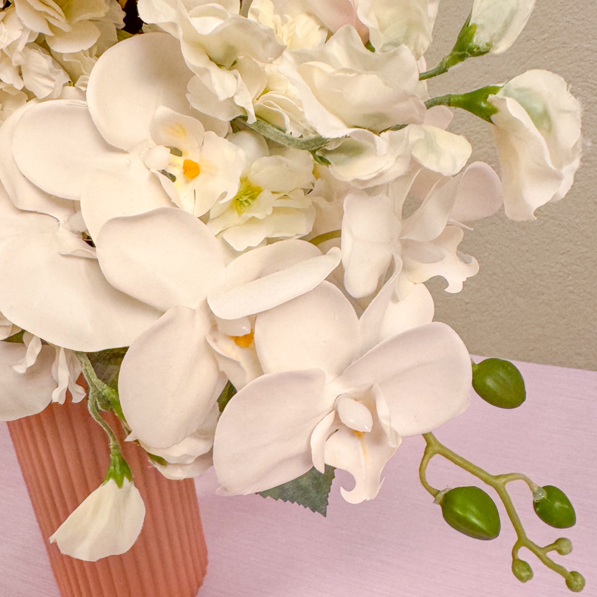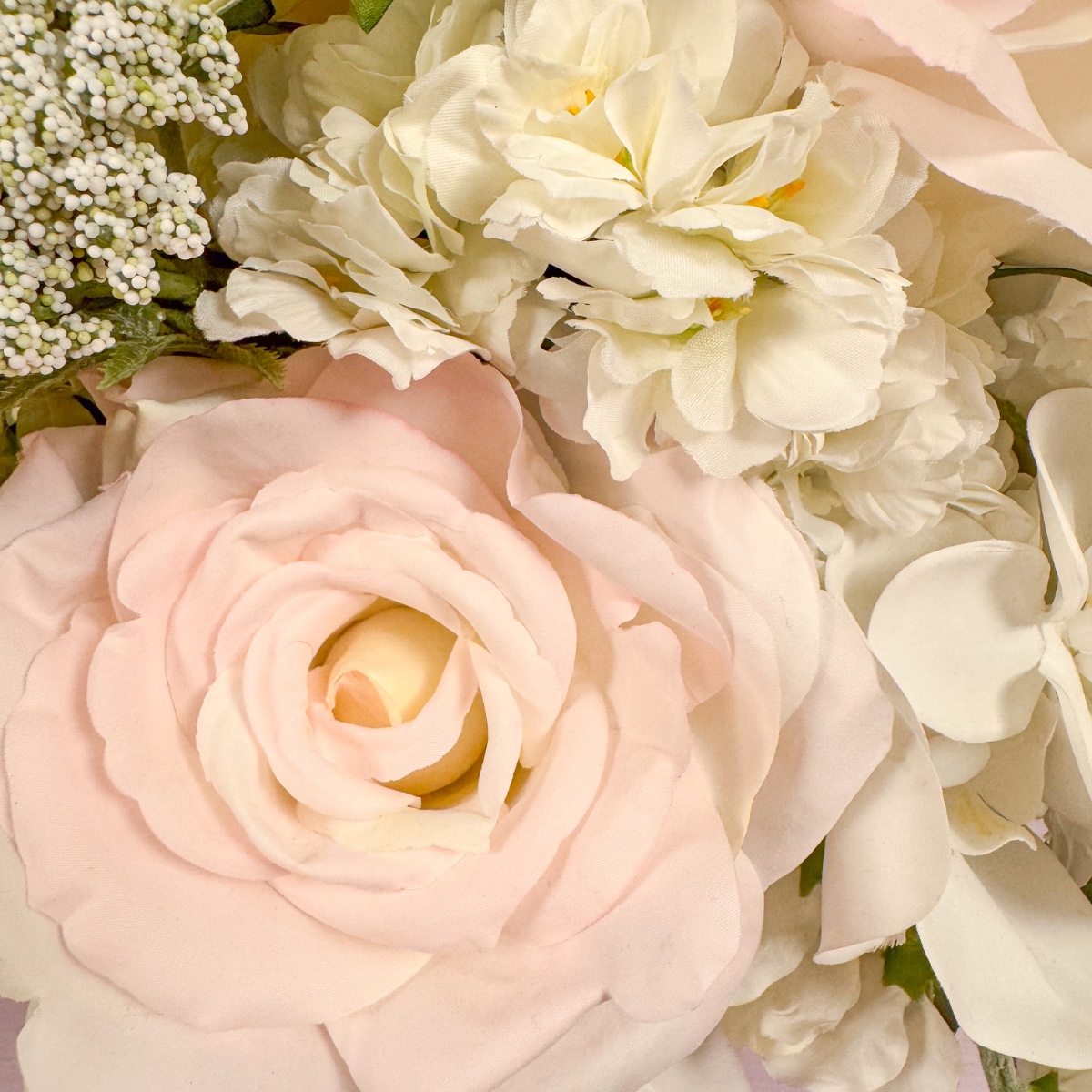 ¡Rosas y orquídeas! Para la boda de sus sueños, a Celine solo le faltaba el ramo de novia perfecto. Quería unas rosas exuberantes de color rosa pálido con un toque de exóticas orquídeas: románticas, elegantes y con ese algo especial. El resultado es una obra de arte floral que encaja a la perfección con su gran día. ¡Compra el look!