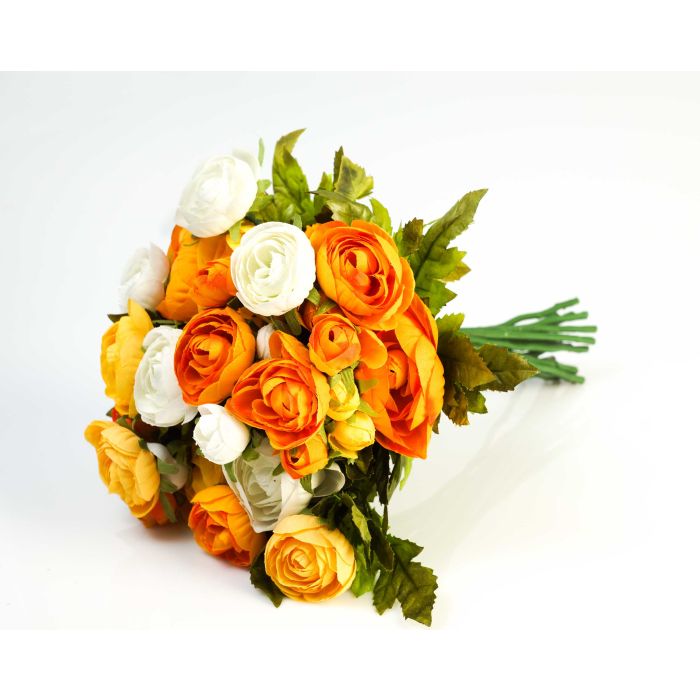 Hermoso arreglo floral de ranúnculos con cerca de 23 flores en amarillo, naranja y blanco. El ramo artificial de marimoñas mide aprox. 30 cm de alto y 25 cm de diámetro.