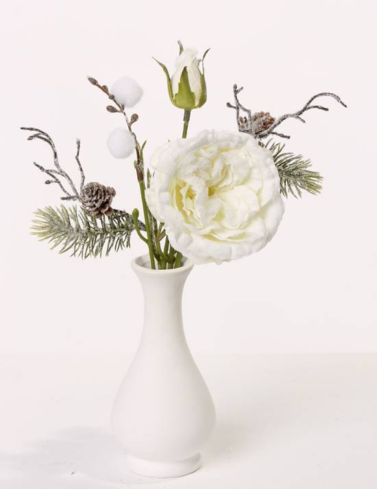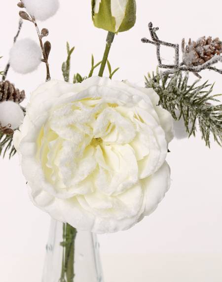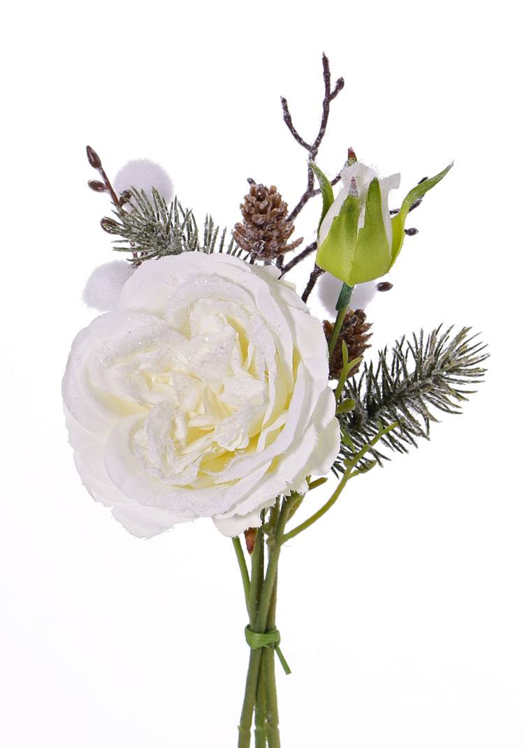 Ramo de rosas artificial FANNI, piñas, nevado, blanco, 30cm, Ø15cm