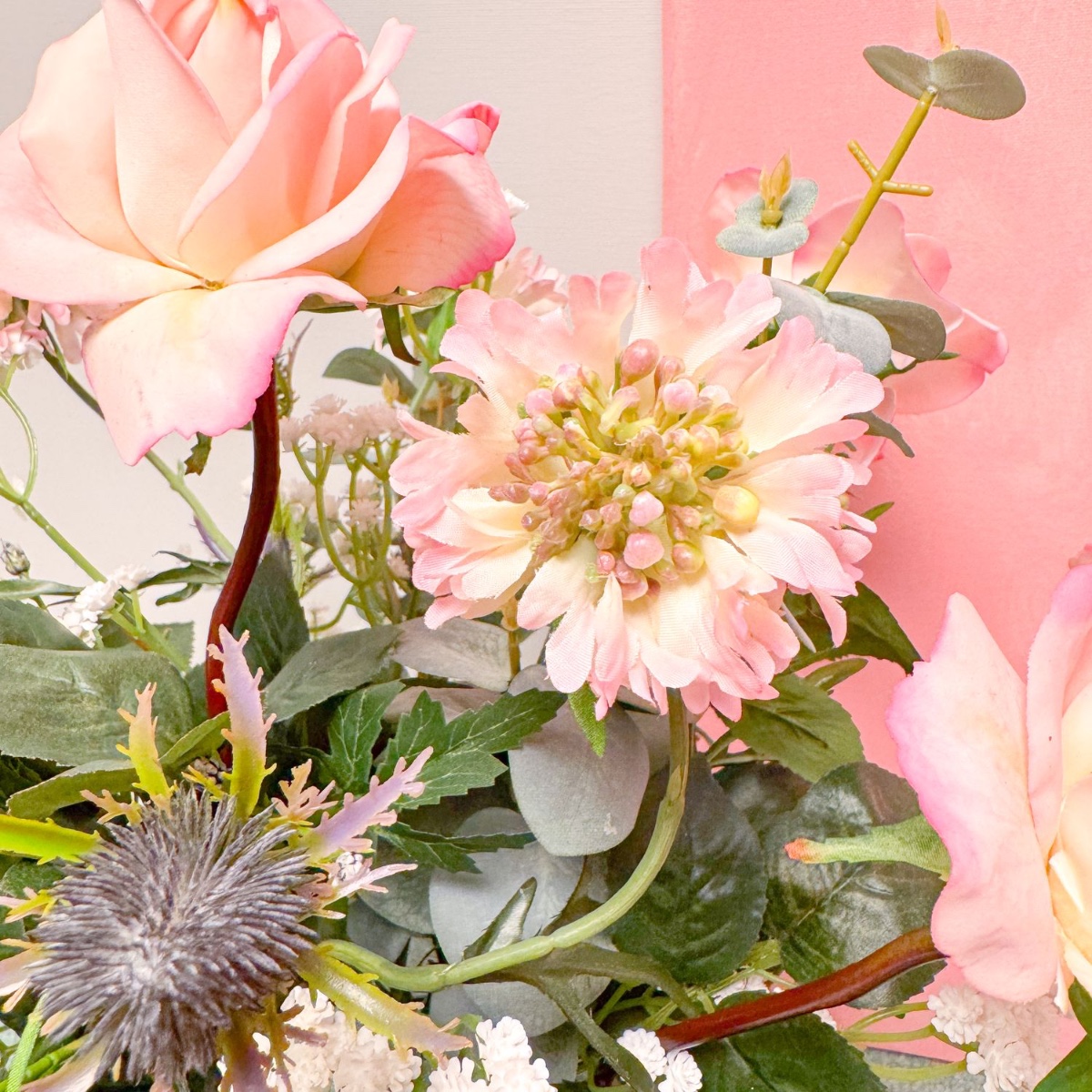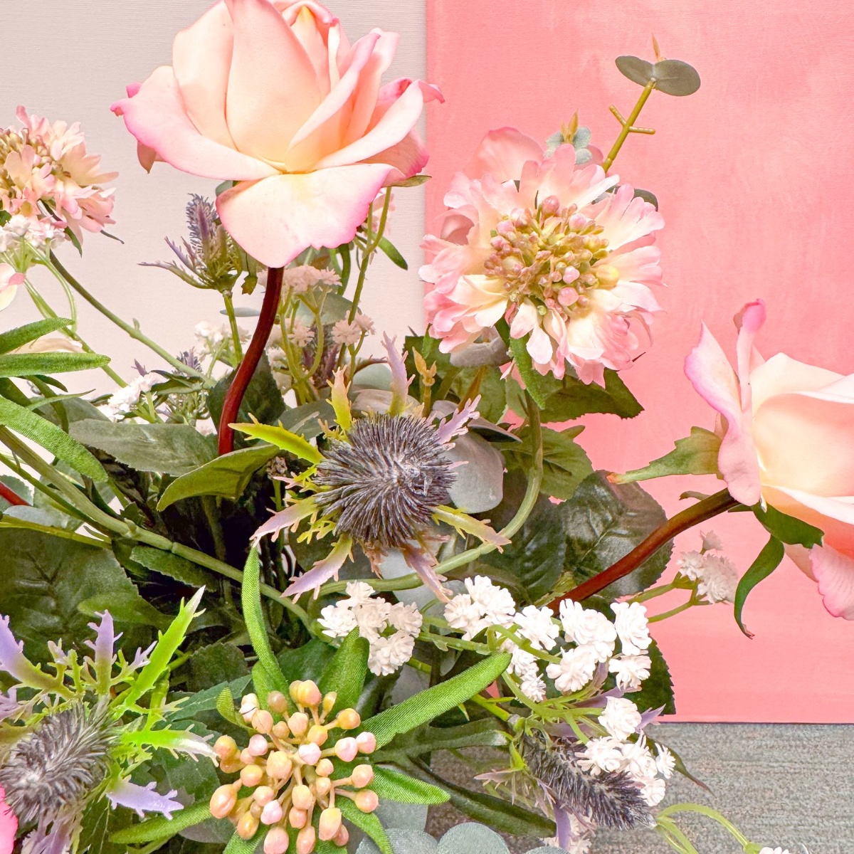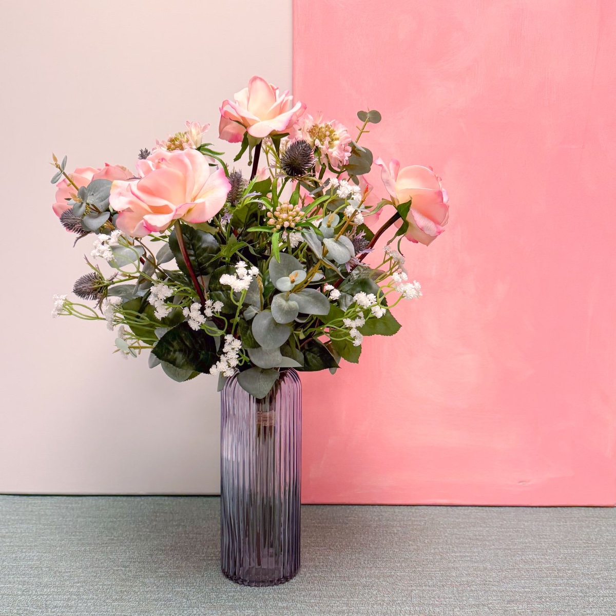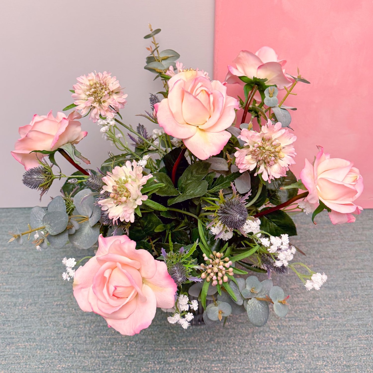 ¡Un ramo de flores encantador! Recibimos la segunda solicitud de Hanan. Quería un ramo de rosas romántico, ya que el ramo real estaba a punto de marchitarse. Como le había gustado tanto, nos pidió que le recreáramos el ramo. Las protagonistas eran unas rosas exuberantes con delicadas escabiosas y espinosos cardos, dispuestos entre delicadas ramitas de gypsophila y ramas de eucalipto. Un ramo precioso y aireado, en el que cada flor tiene su lugar. ¡Compra el look!