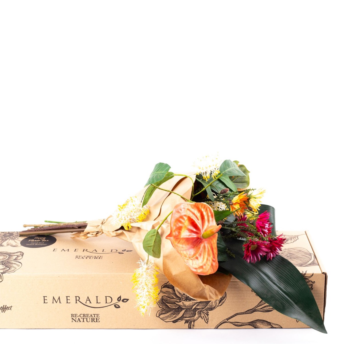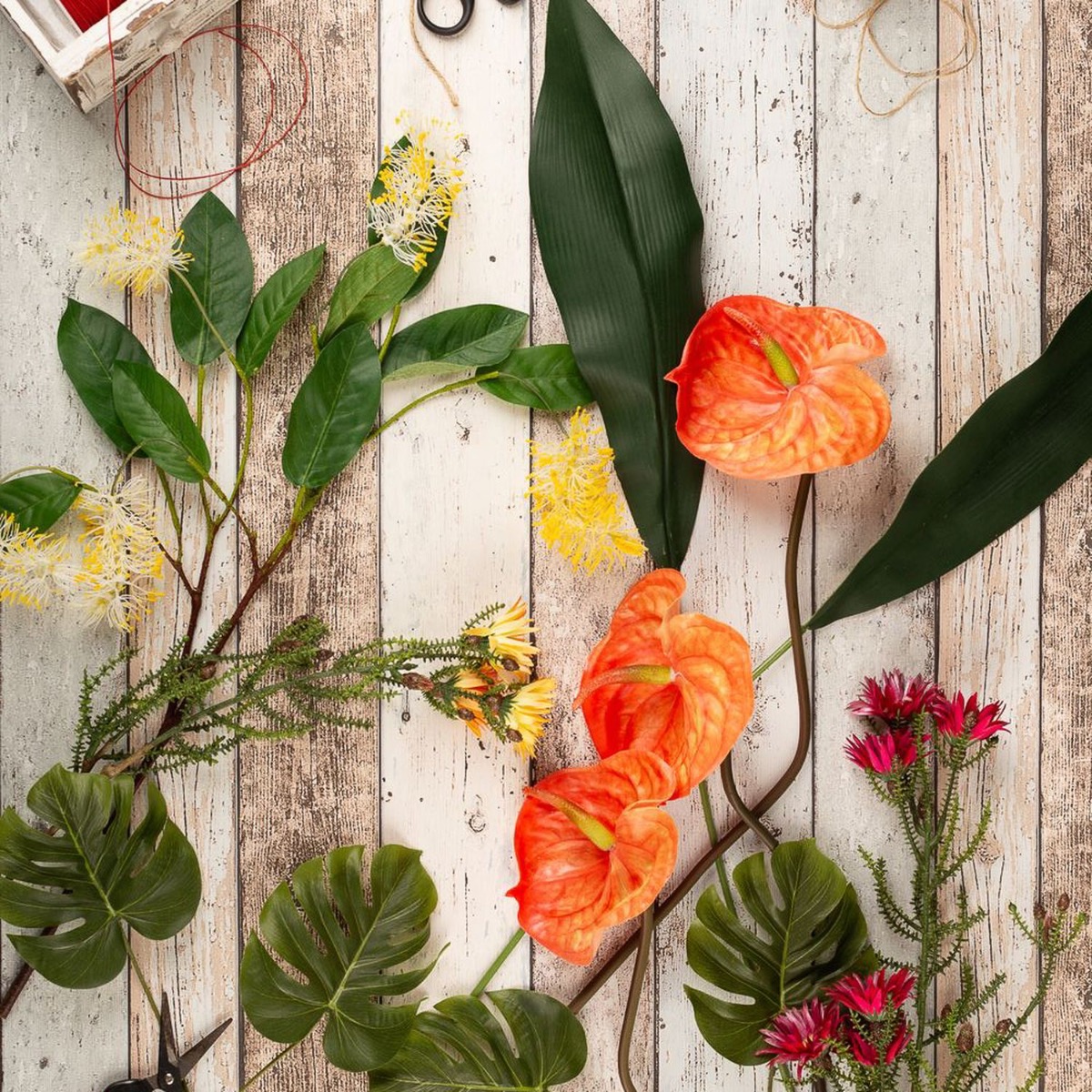 Este ramo AVALU encarna la verdadera alegría de vivir. Los colores amarillo, naranja y rosa representan la positividad, la alegría y la creatividad. Las extravagantes flores parecen haber sido recogidas directamente de la selva tropical australiana para este ramo. Las flores de paja del Cabo, las silverside australianas y las flores de flamingo rodean las hojas tropicales y aportan luminosidad a su hogar. ¡Este ramo es imprescindible!