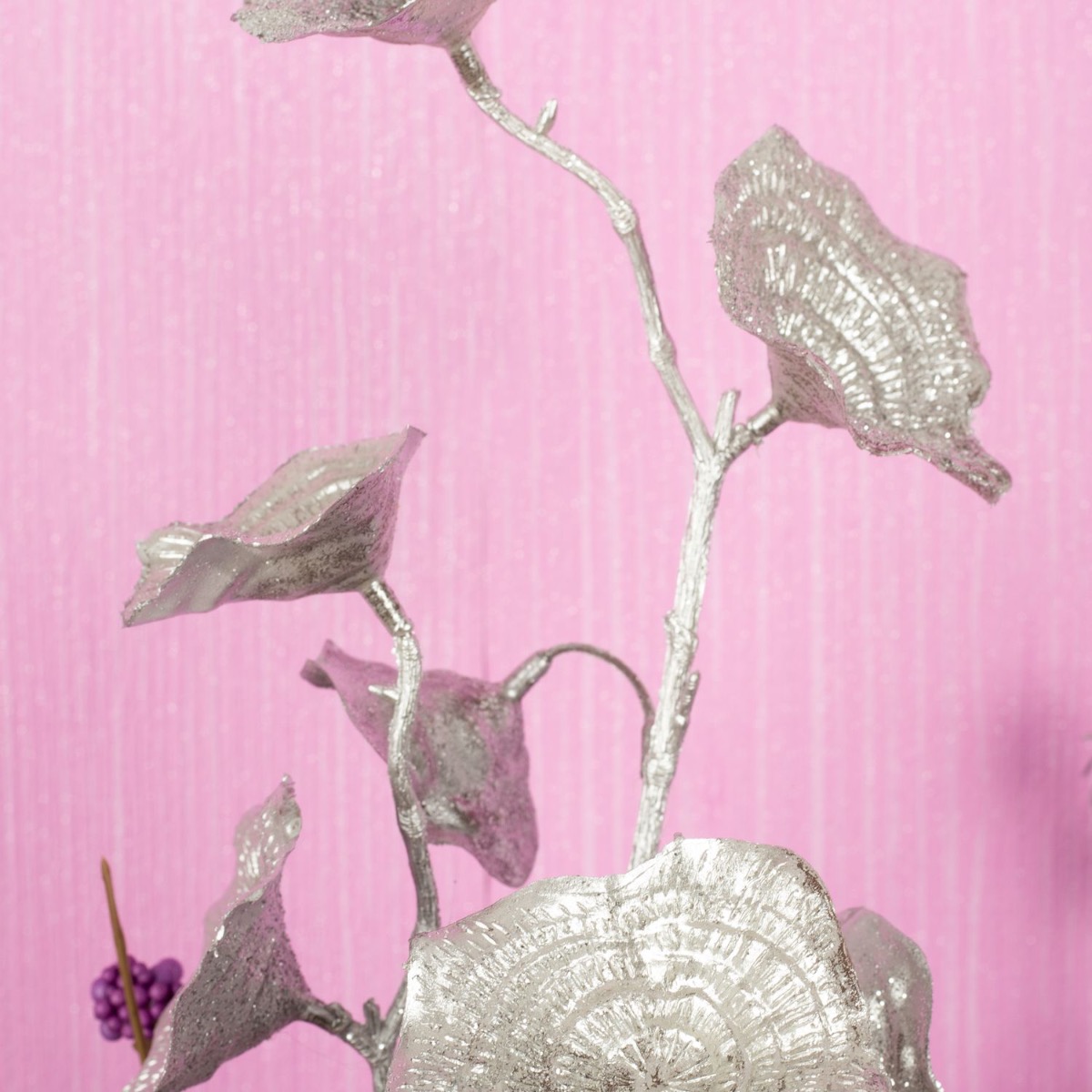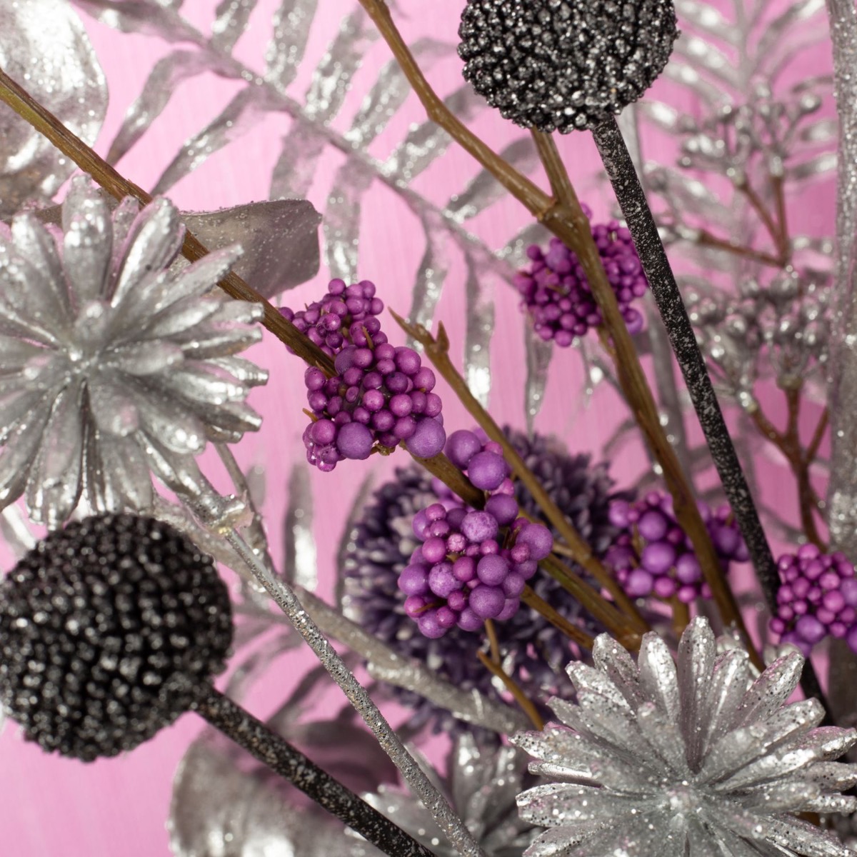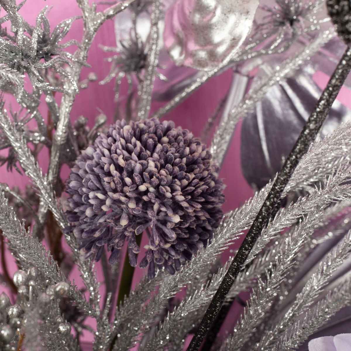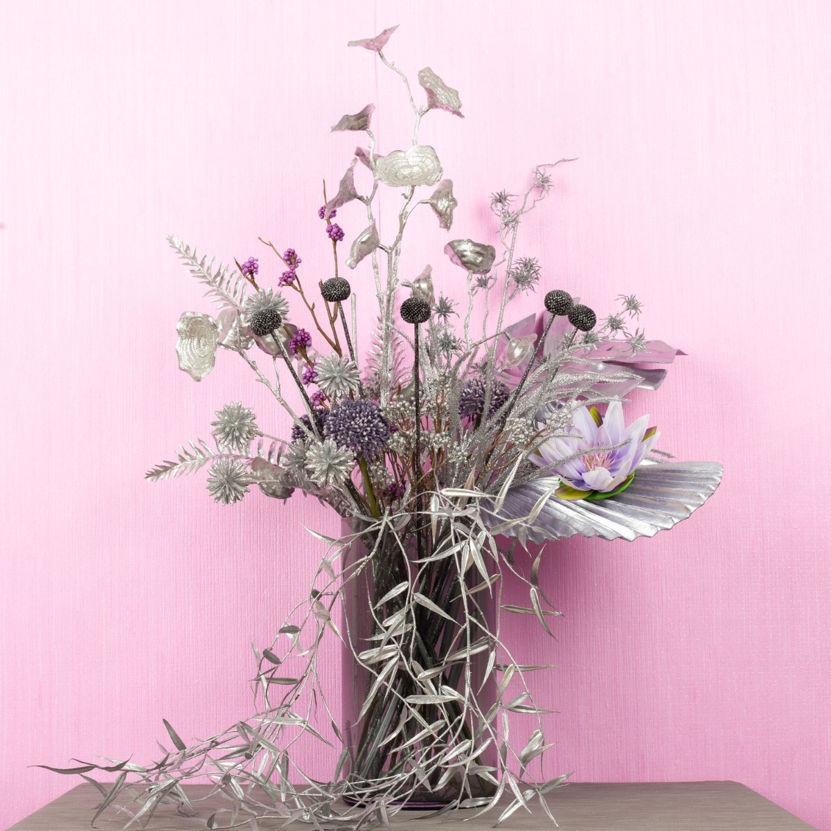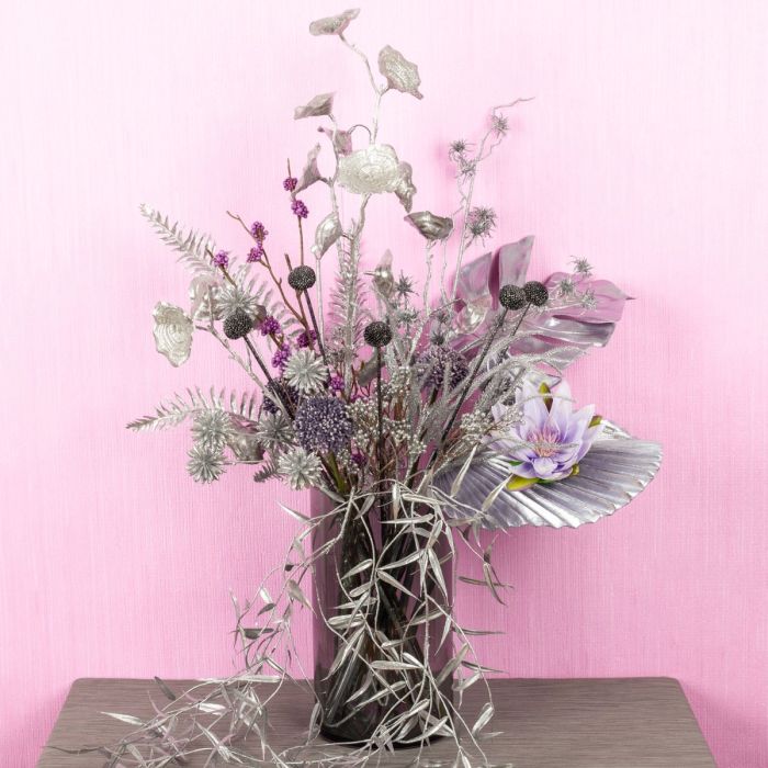¡Tonos plateados y delicados rosados! Un toque de glamour, un poco de sensación invernal, un poco de estilo tropical y un toque de oriente. Las chicas con verdadero glamour usarían esta receta para diseñar su ramo. Esta mezcla de plantas artificiales no deja atrás el sueño de ninguna niña y se adapta tanto a la temporada posterior a Navidad como al verano. Un look para todo el año que también brilla, ¿a qué niña no le gustaría? ¡Compra el look!