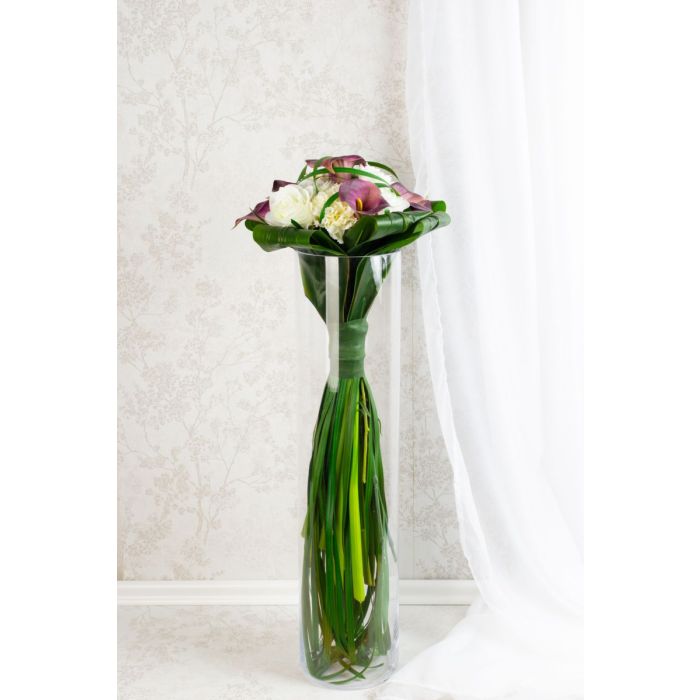 ¡El ramo de novia para la eternidad! Janine se puso en contacto con nosotros por teléfono. Nos habló de su ramo de novia y de su deseo de confeccionarlo con flores artificiales como recuerdo de su gran día. Nos envió una foto de su extravagante ramo de cetro. Como es típico de este tipo de ramo, se presentó con tallos llamativamente largos y briznas de hierba, que forman un cetro a través de una cinta ancha y apretada. La elección de las flores utilizadas fue de calas nobles, rosas clásicas y claveles blancos en señal de fidelidad. Unas hojas de lirio envueltas en un club proporcionaban un marco. Pudimos seleccionar las flores decorativas tal y como se describen. Atar nuestro primer ramo de cetro nos supuso inicialmente un reto. Debido a la superficie artificial lisa, las hojas resbalaban al atarlas. Además, las hojas de hierba sólo podían atarse tallo a tallo con dificultad. Presentamos con orgullo nuestra primera propuesta a Janine. Estaba entusiasmada con nuestro trabajo, pero deseaba que las flores fueran más pequeñas, ya que no eran tan grandes en el original. Las rosas y los claveles se encontraron rápidamente en el almacén, pero otra cala púrpura no estaba disponible en nuestra gama. A continuación, buscamos una flor de este tipo en numerosas listas de proveedores. Esto llevó mucho tiempo, pero finalmente fue recompensado de manera positiva. Sin más dilación, pedimos la cala pequeña y la añadimos a nuestro surtido. Al sustituir las flores, el ramo falso perdió rápidamente su diámetro. Ahora el tamaño también se correspondía con el original, por lo que también recibimos la aprobación del pedido de este cliente. ¿También quieres un ramo de novia artificial para la eternidad? ¡Compre el look!