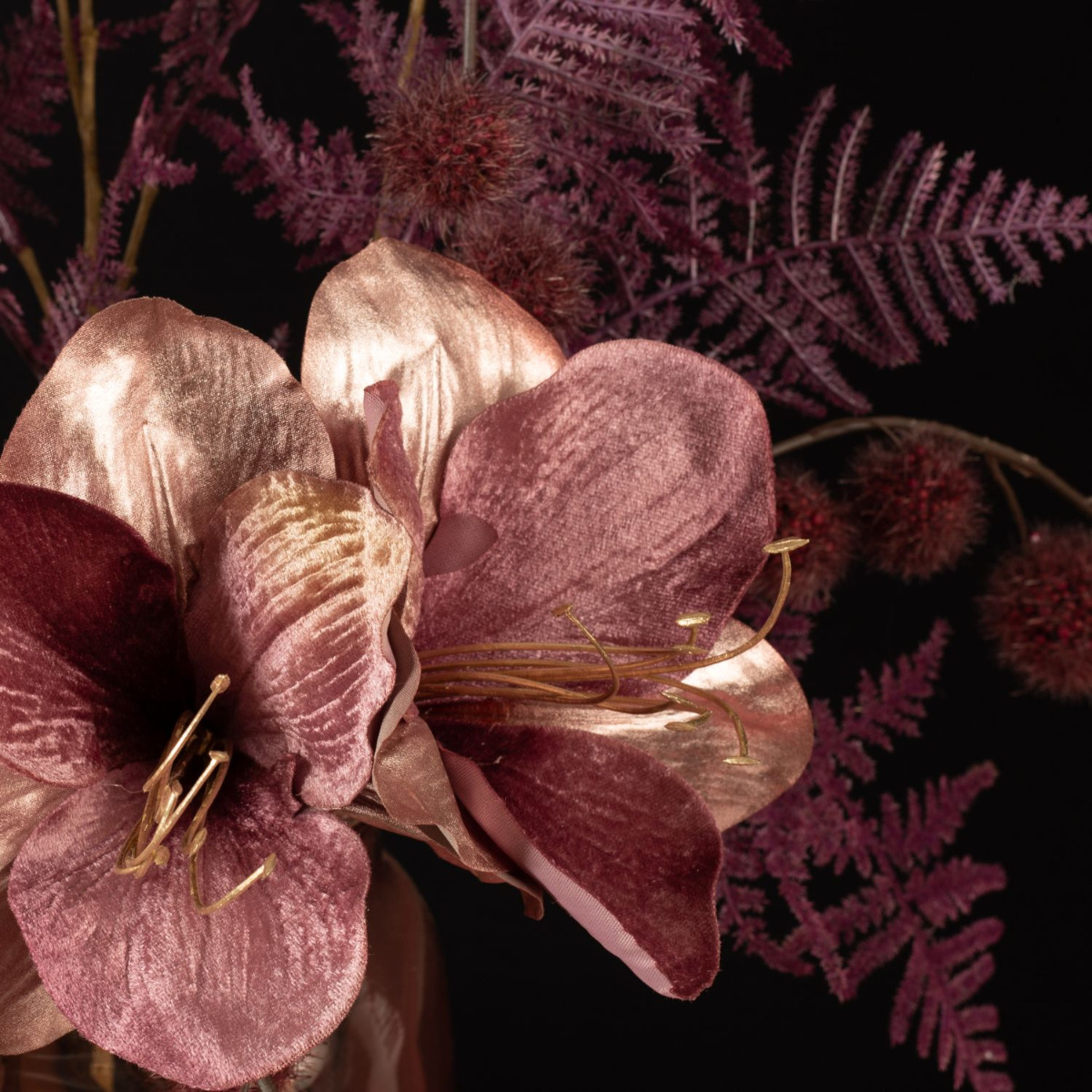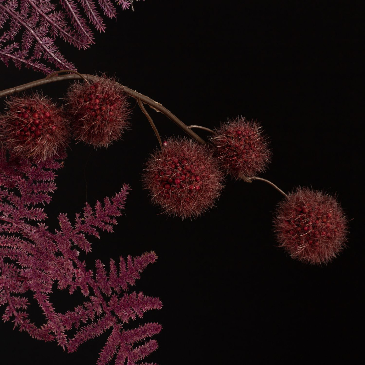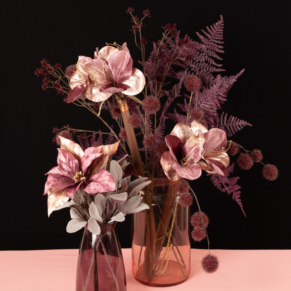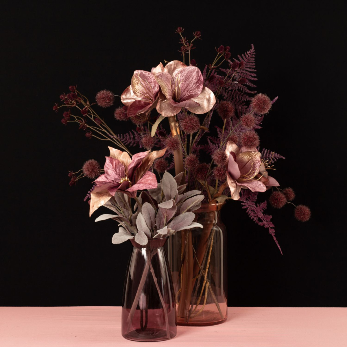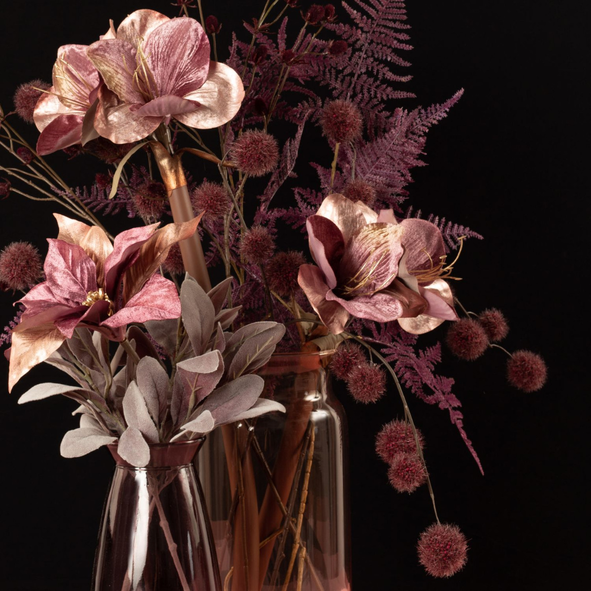 ¡Rosé y burdeos! No sólo son buenos vinos que combinan bien con el invierno, estos colores también evocan calidez en tu hogar. Las flores de invierno aterciopeladas que se utilizan aquí son una interpretación moderna de la Navidad en esta combinación de colores inusual. Un ramito de bolas de Gomphorcarpus de color rojo vino recuerda a las pequeñas bolas de Navidad que rodean a las grandes flores. Para todos aquellos que ya están cansados del rojo y el verde en Navidad. Compre el look!