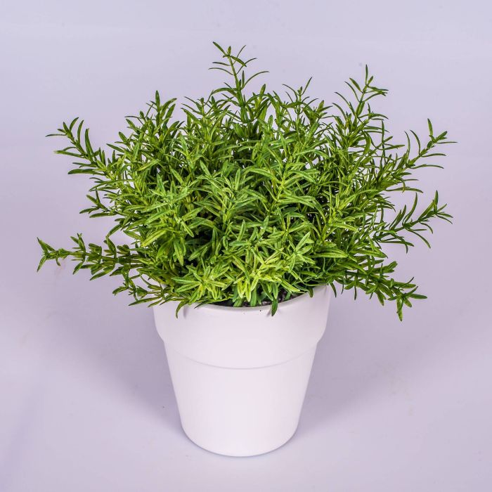 Arbusto de romero en un tiesto de cerámica blanca y veteada. El arbusto artificial tiene una altura total de unos 23 cm y es adecuado para para cocinas domésticas, cantinas, colmados y mucho más.