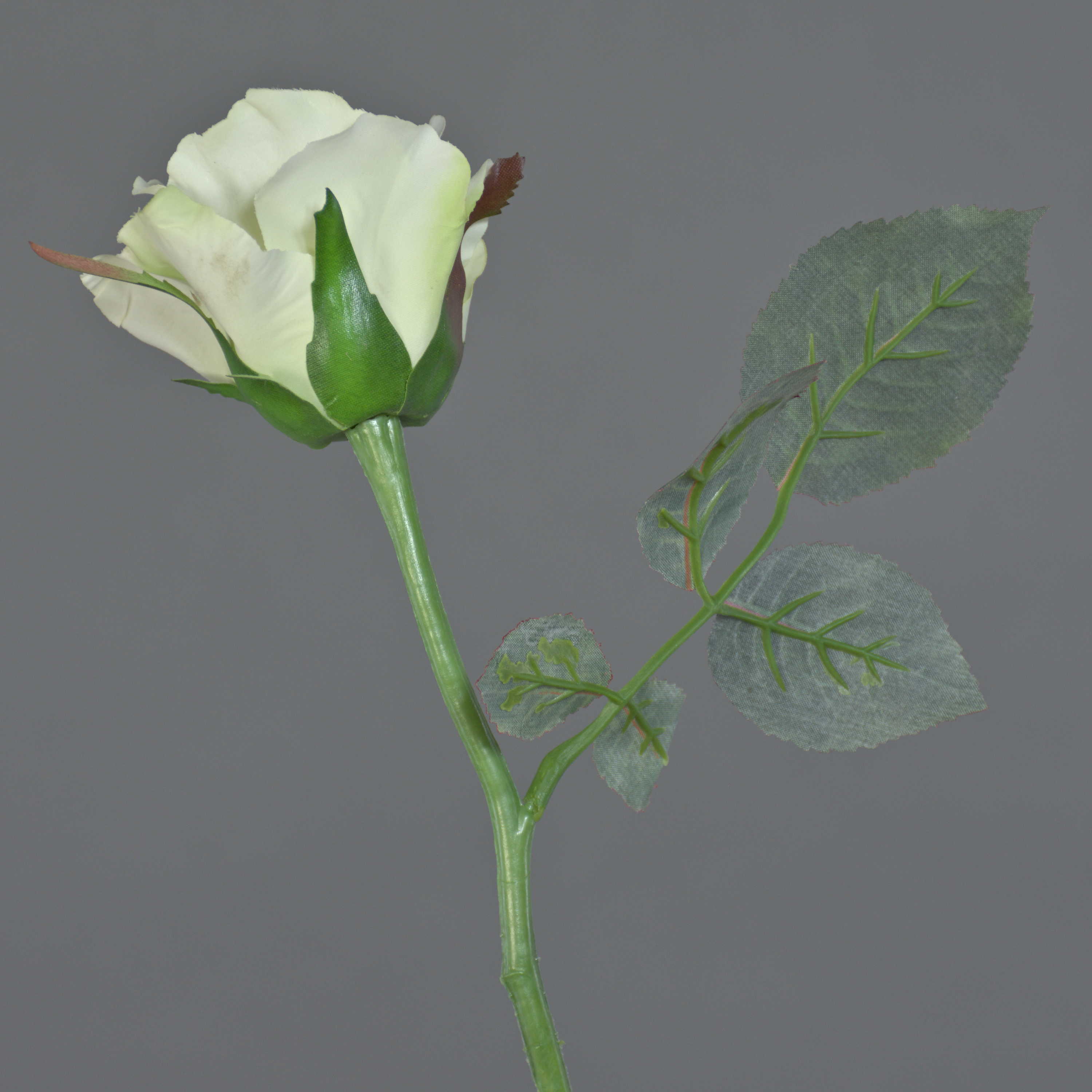 Bonita rosa artificial ELLI con una flor de color crema y hojas verdes de textil. La pequeña rosa posee una longitud total de aprox. 30 cm y tiene un diámetro de la inflorescencia de aprox. 6 cm.
