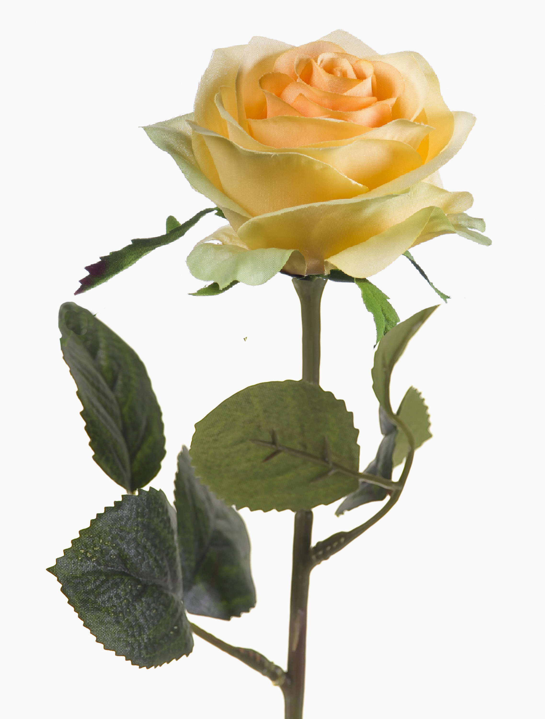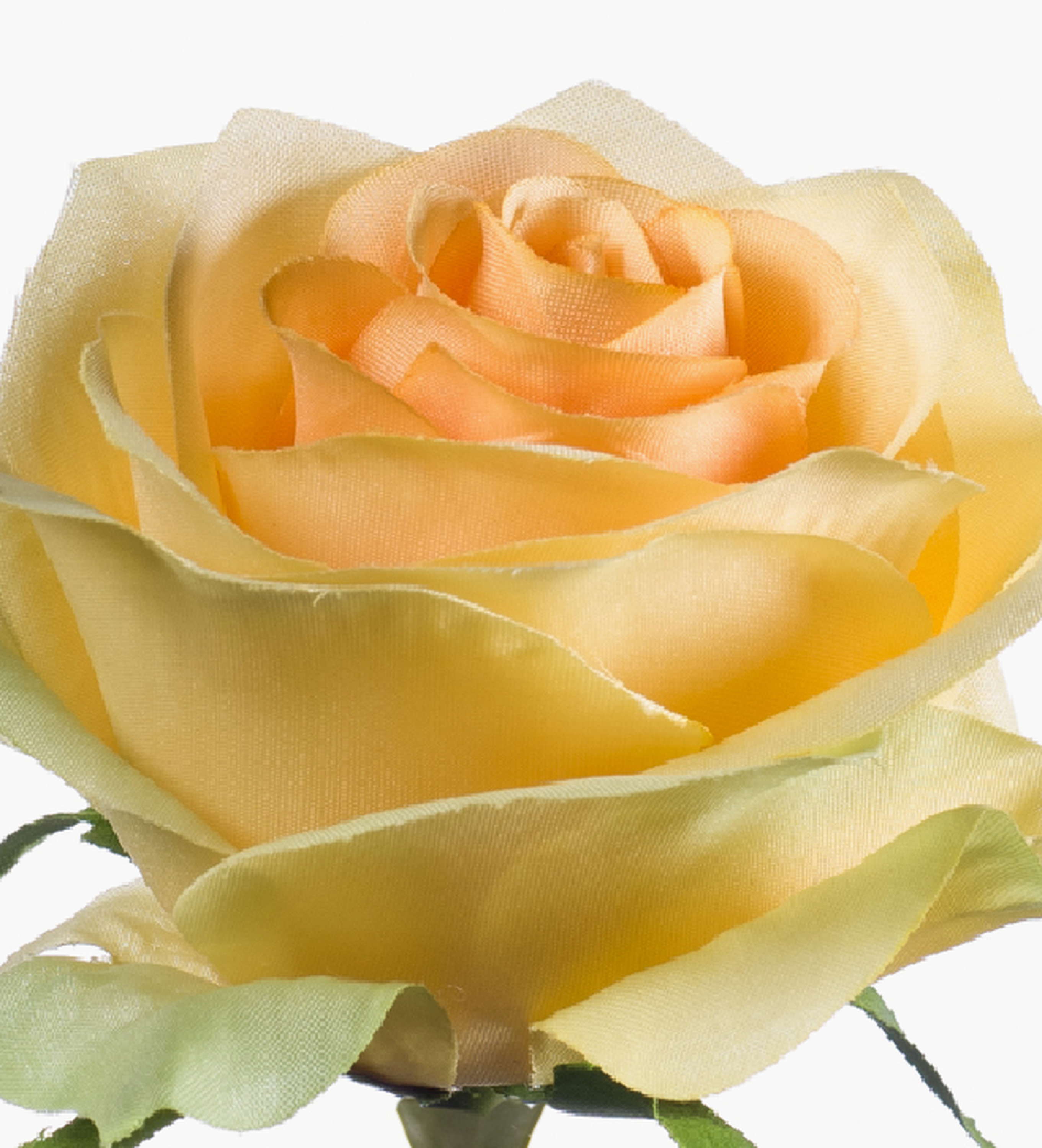 Bonita rosa artificial SIMONY en color amarillo con hojas verdes. La rosa artificial posee una longitud total de aproximadamente 45 cm y un diámetro de la flor de 8 cm.