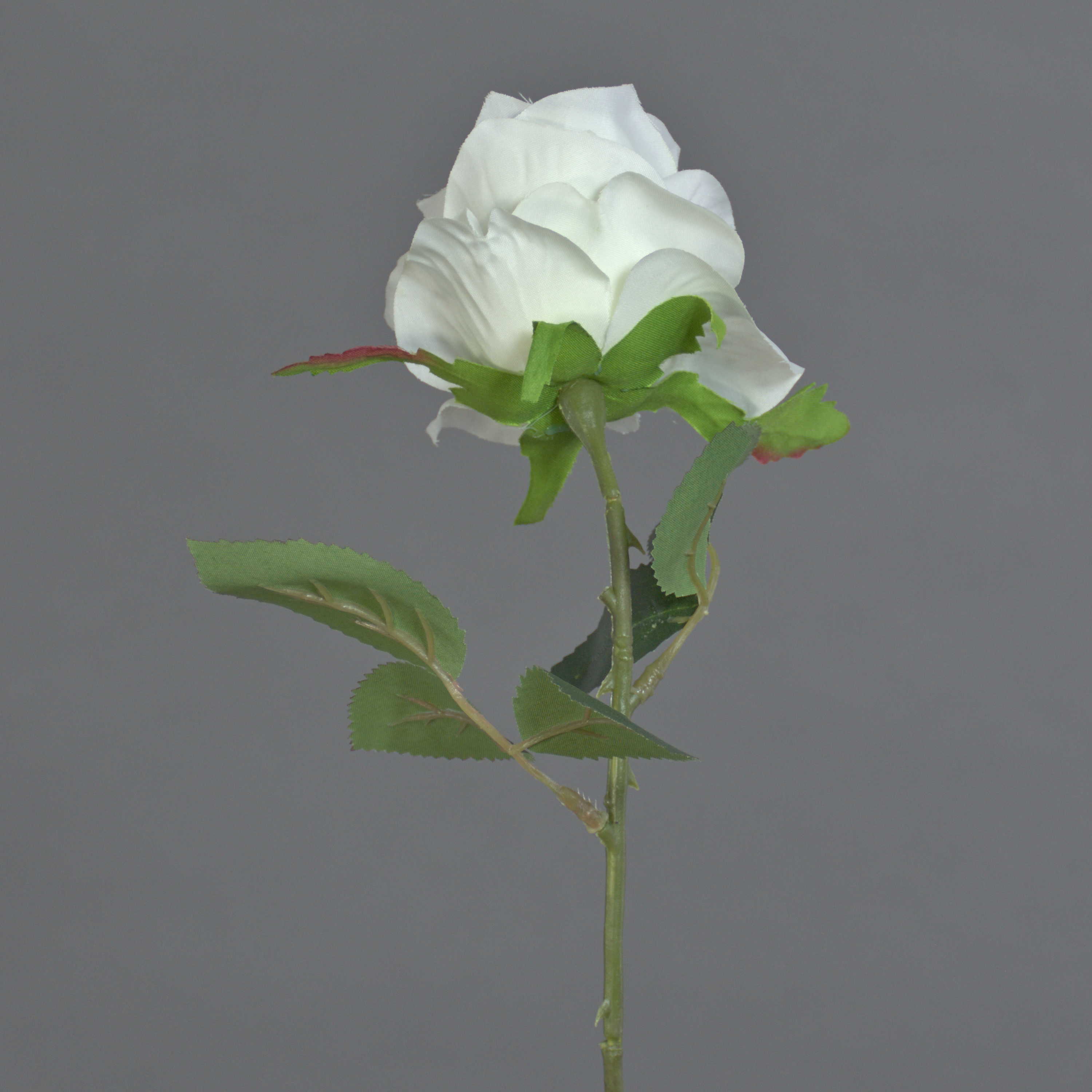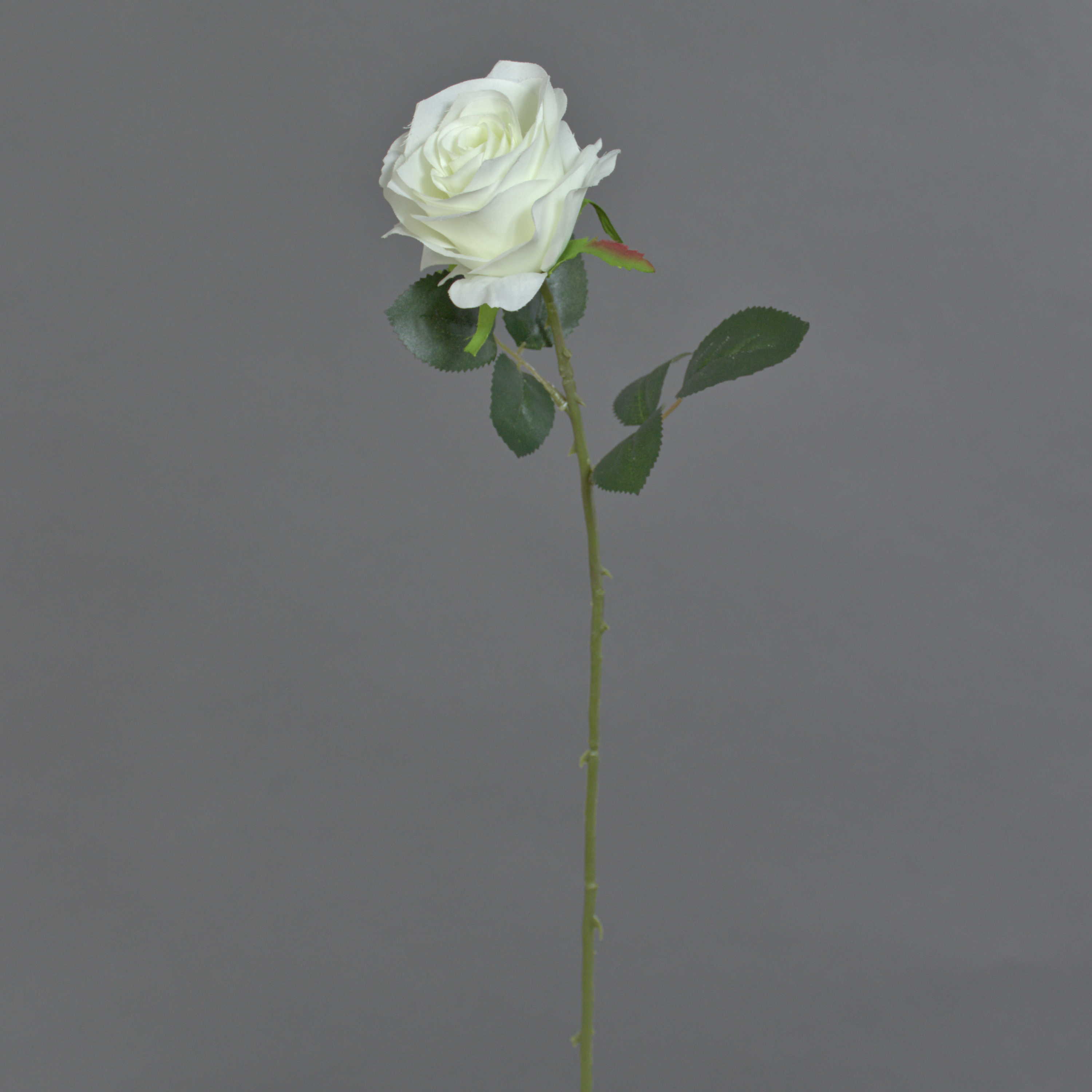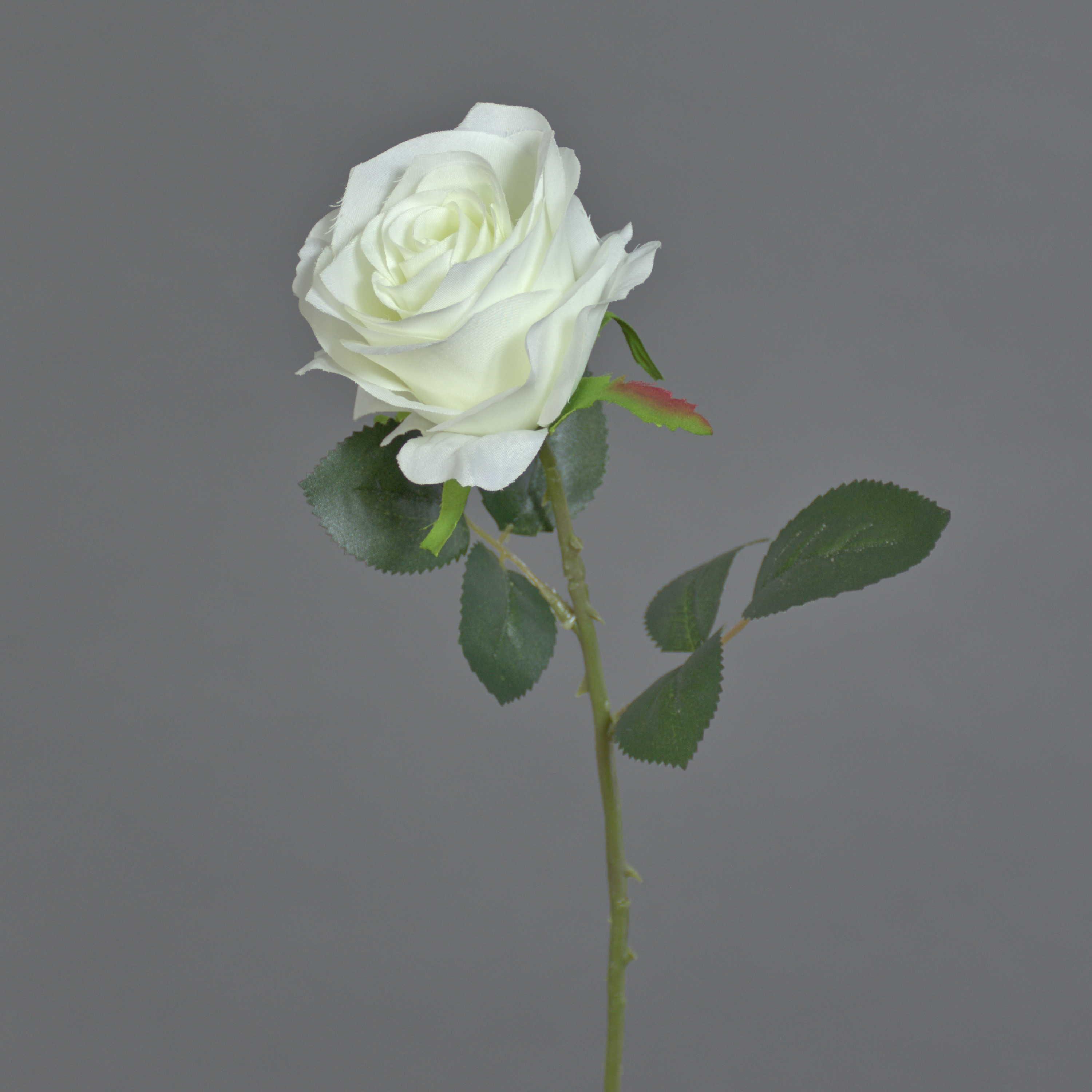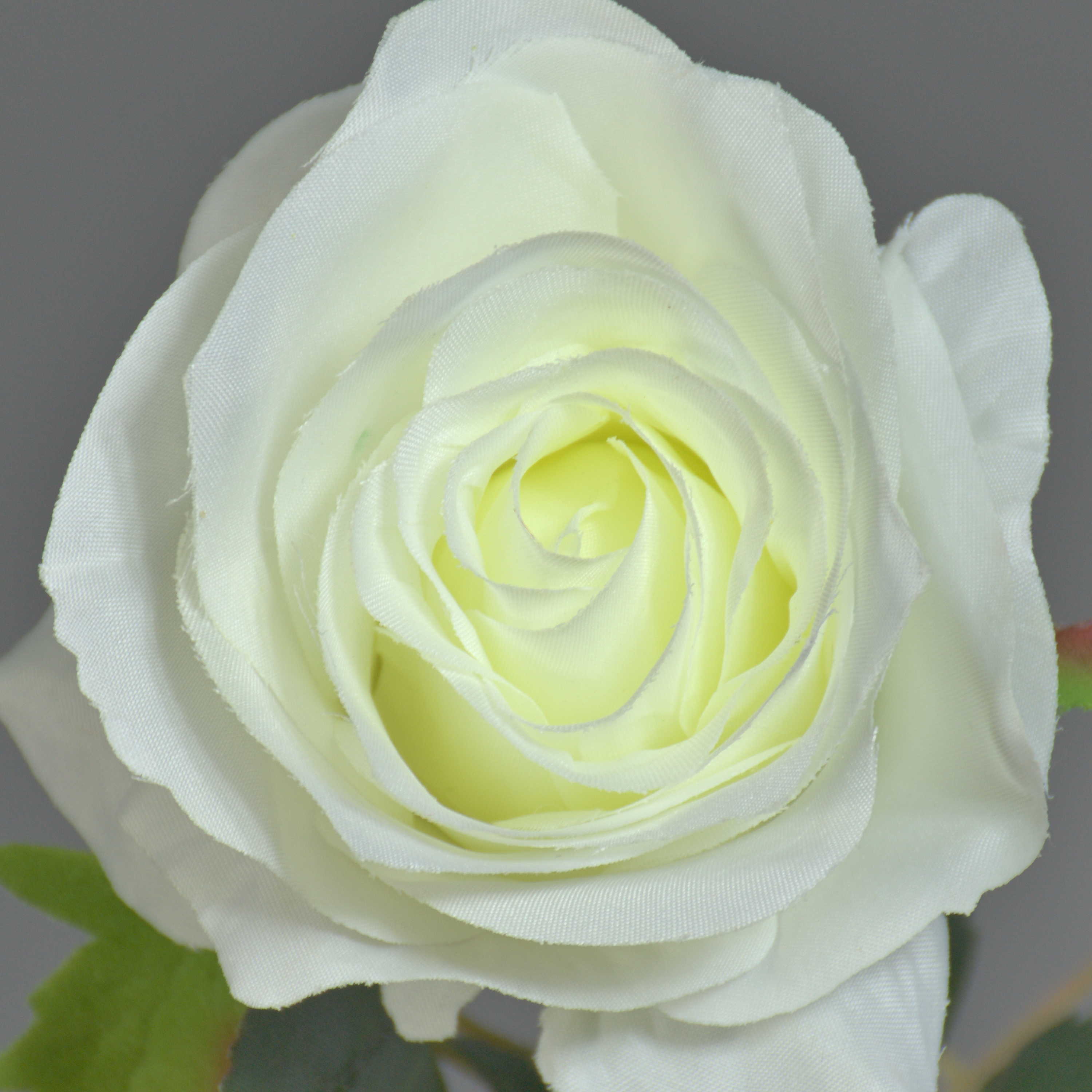 Bonita rosa artificial SIMONY en color crema con hojas verdes. La rosa artificial posee una longitud total de aproximadamente 45 cm y un diámetro de la flor de 8 cm.