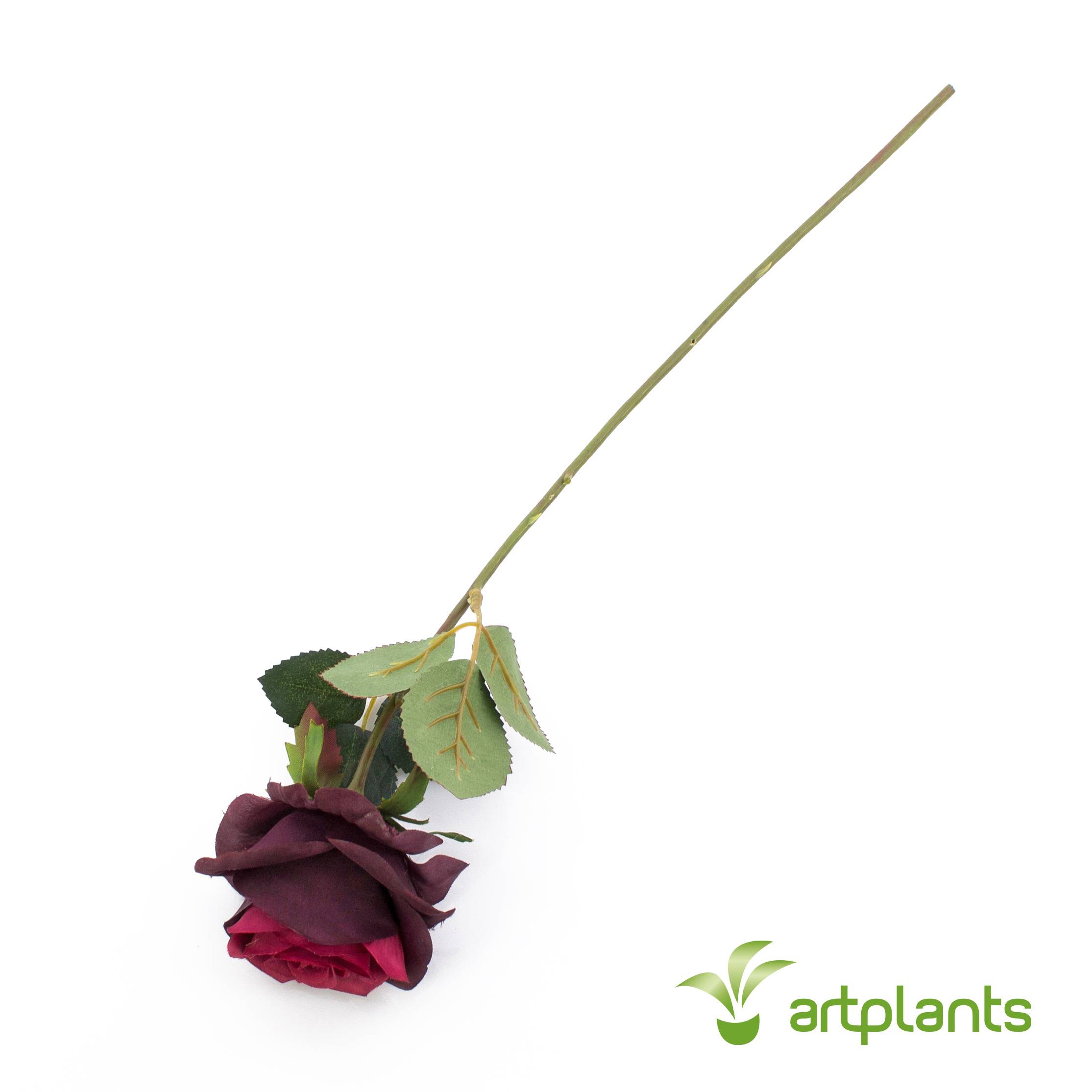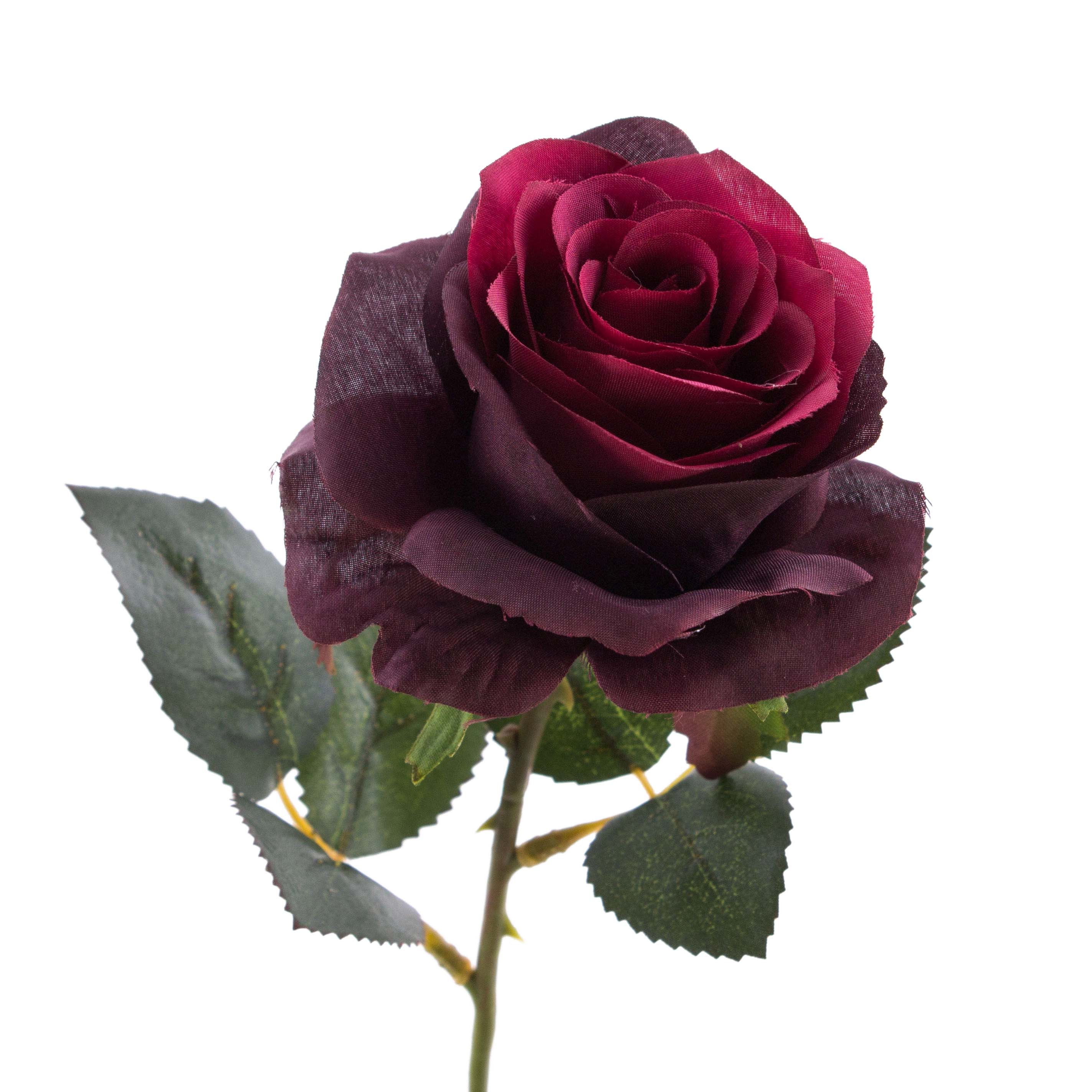 Bonita rosa artificial SIMONY en color rojo burdeos con hojas verdes. La rosa artificial posee una longitud total de aproximadamente 45 cm y un diámetro de la flor de 8 cm.