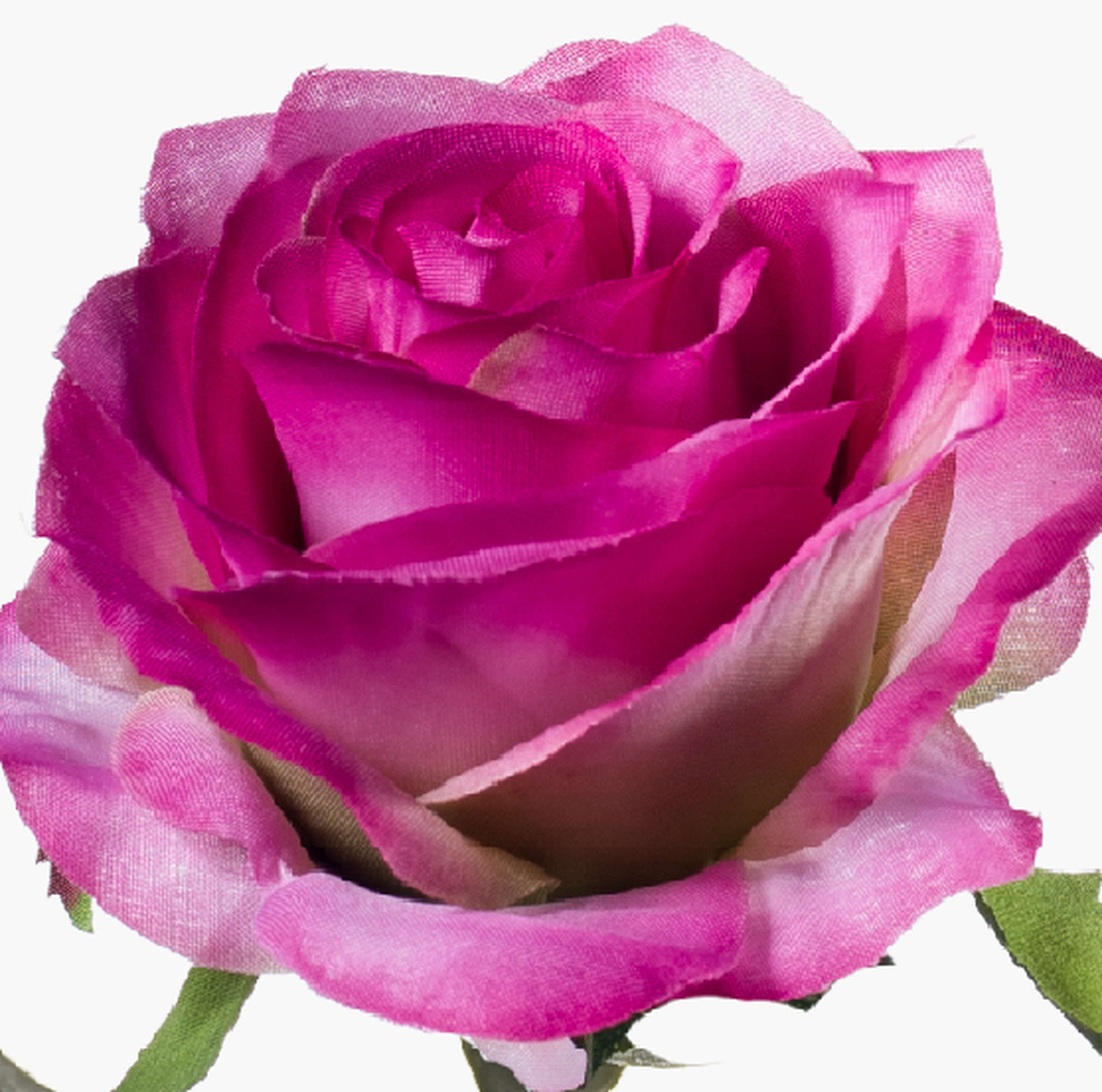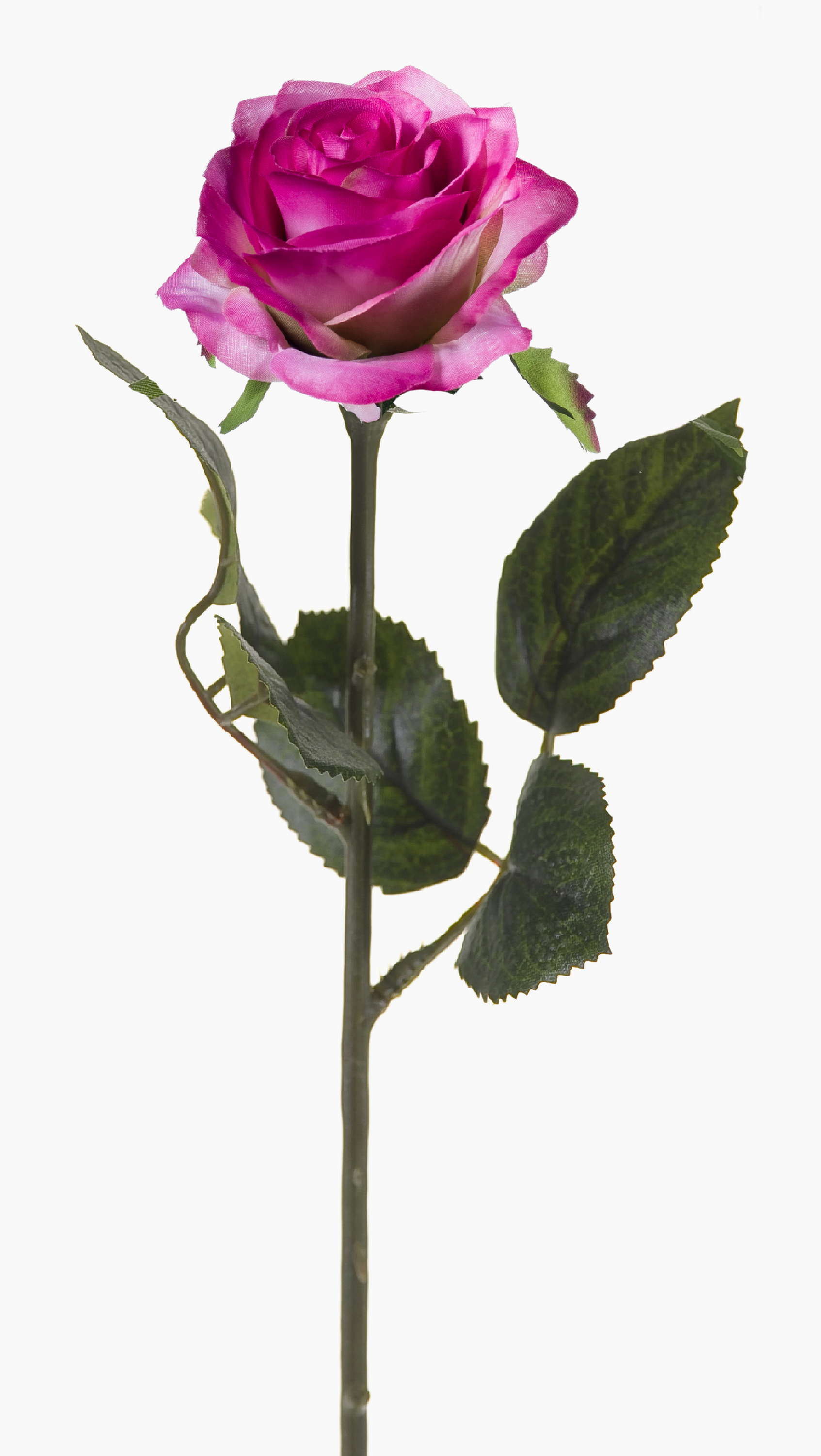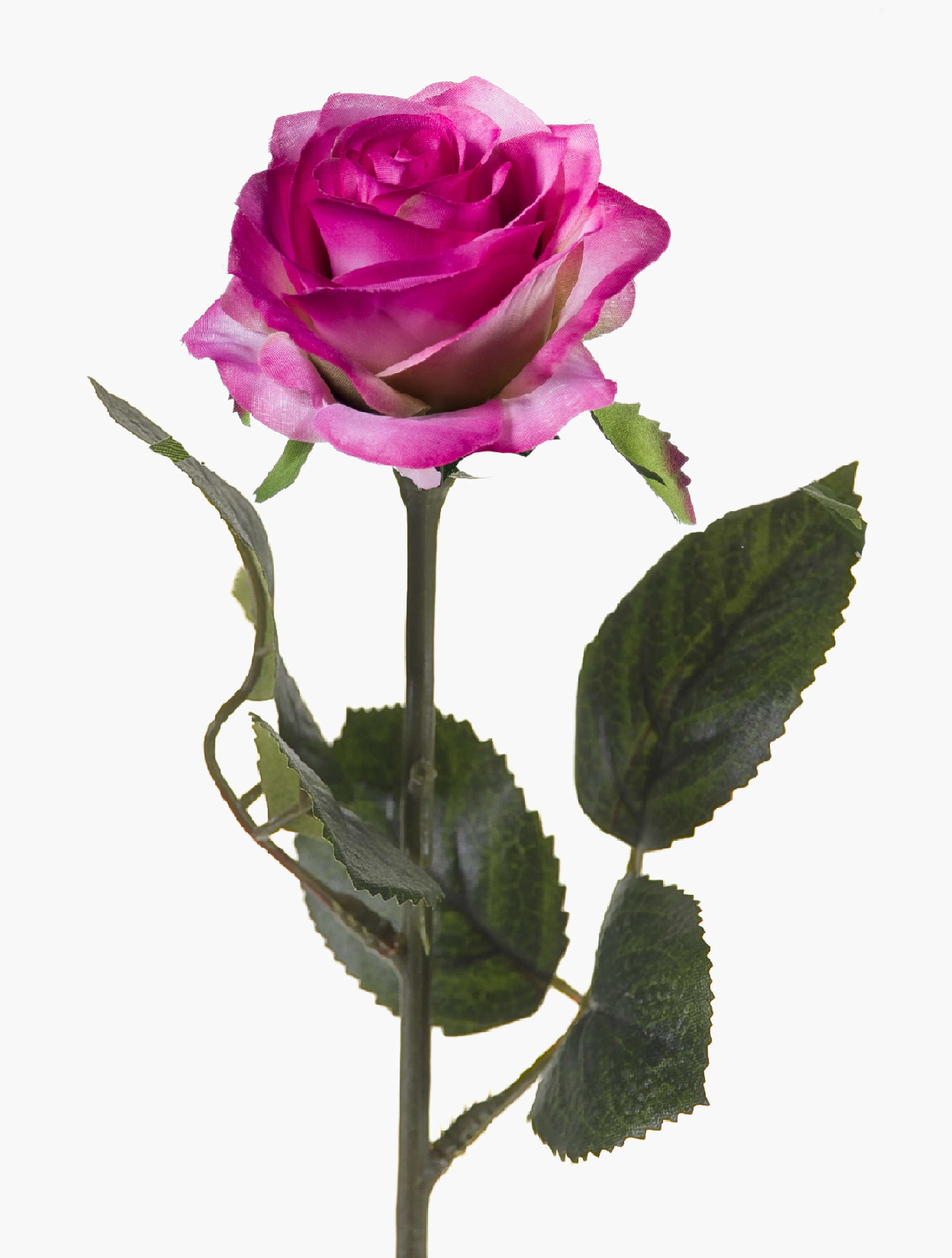 Bonita rosa artificial SIMONY en color rosa-fucsia con hojas verdes. La rosa artificial posee una longitud total de aproximadamente 45 cm y un diámetro de la flor de 8 cm.