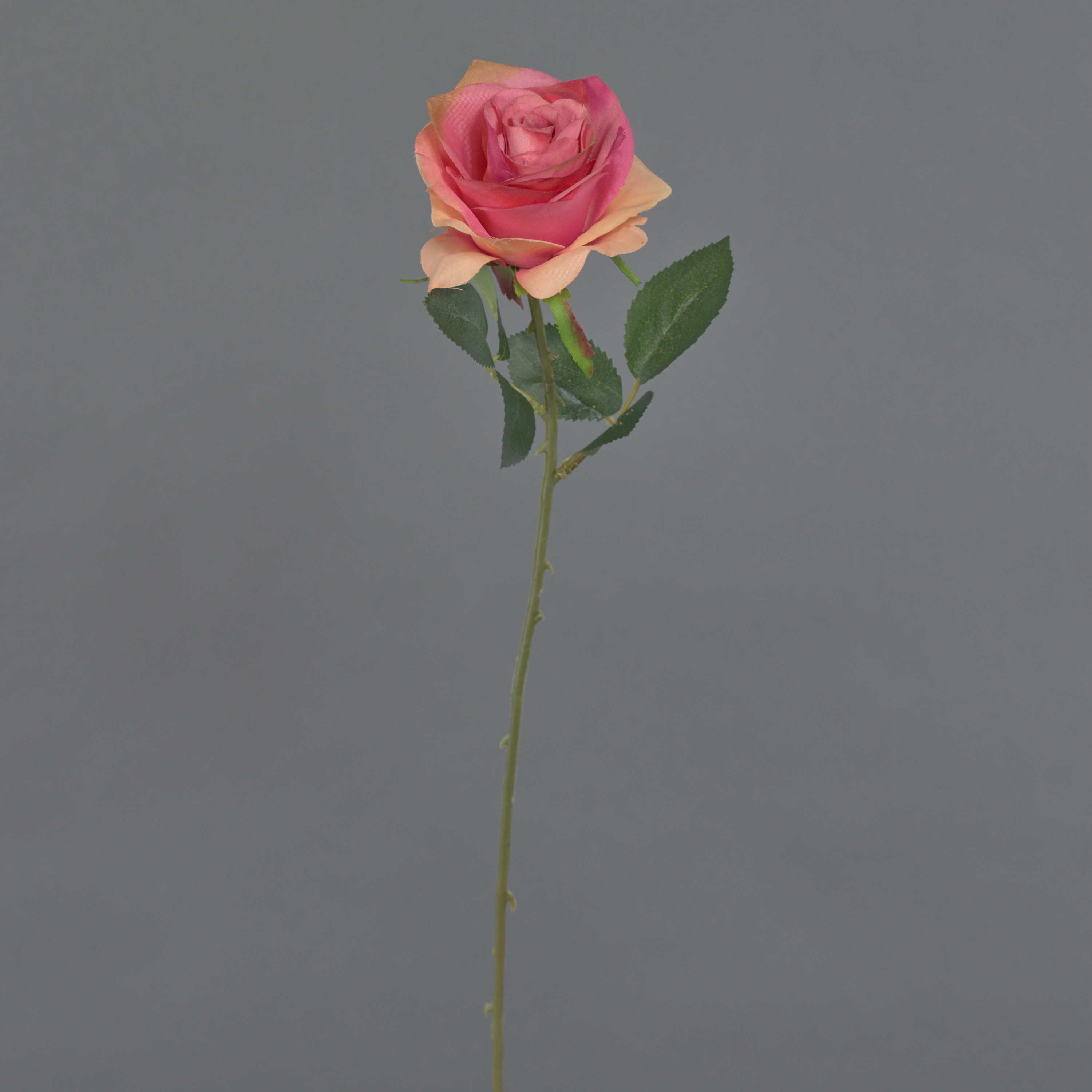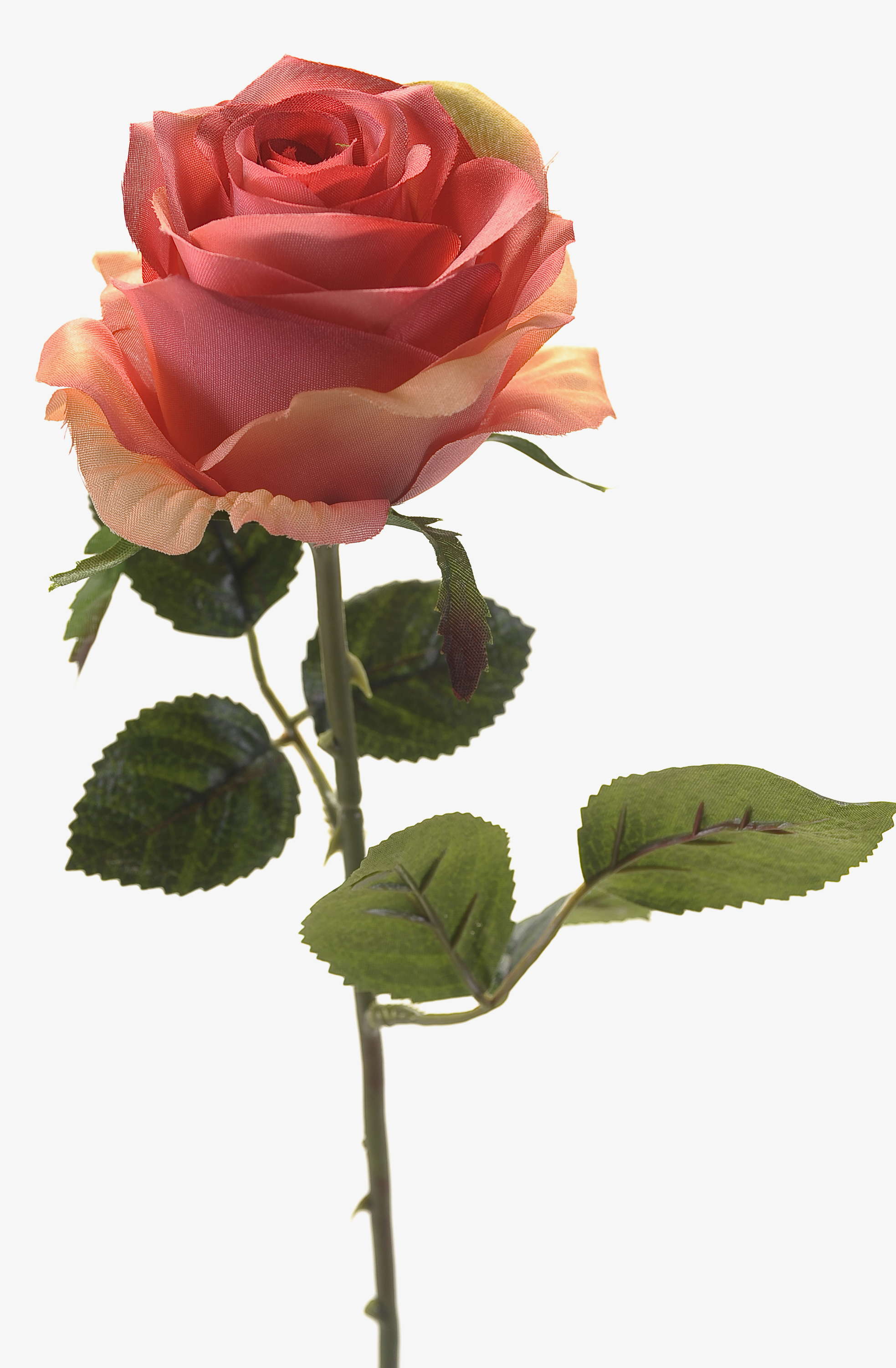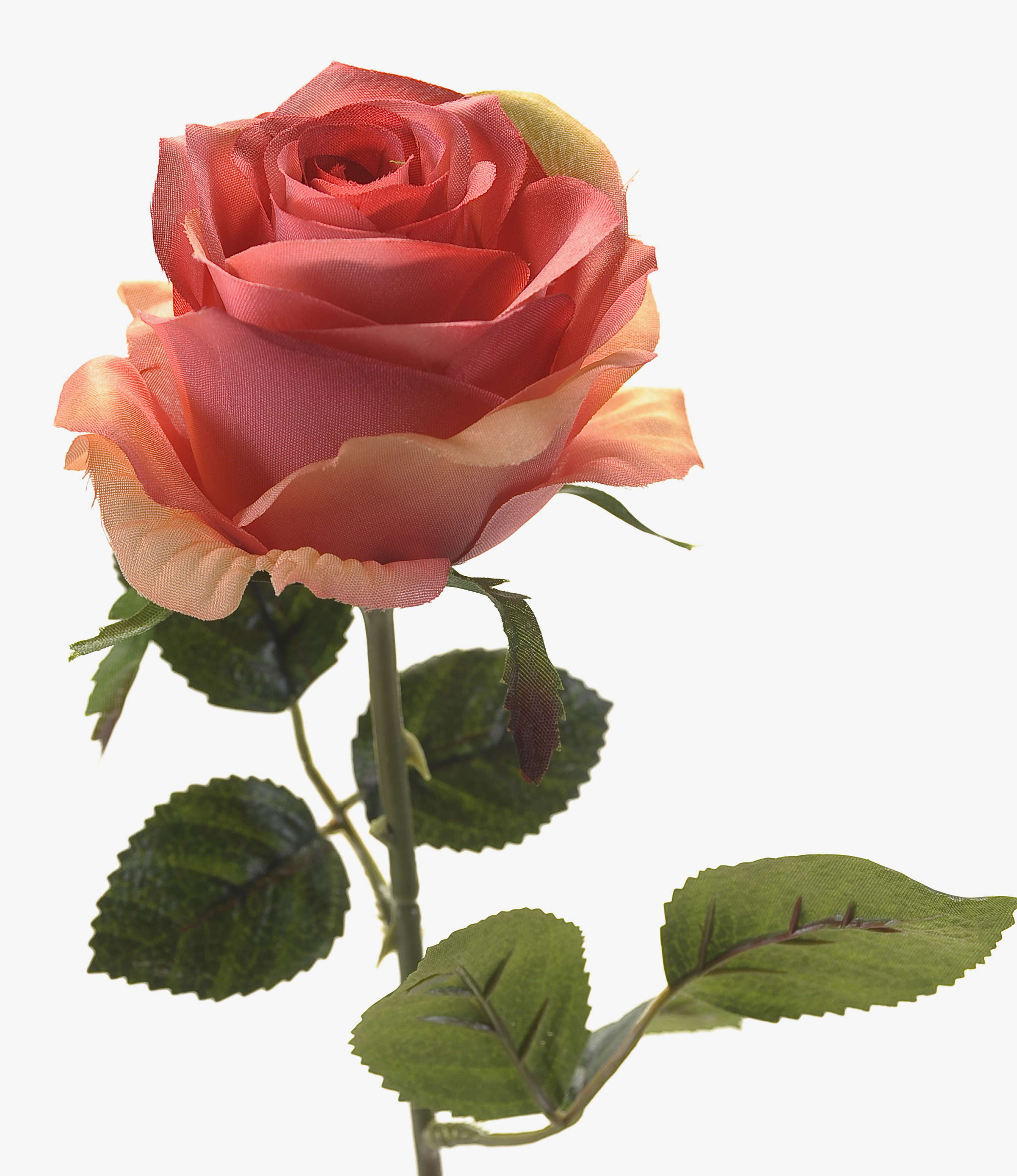 Bonita rosa artificial SIMONY en color rosa salmón con hojas verdes. La rosa artificial posee una longitud total de aproximadamente 45 cm y un diámetro de la flor de 8 cm.