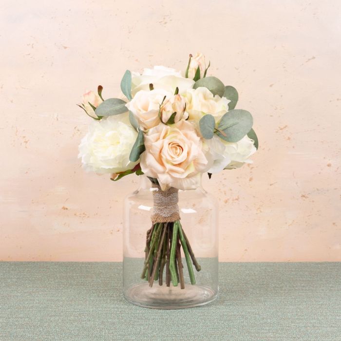 ¡Rosa y blanco crema! Una hermosa combinación de colores para una ocasión romántica. Leonie eligió estos colores para el día de su boda y pensó que su ramo de novia era tan bonito que nos encargó que lo recreáramos para ella. Por supuesto, con flores artificiales eternas. Una bella metáfora del amor eterno. ¡Compra el look!