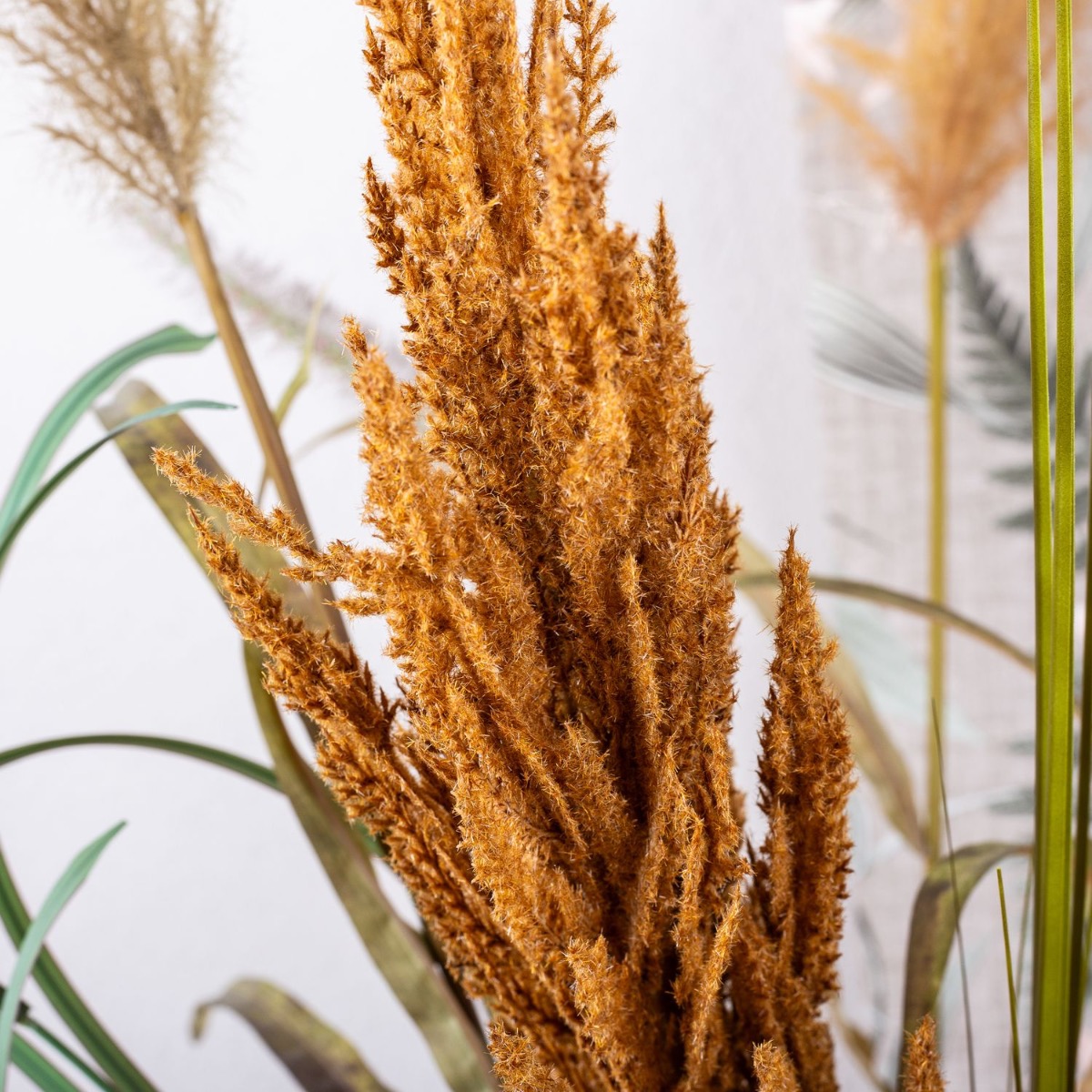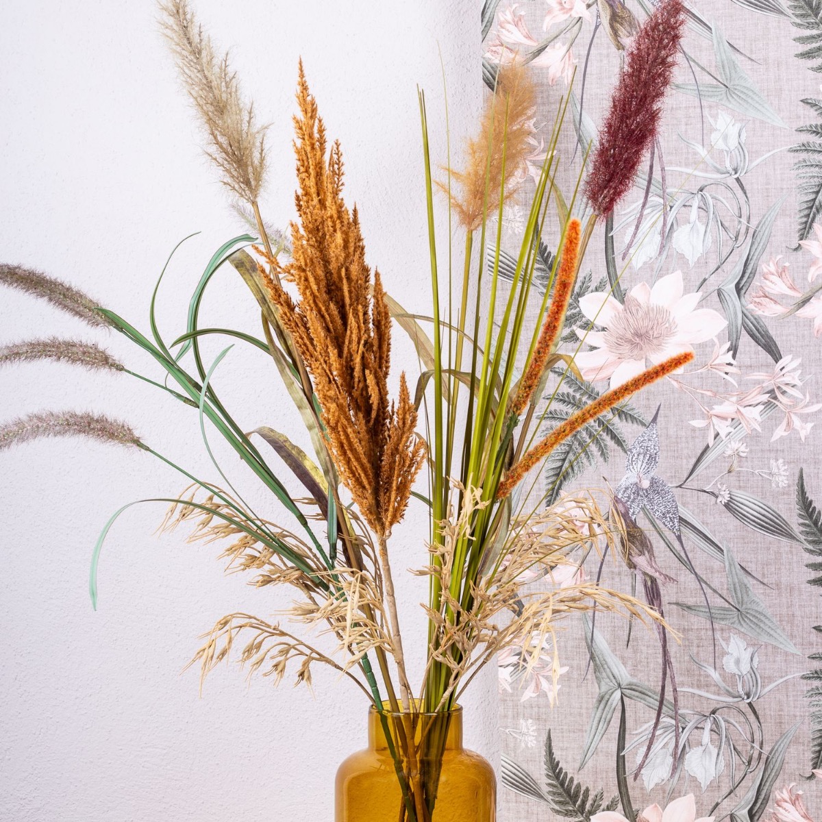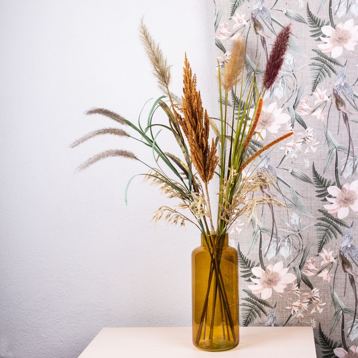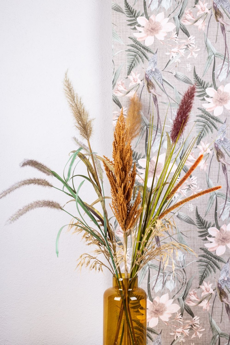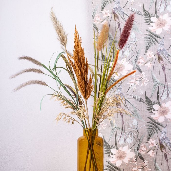 Coñac: el nuevo color de moda! Tanto en la moda como en el salón, este tono marrón cálido y luminoso se puede combinar estupendamente con los colores clásicos del otoño. El jarrón de cristal SIARA resulta especialmente elegante en este color y confiere a nuestro ramo de diferentes hierbas un aspecto extravagante. Natural y elegante, esta composición está a la última. Compra el look!