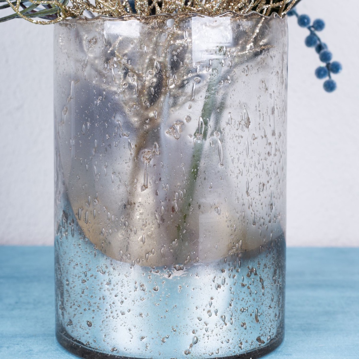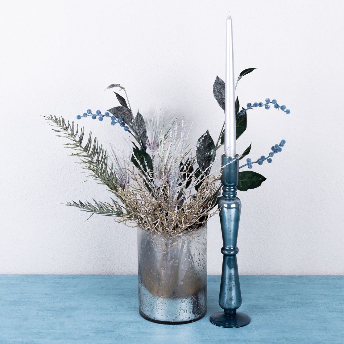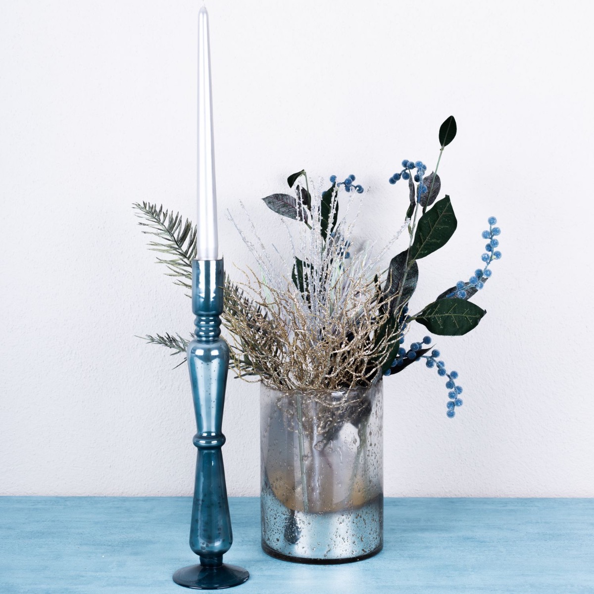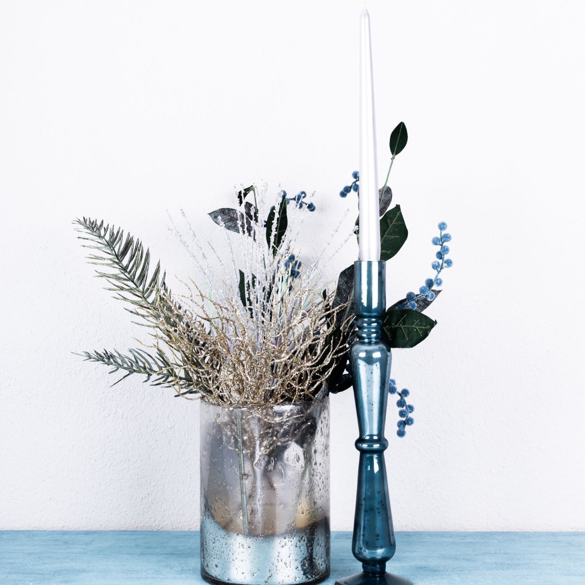 Azul hielo y plata! Con este look helado, queríamos crear algo para el invierno que no pareciera navideño pero que creara un ambiente acogedor. El candelabro brilla en un maravilloso color azul y sus manchas oscuras hacen que parezca una pieza antigua. El brillante cristal cilíndrico plateado de diseño vintage combina a la perfección. Las ramas brillantes, como la rama coral y las bayas azules, completan este look a la perfección y son ideales para la decoración de Nochevieja. Compra el look!