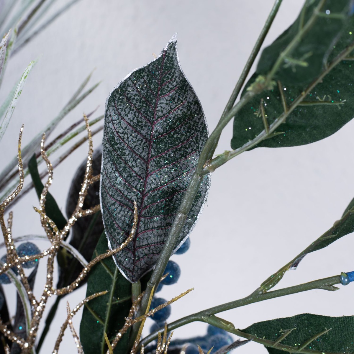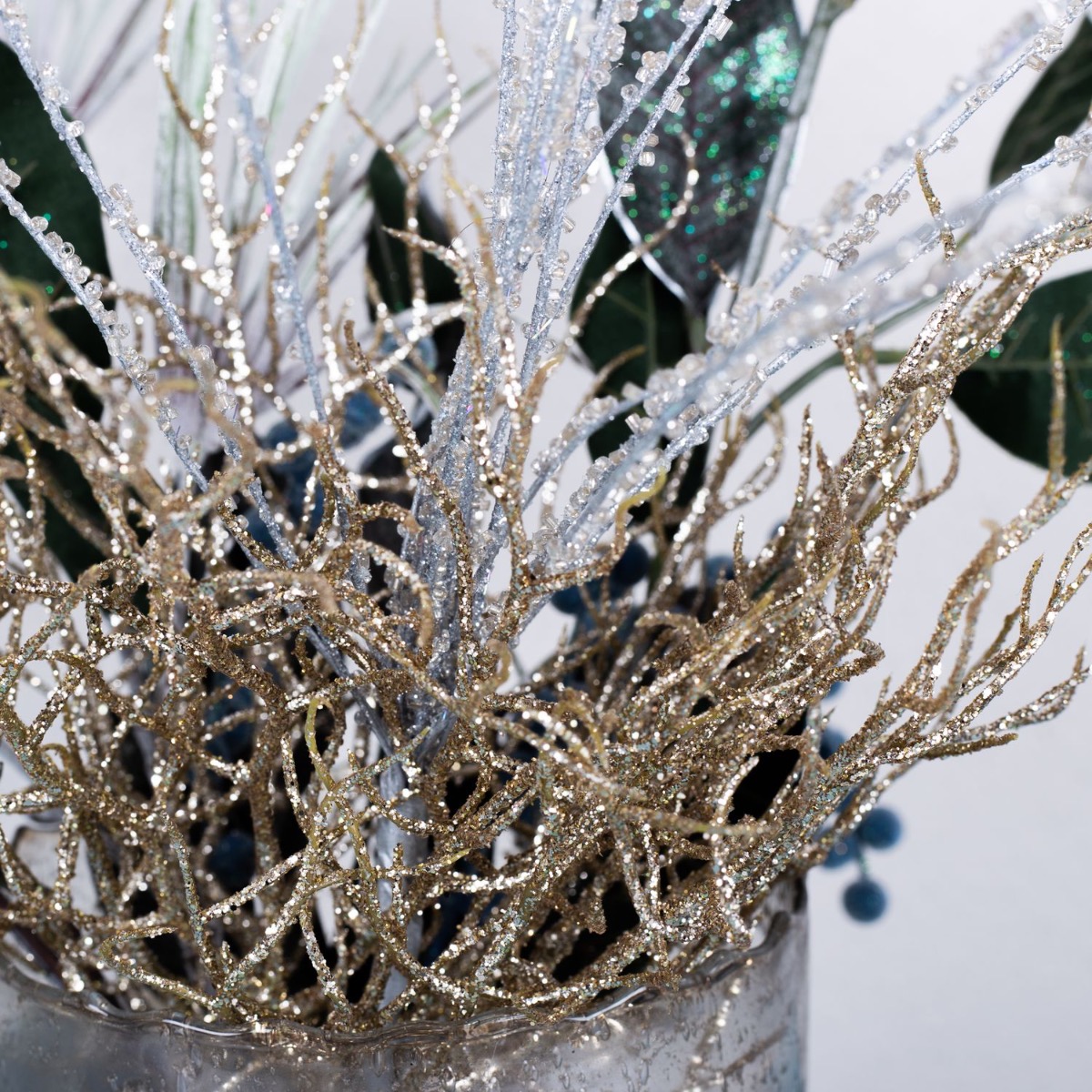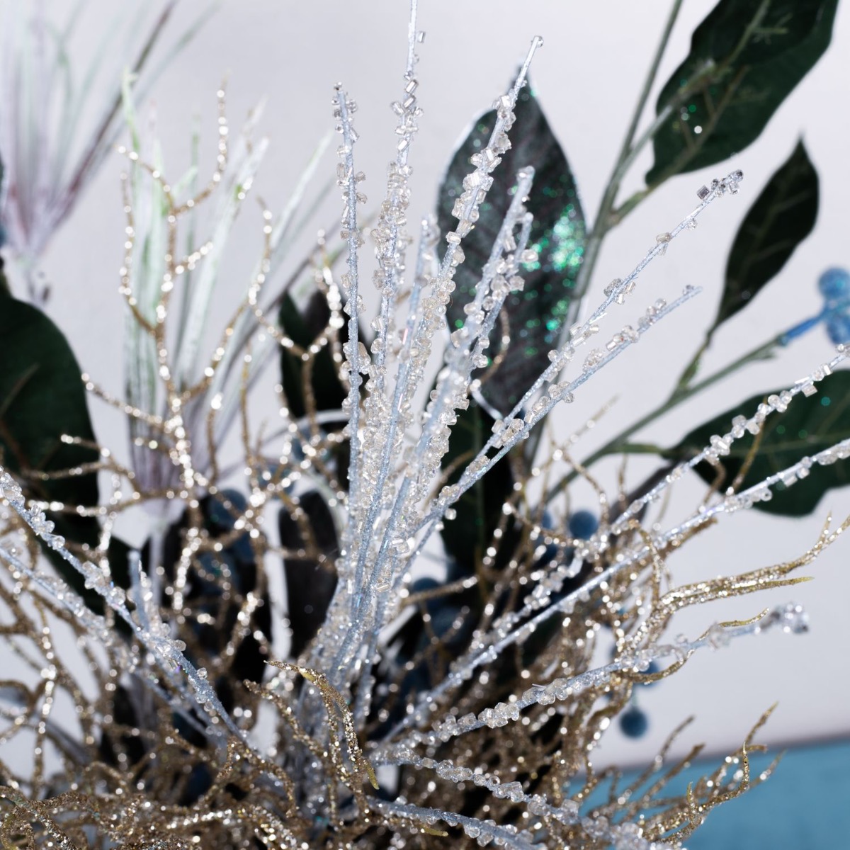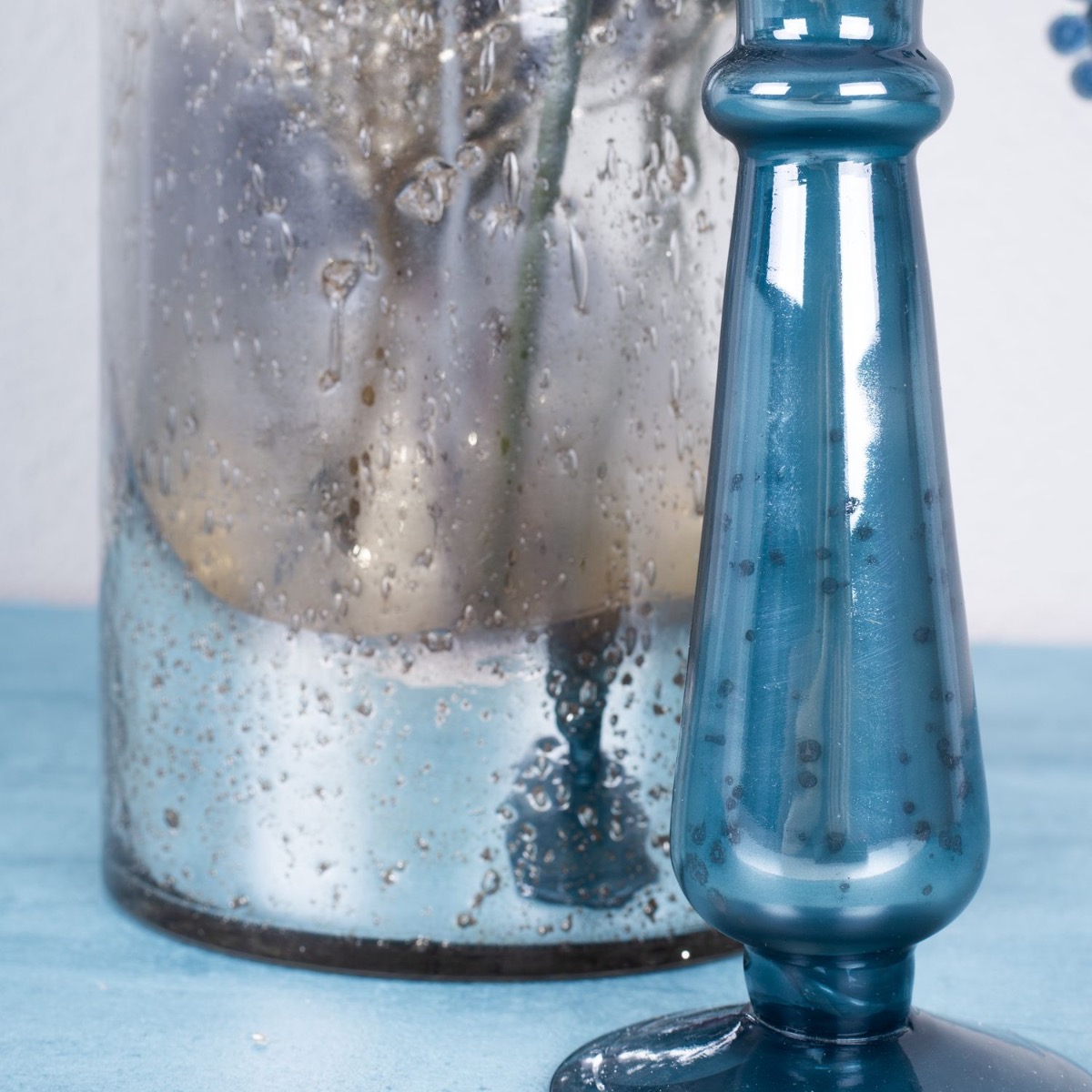 Azul hielo y plata! Con este look helado, queríamos crear algo para el invierno que no pareciera navideño pero que creara un ambiente acogedor. El candelabro brilla en un maravilloso color azul y sus manchas oscuras hacen que parezca una pieza antigua. El brillante cristal cilíndrico plateado de diseño vintage combina a la perfección. Las ramas brillantes, como la rama coral y las bayas azules, completan este look a la perfección y son ideales para la decoración de Nochevieja. Compra el look!