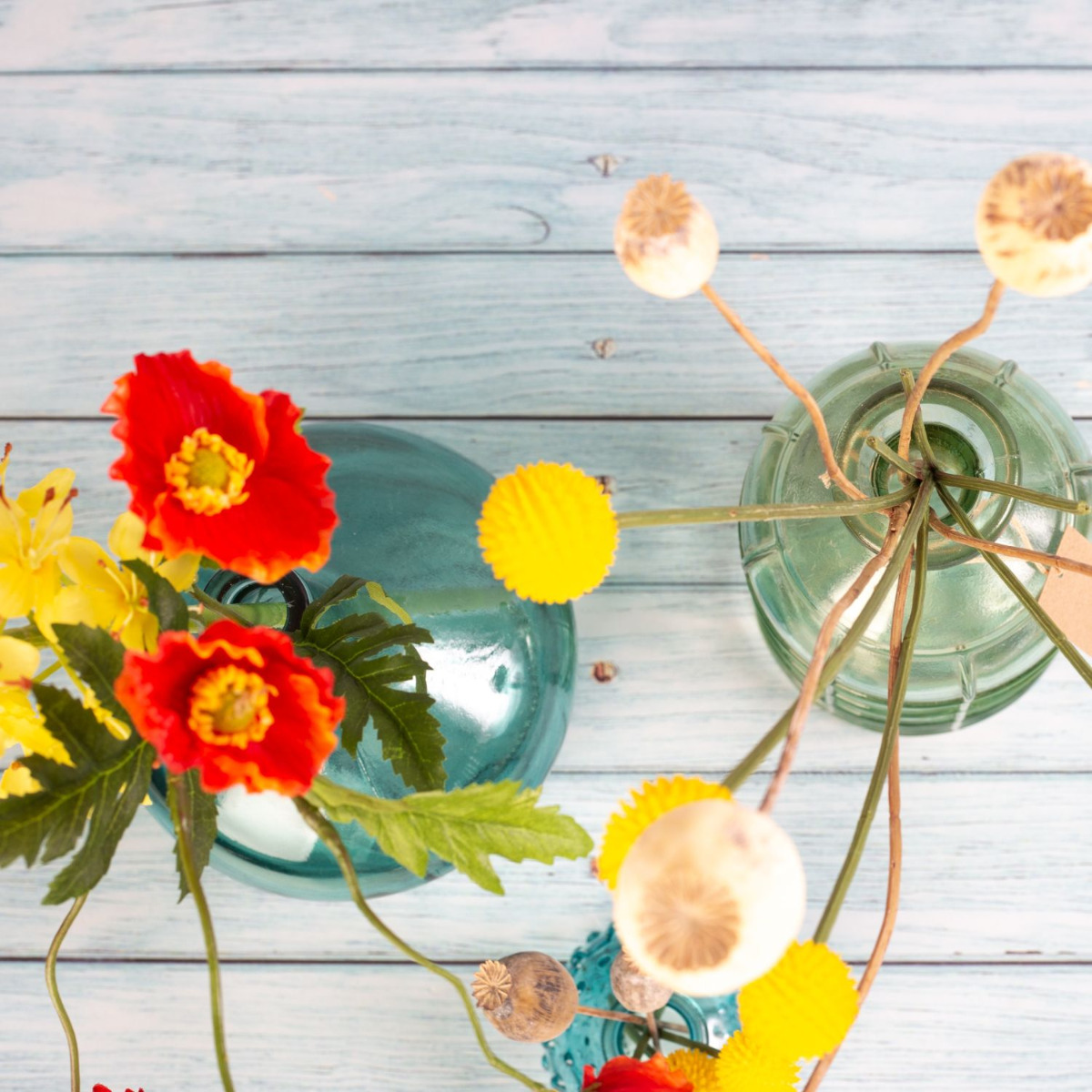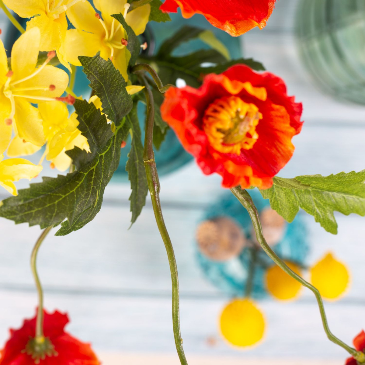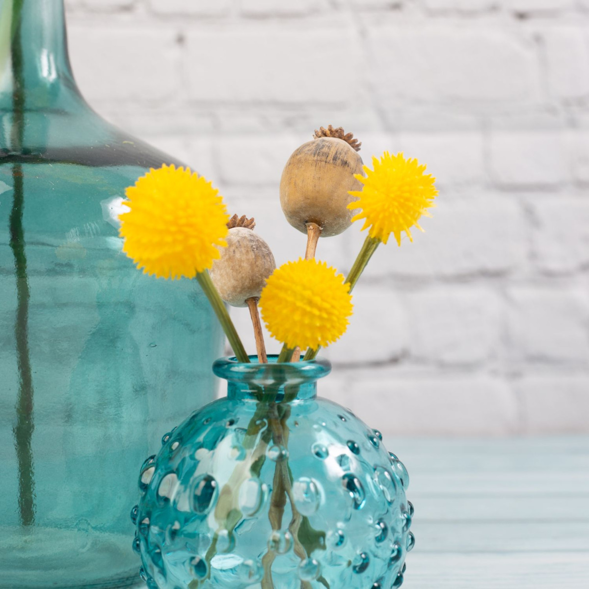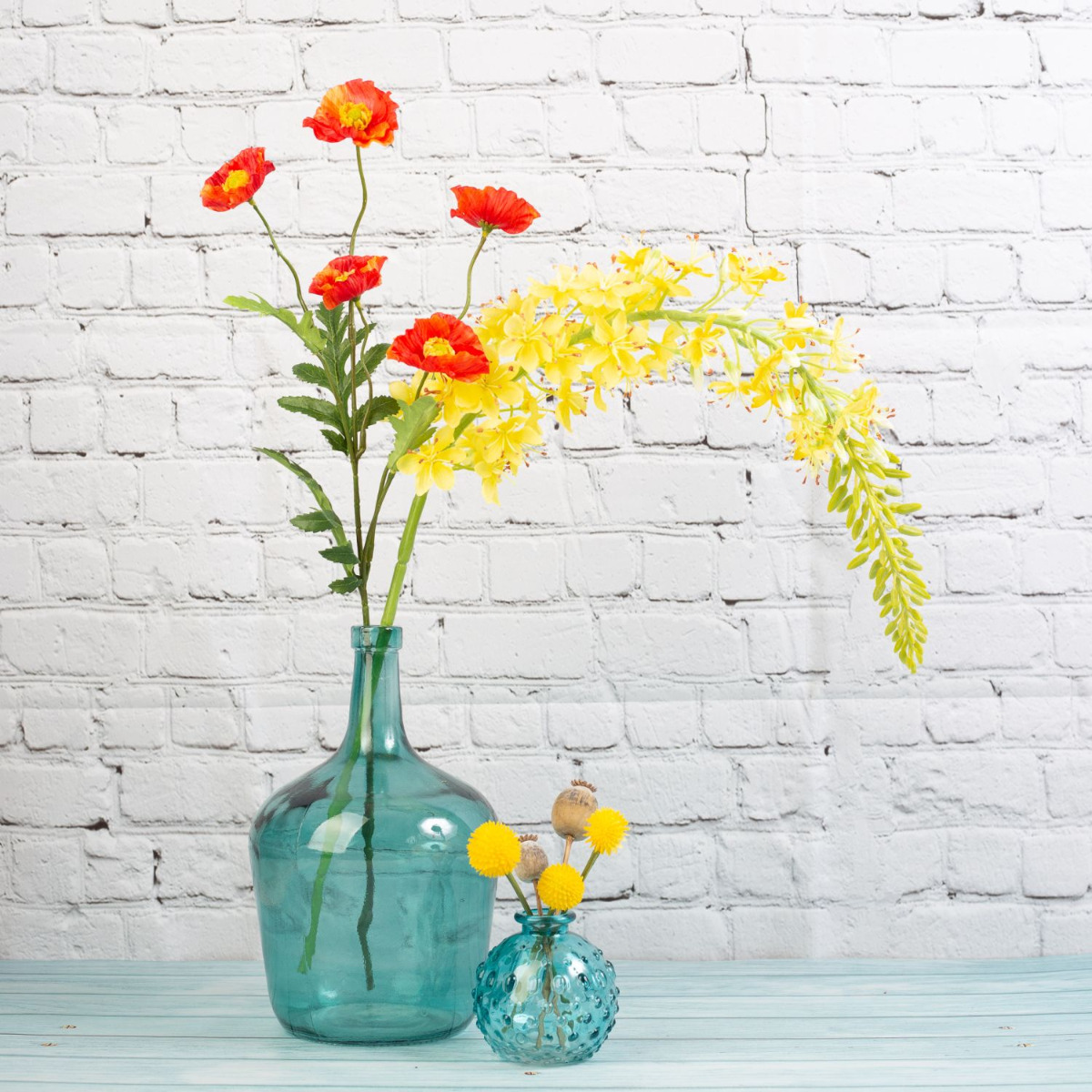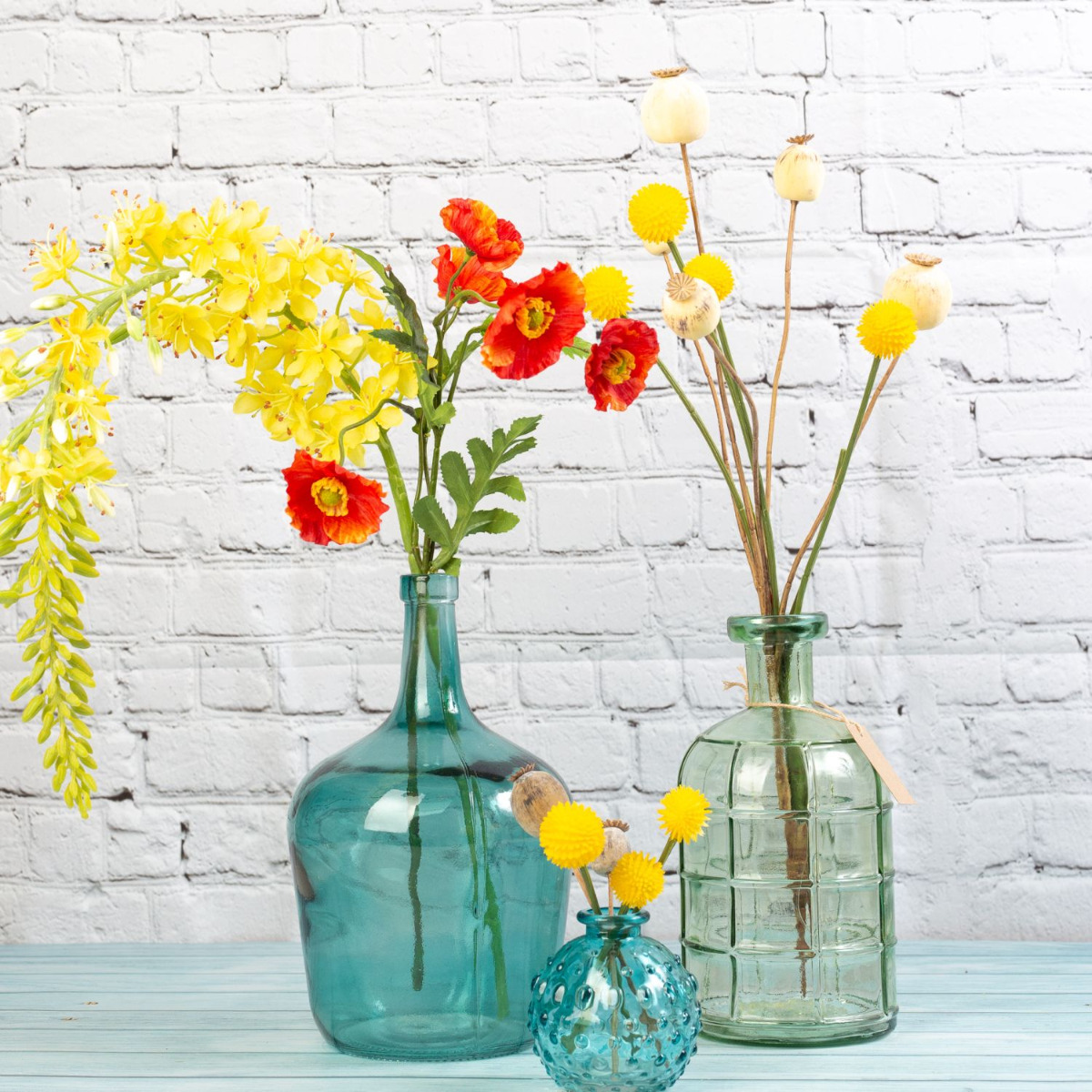 ¡Botellas decorativas de color del mar! El azul brillante de las botellas armoniza maravillosamente con las flores amarillas del eremurus, así como con la Craspedia Globosa. Las cápsulas de amapola de color crema se acoplan suavemente con las flores amarillas, mientras que las flores rojas de la amapola destacan con fuerza. La variedad de formas de las botellas coincide con las distintas formas de las flores. Un ambiente marítimo que nos hace soñar con un viaje al mar. ¿También quiere dar un nuevo brillo a su espacio vital? ¡Compre el look!