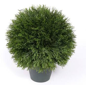 Bola de ciprés artificial en maceta. La bola de una fina elaboración, junto con sus 290 ramitas, posee un diámetro aproximado de 30 cm y una altura total aproximada de 40 cm.
