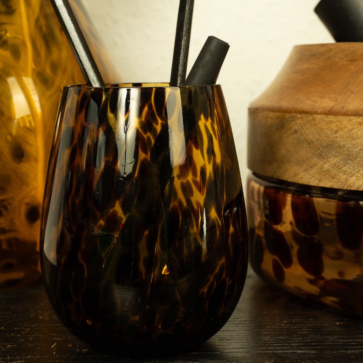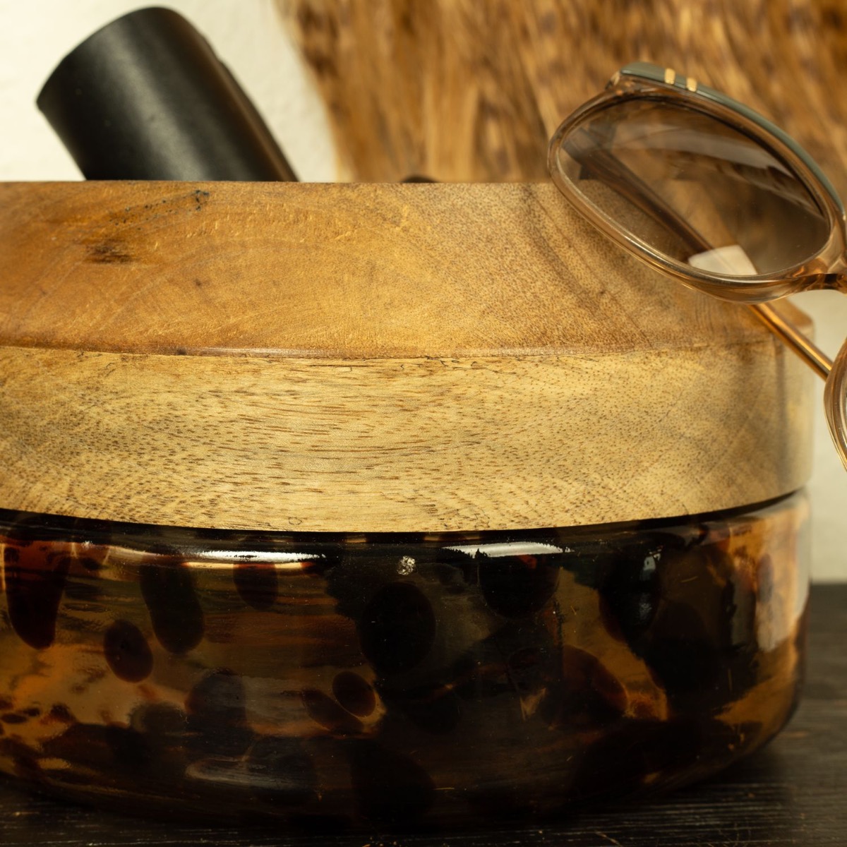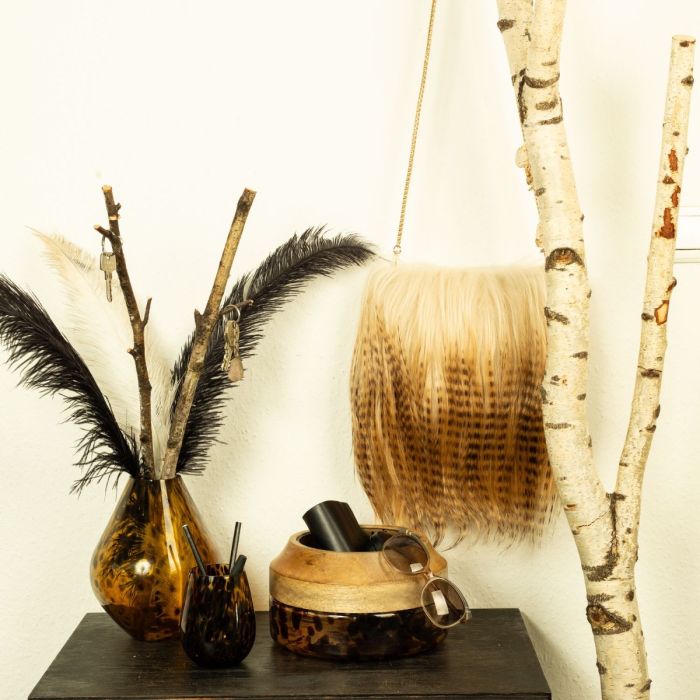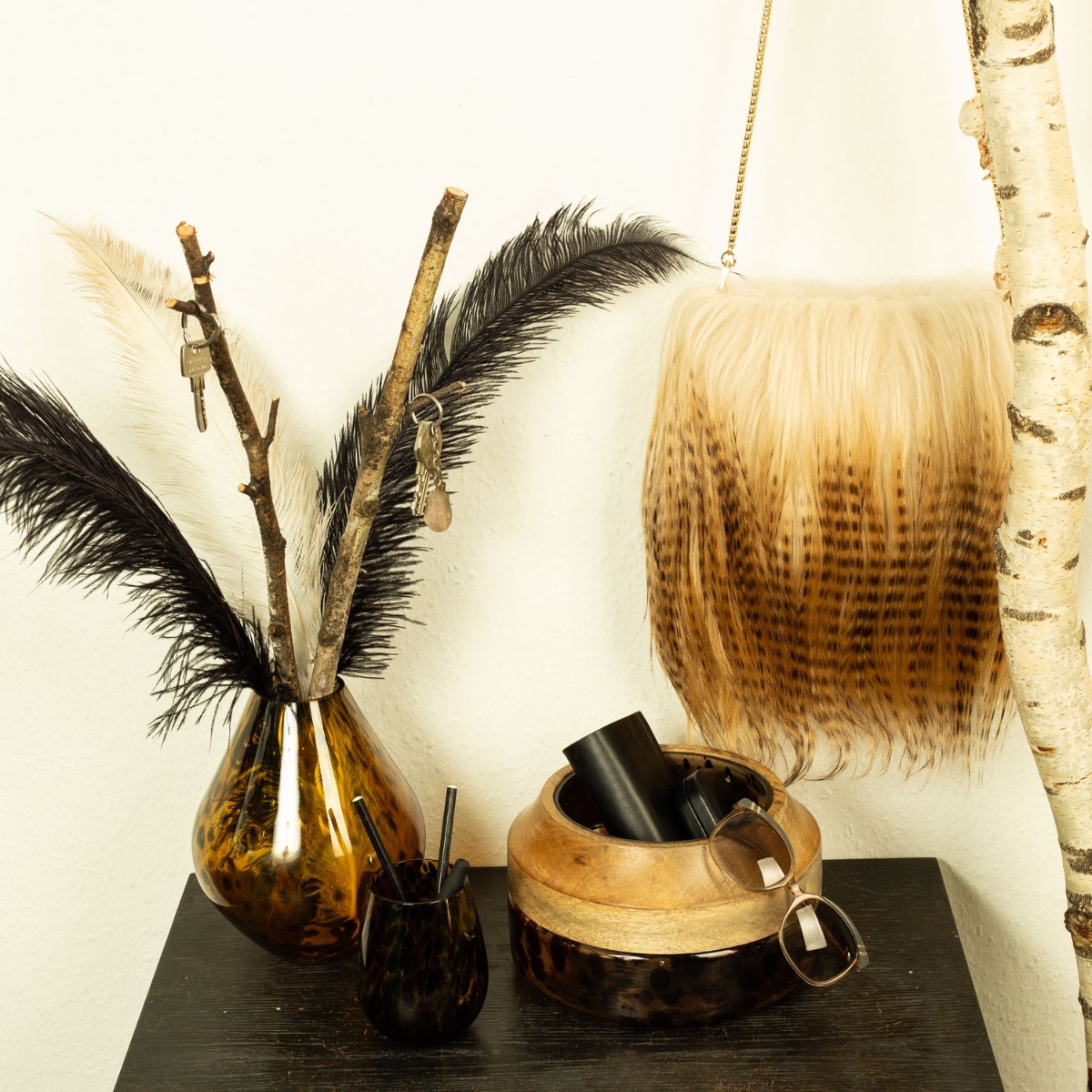 ¡Estampado de leo y plumas! Con este look mostramos lo versátiles que son nuestros productos. Los productos de vidrio con estampado de leopardo de la serie RUSSELL se han desaprovechado por completo. El florero, con plumas y abedul, sirve como soporte para bolígrafos y el cuenco de cristal con borde de madera auténtica es ideal para guardar gafas de sol, carteras y otras cosas. La bolsa de piel es imprescindible para todos los amantes de los animales. Compra el look!