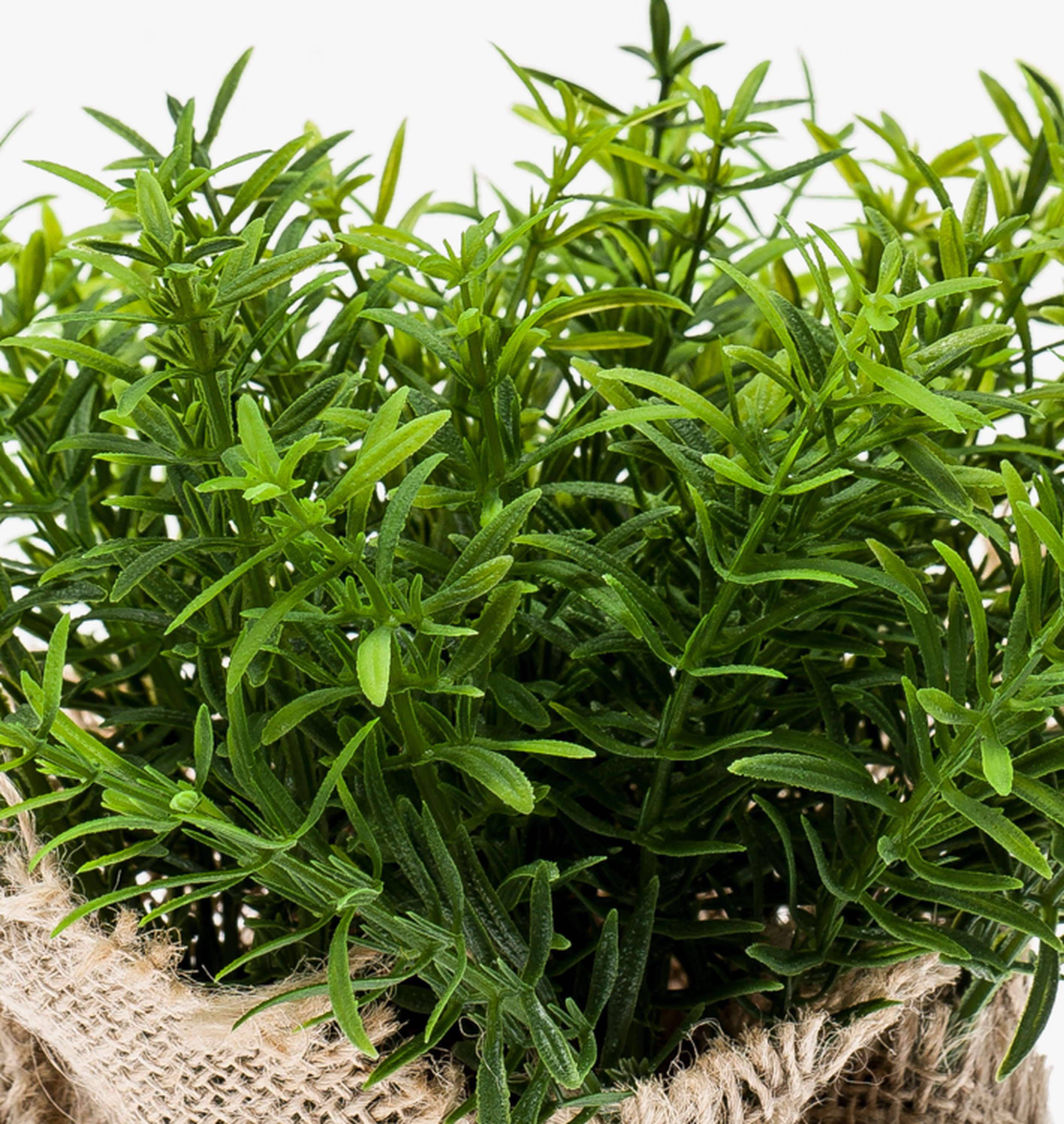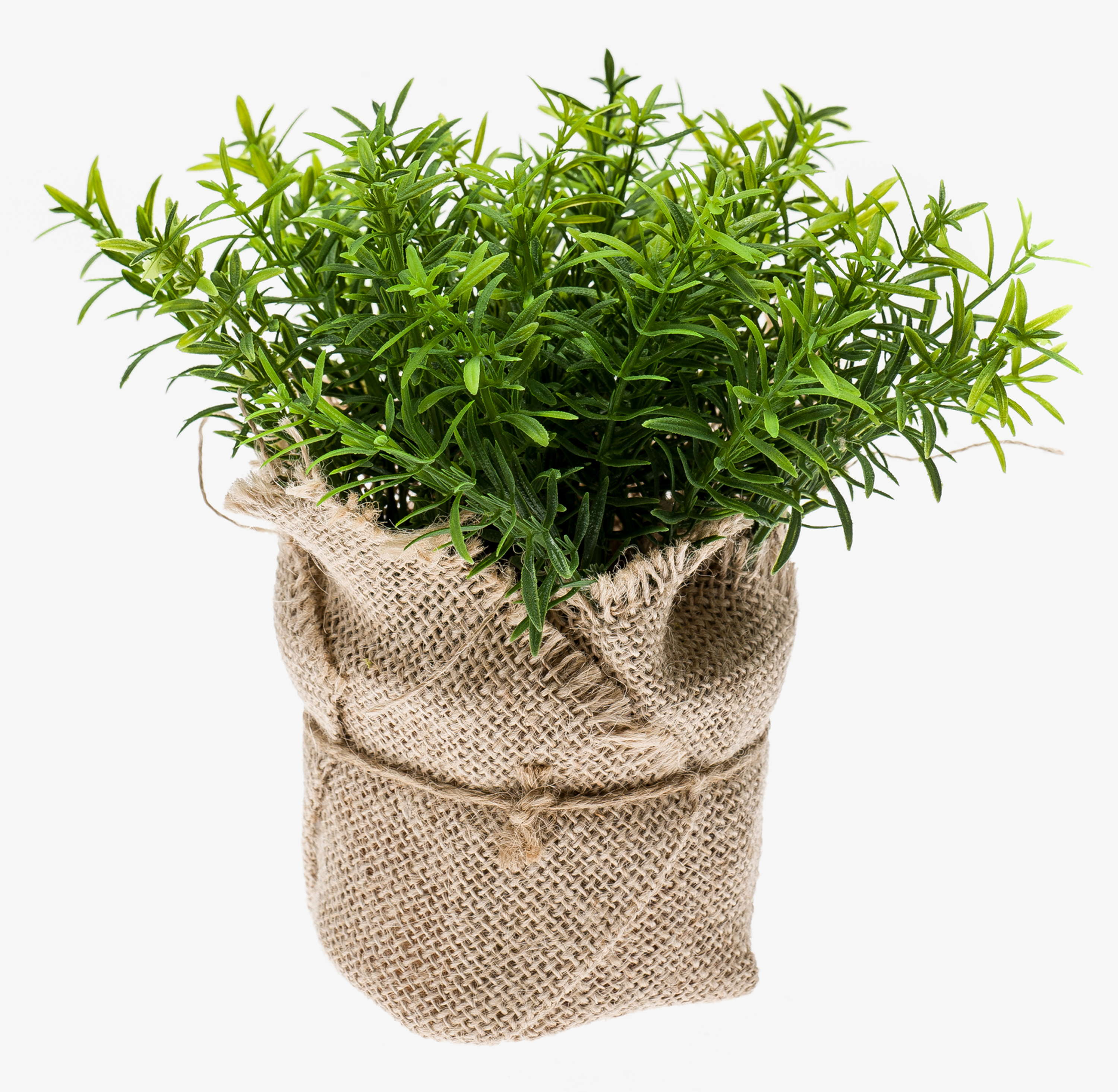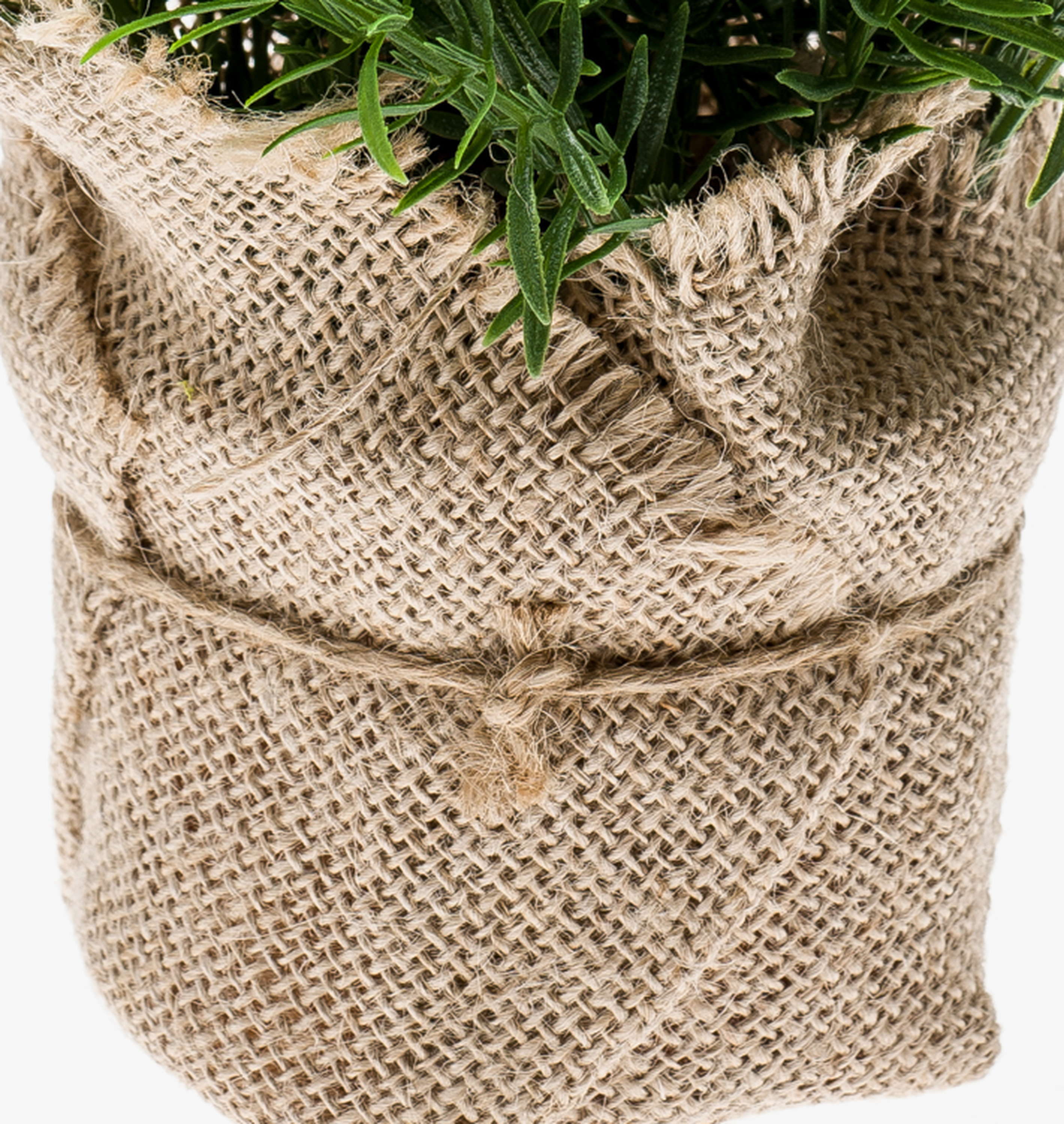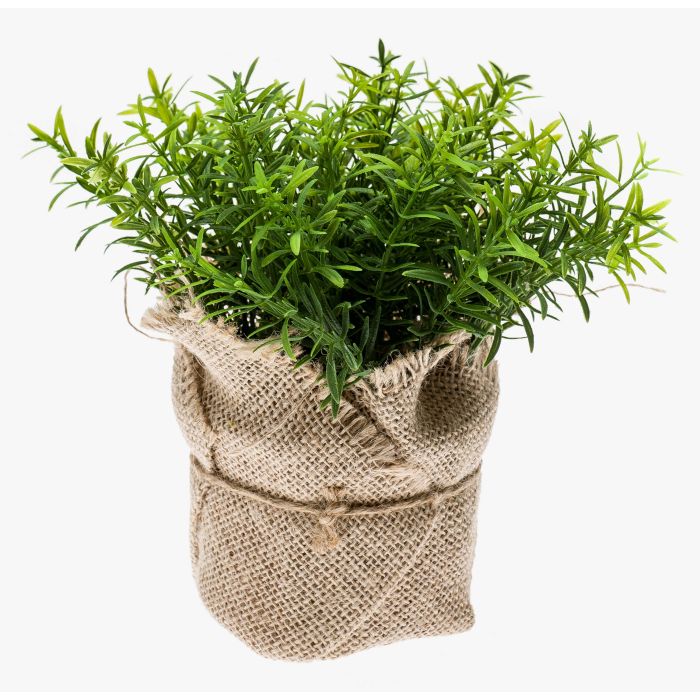 Preciosa hierba sintética VITUS con hojas en diferentes tonos que le dan una apariencia natural. El arbusto herbal artificial se encuentra en una bolsa decorativa de yute.