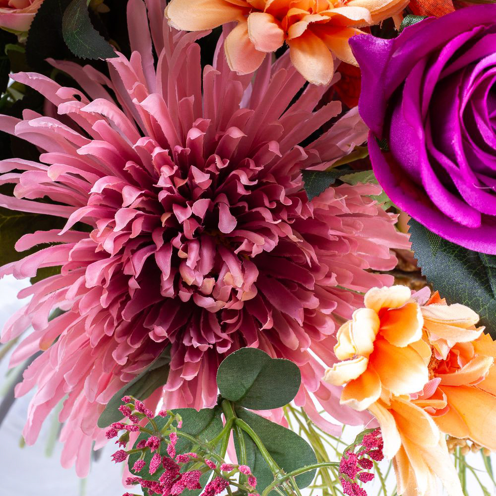 El opulento ramo de flores CIRILLA tiene una clásica forma redonda. La atención se centra en los rollizos crisantemos rosas, las brillantes rosas púrpuras y las juguetonas gerberas albaricoque que destacan audazmente del ramo. Las románticas rosas repollo, las delicadas ramitas de milenrama y skimmia, así como algunas ramitas de hierba, también aportan riqueza al ramo. Para dar un sutil toque otoñal, el conjunto incluye unas ramitas de eucalipto de color rojo anaranjado. Una combinación de colores realmente acertada a la que casi nadie puede resistirse.