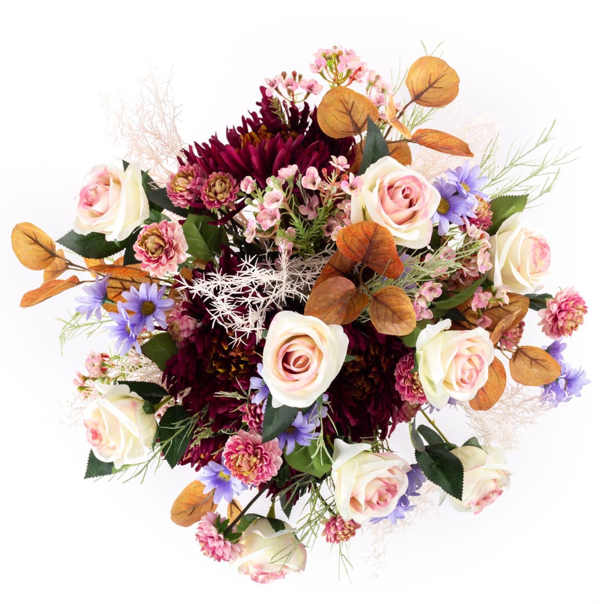 Preciosas rosas en rosa crema, exuberantes crisantemos en morado oscuro, finos crisantemos en rosa, así como accesorios de margaritas en azul morado, flores de cera rosas, finas ramitas de hierba y otoñales ramitas de eucalipto