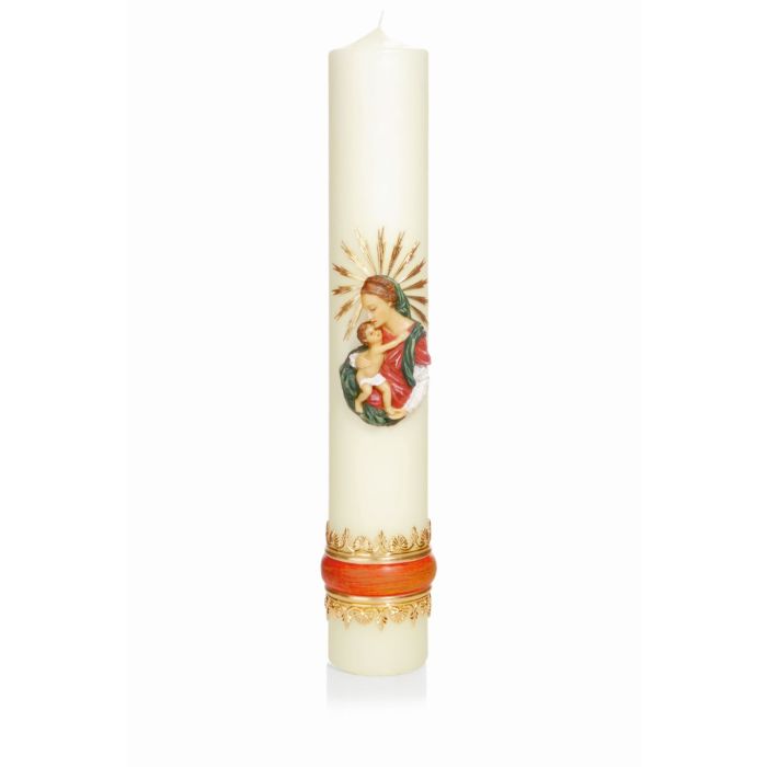 Vela de cera Virgen de los Dolores ALOISIA, decorada, marfil multicolor, 62 cm, Ø 10 cm - Fabricada en Alemania