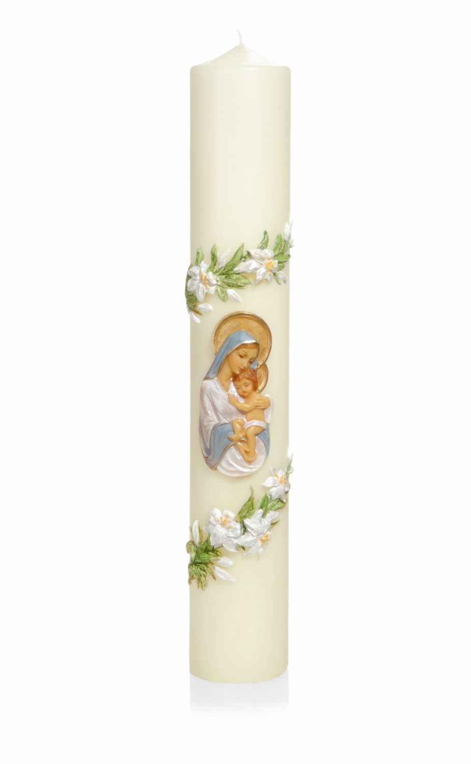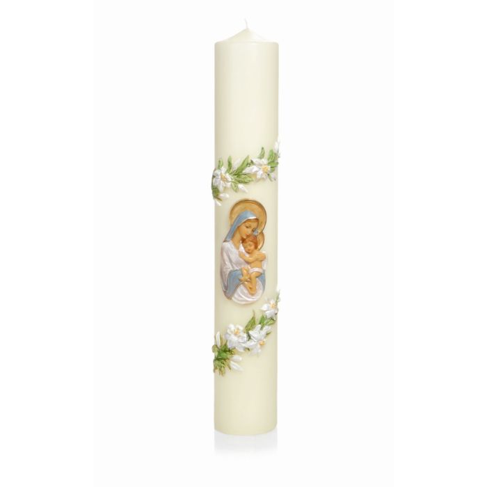 Vela mariana QUERIDA, decorada, marfil multicolor, 62 cm, Ø 10 cm - Fabricada en Alemania