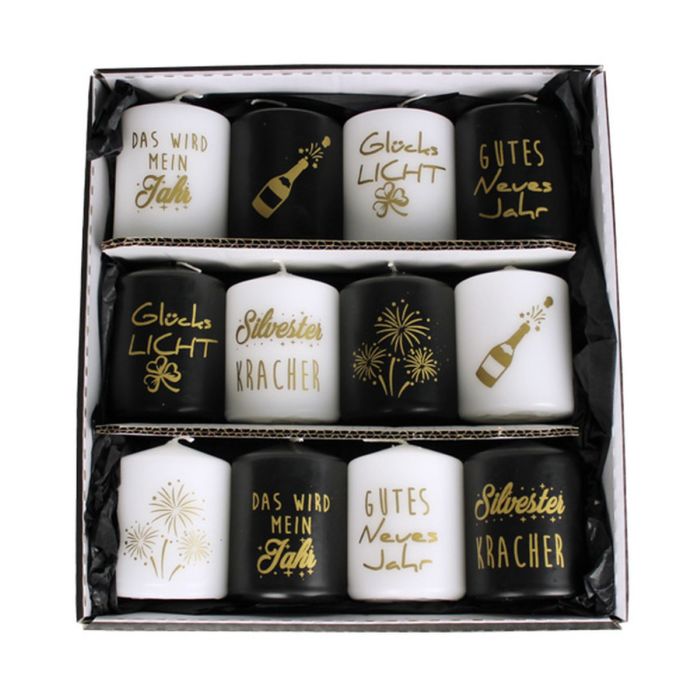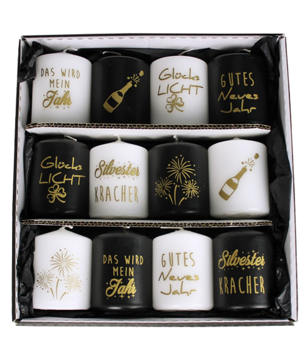 Velas planas de Nochevieja OVILA, 12 unidades, negro-blanco-dorado, 8 cm, Ø 6 cm - Fabricadas en Alemania