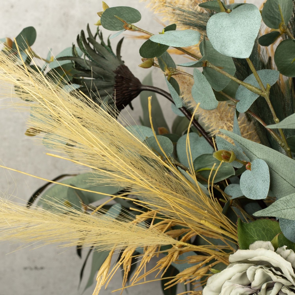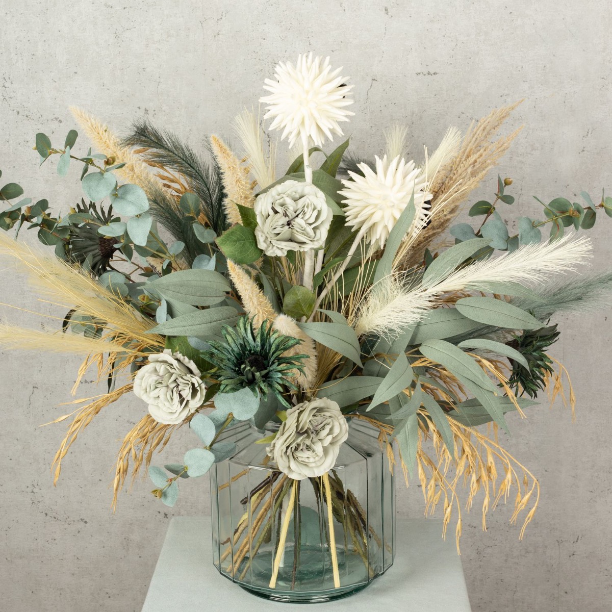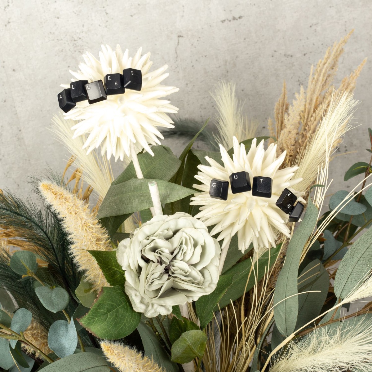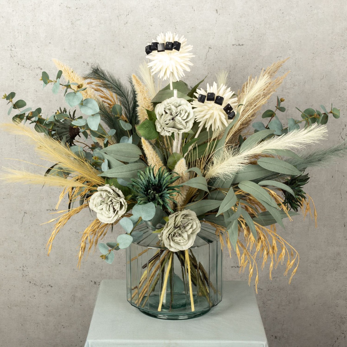 Verde eucalipto y beige cereal! Hemos hecho este moderno ramo para despedir a una compañera muy especial. Nuestra Stephanie desgraciadamente ha decidido dejar la empresa. Un motivo para que creáramos un ramo extraordinario. Las rosas de color verde pálido y las gerberas aterciopeladas de color petróleo hacen que este ramo sea sencillamente único. La hierba de stipa en varios tonos de beige y verde tiene un efecto refrescante y confiere al ramo un aspecto natural. Las ramas de eucalipto combinan a la perfección y hacen que el ramo marque tendencia. El allium blanco, el punto culminante de este look, ilumina y hace brillar todo el ramo. Haz feliz a alguien especial con este ramo. Compra el look!