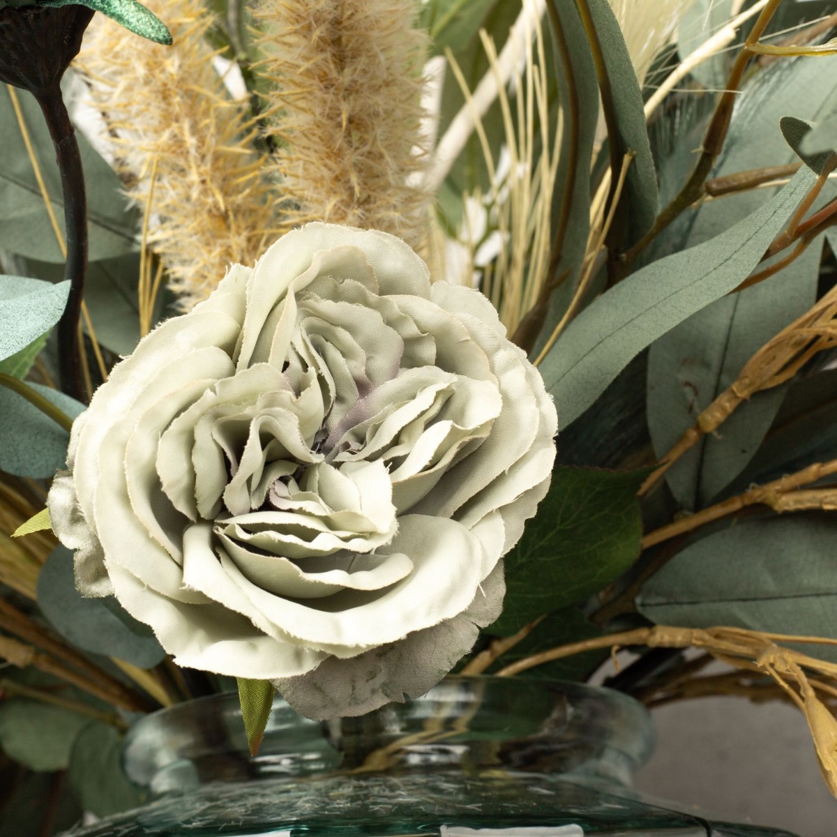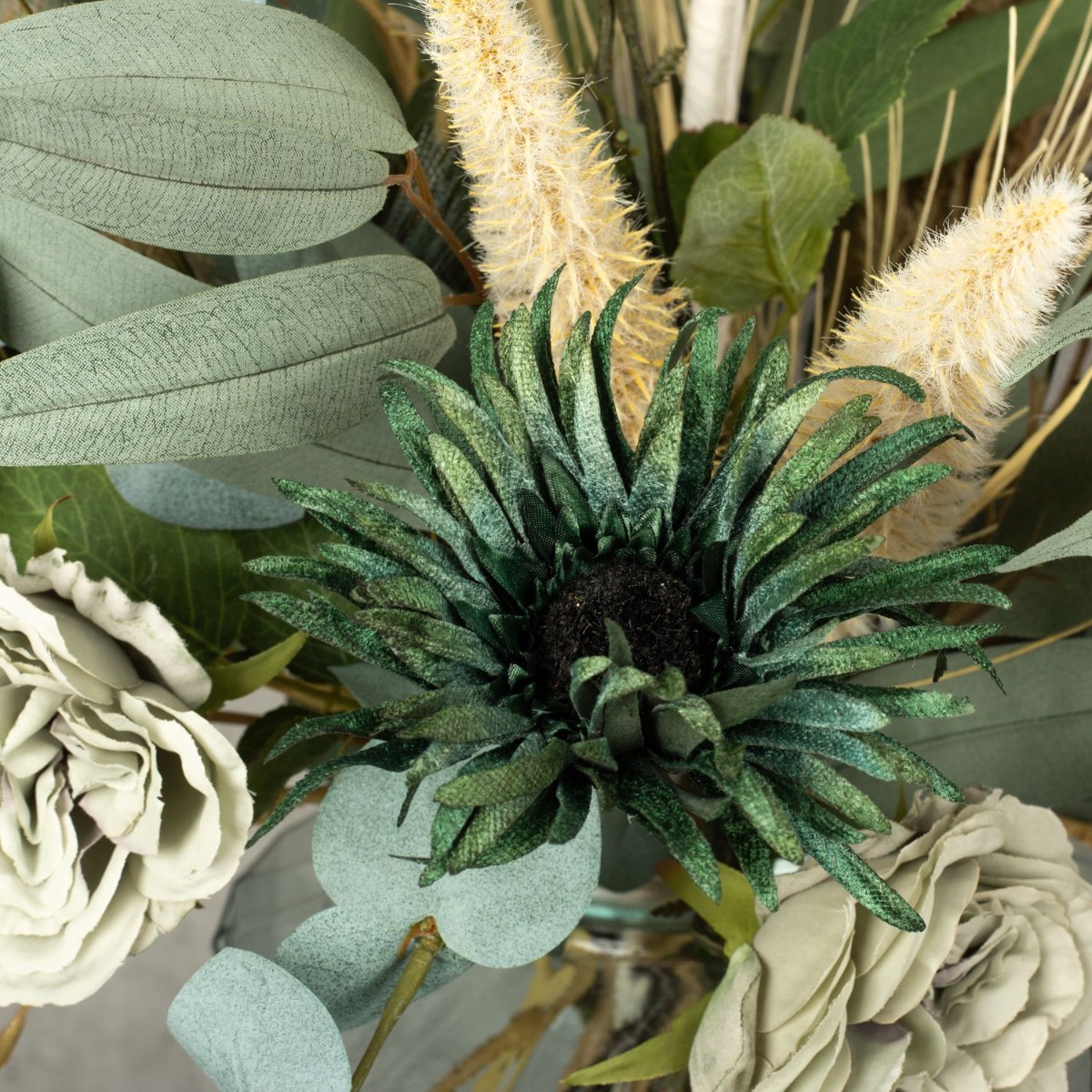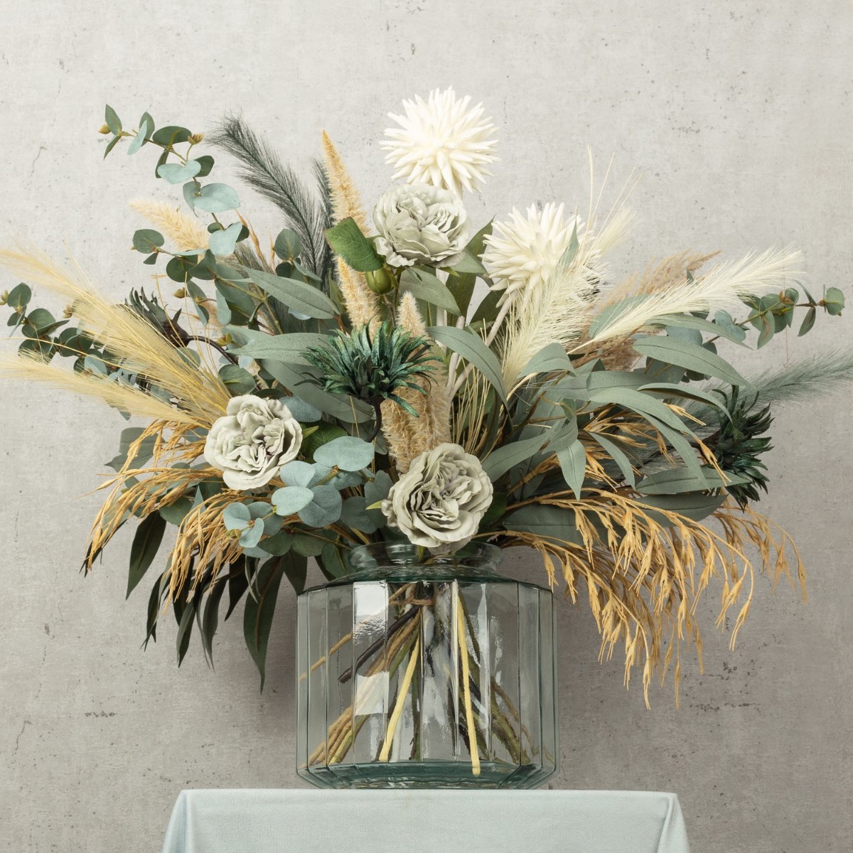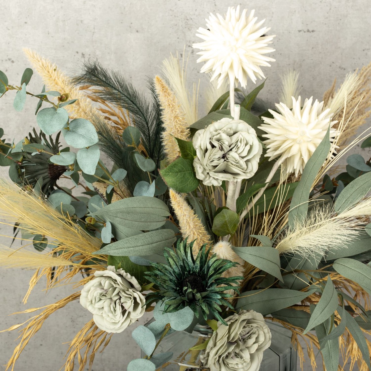 Verde eucalipto y beige cereal! Hemos hecho este moderno ramo para despedir a una compañera muy especial. Nuestra Stephanie desgraciadamente ha decidido dejar la empresa. Un motivo para que creáramos un ramo extraordinario. Las rosas de color verde pálido y las gerberas aterciopeladas de color petróleo hacen que este ramo sea sencillamente único. La hierba de stipa en varios tonos de beige y verde tiene un efecto refrescante y confiere al ramo un aspecto natural. Las ramas de eucalipto combinan a la perfección y hacen que el ramo marque tendencia. El allium blanco, el punto culminante de este look, ilumina y hace brillar todo el ramo. Haz feliz a alguien especial con este ramo. Compra el look!