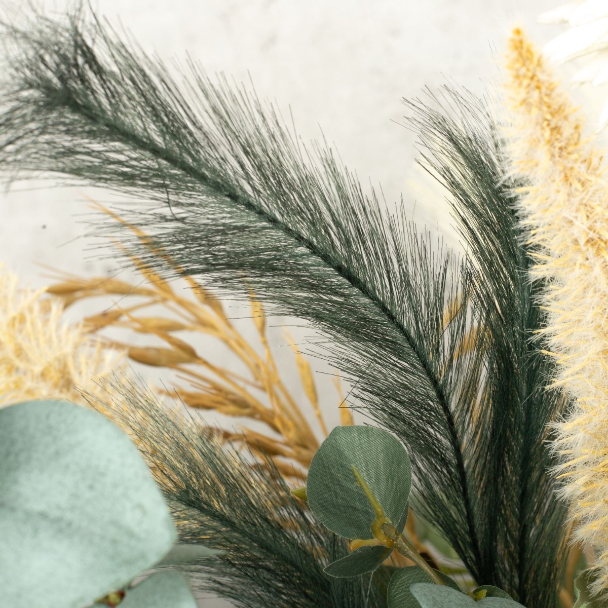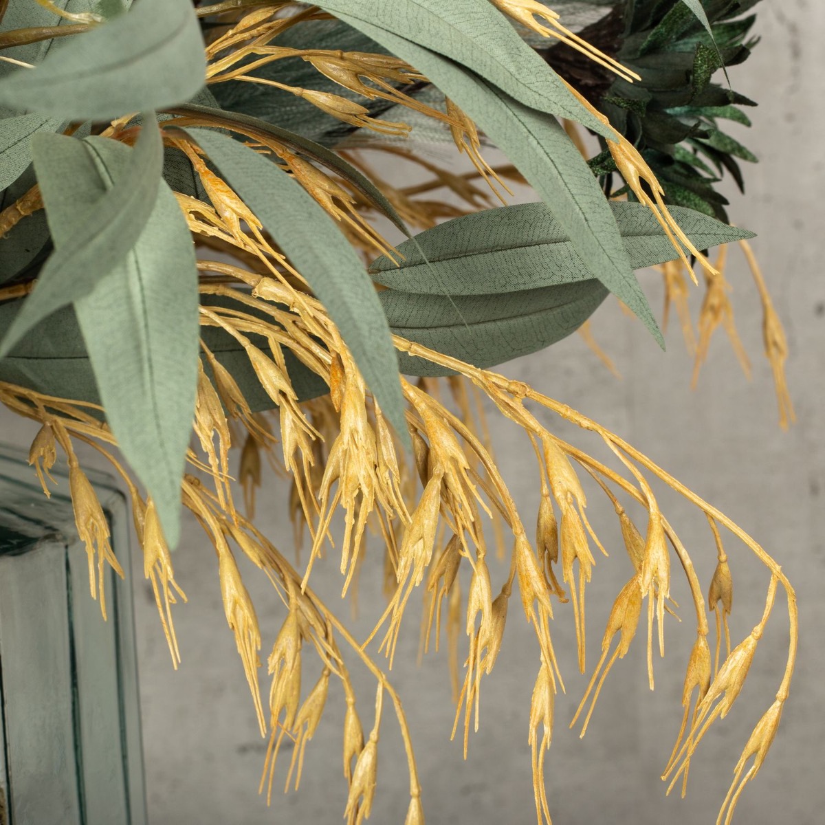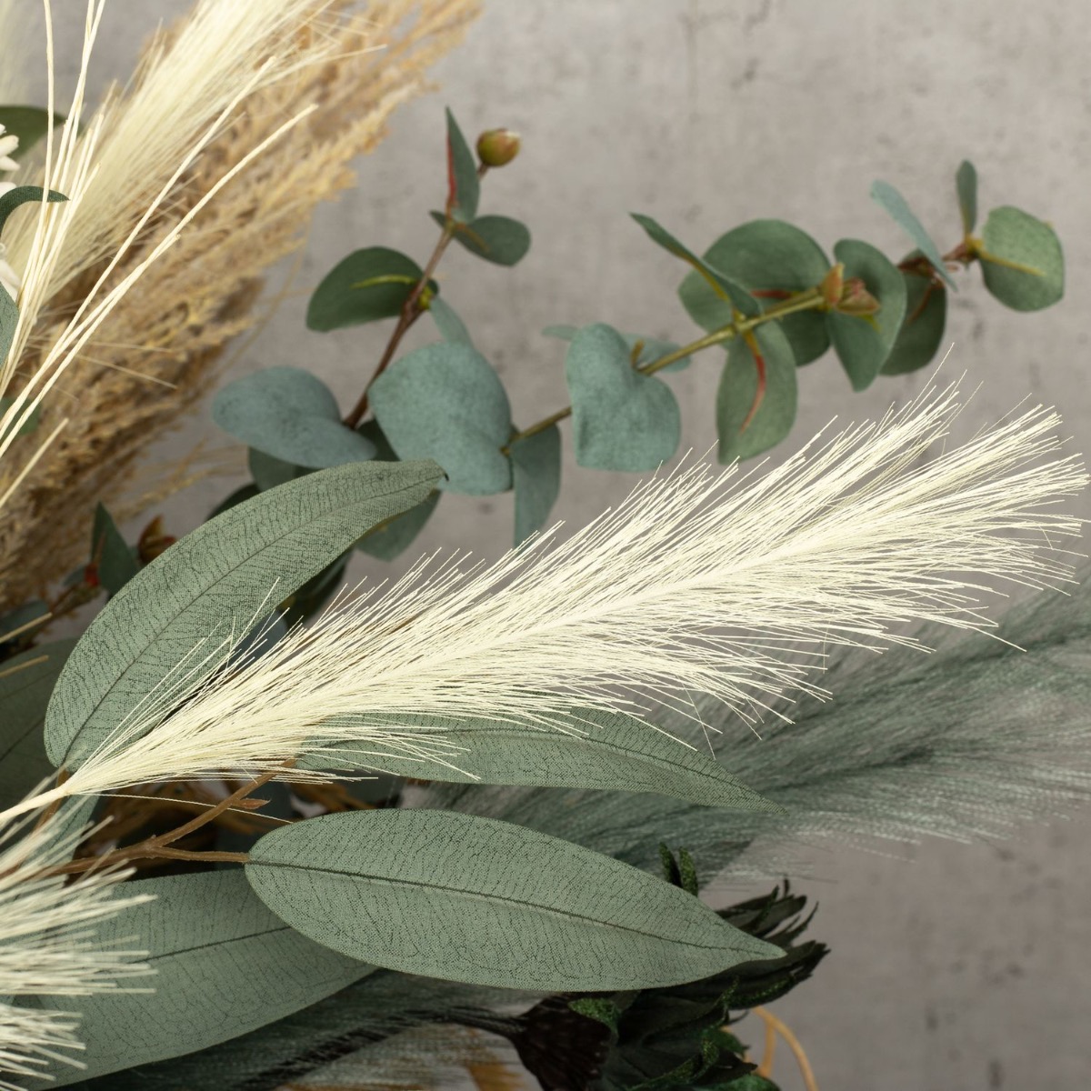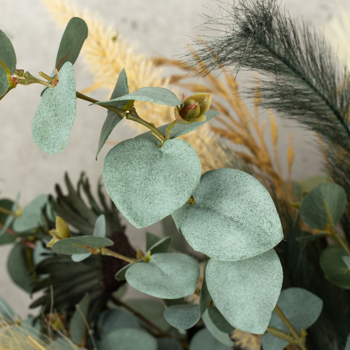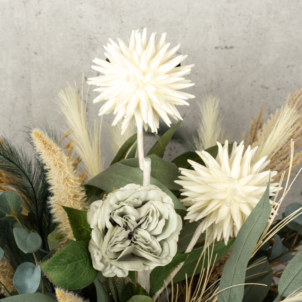 Consejo de diseño: Si no tienes mucha experiencia en la elaboración de ramos, puedes proceder de forma muy sencilla a la hora de diseñar este ramo. Coloca el jarrón delante de ti e introduce cada rama individualmente en el jarrón. Proceda de fuera hacia dentro. Las ramas deben ser más cortas en el exterior que en el centro y colgar un poco hacia abajo; si es necesario, doble las ramas un poco antes. Algunas ramas aún deben recortarse a la altura del jarrón. Así se crea la forma redonda y clásica de un ramo.