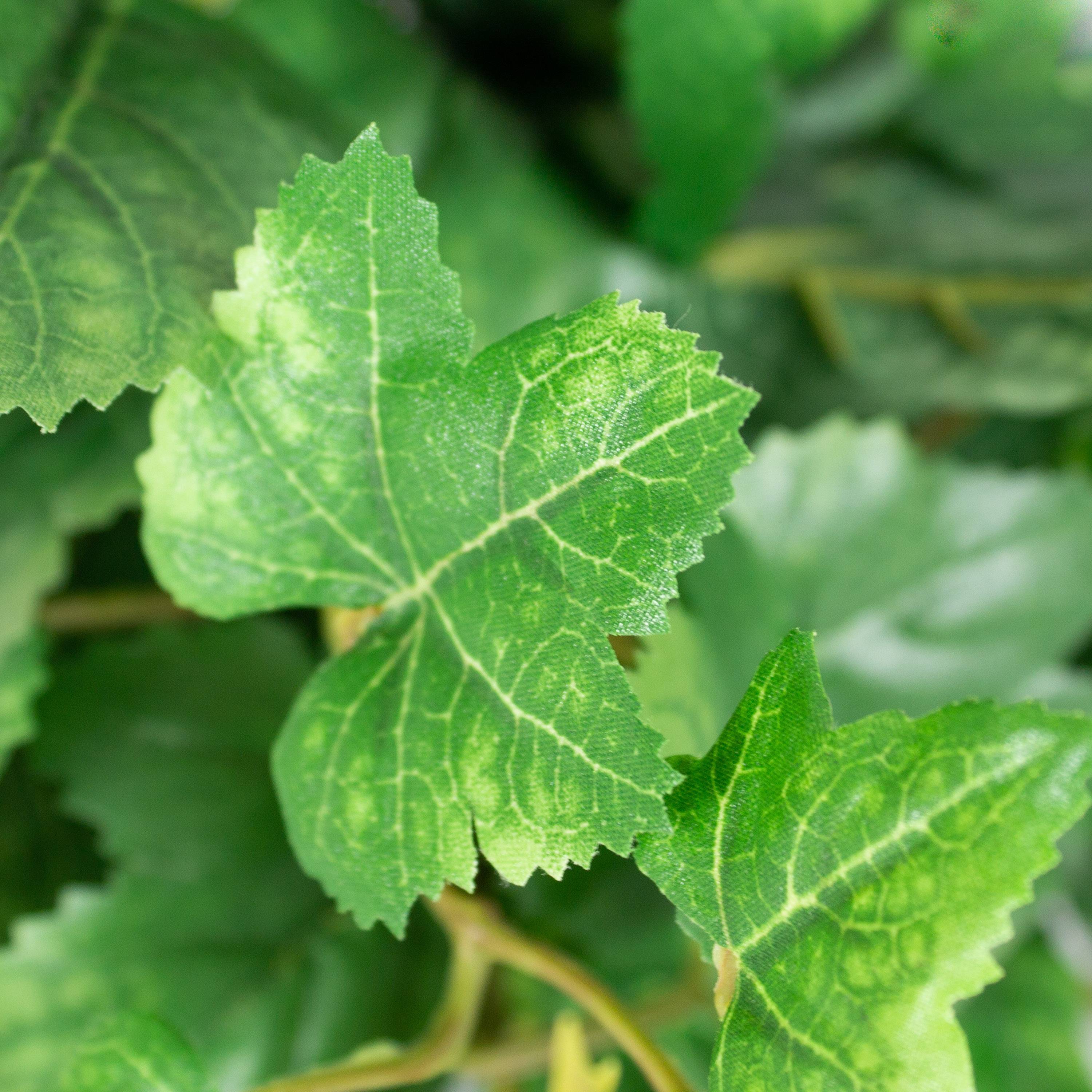 La liana de plástico TARON en color verde tiene un diámetro total de unos 35 cm. Gracias a sus ramas y a sus hojas alargadas y dentadas, esta planta artificial de vid se adapta perfectamente a una maceta.
