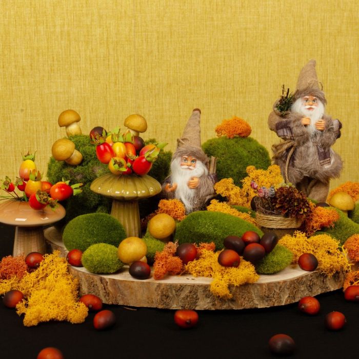 ¡Musgo, enanos y setas! Con este look, hemos creado un maravilloso mundo otoñal que invita a soñar a niños y mayores. Lo más destacado de esta decoración otoñal son nuestras setas de cerámica, que pueden utilizarse como un pequeño jarrón. El gran disco de madera es la base perfecta para nuestro mundo, que se ha decorado con pequeñas y grandes piedras de musgo. Esto crea un mágico paisaje de colinas que está esperando a que los atareados enanos se desplacen y recojan las deliciosas setas y castañas. Compra el look!