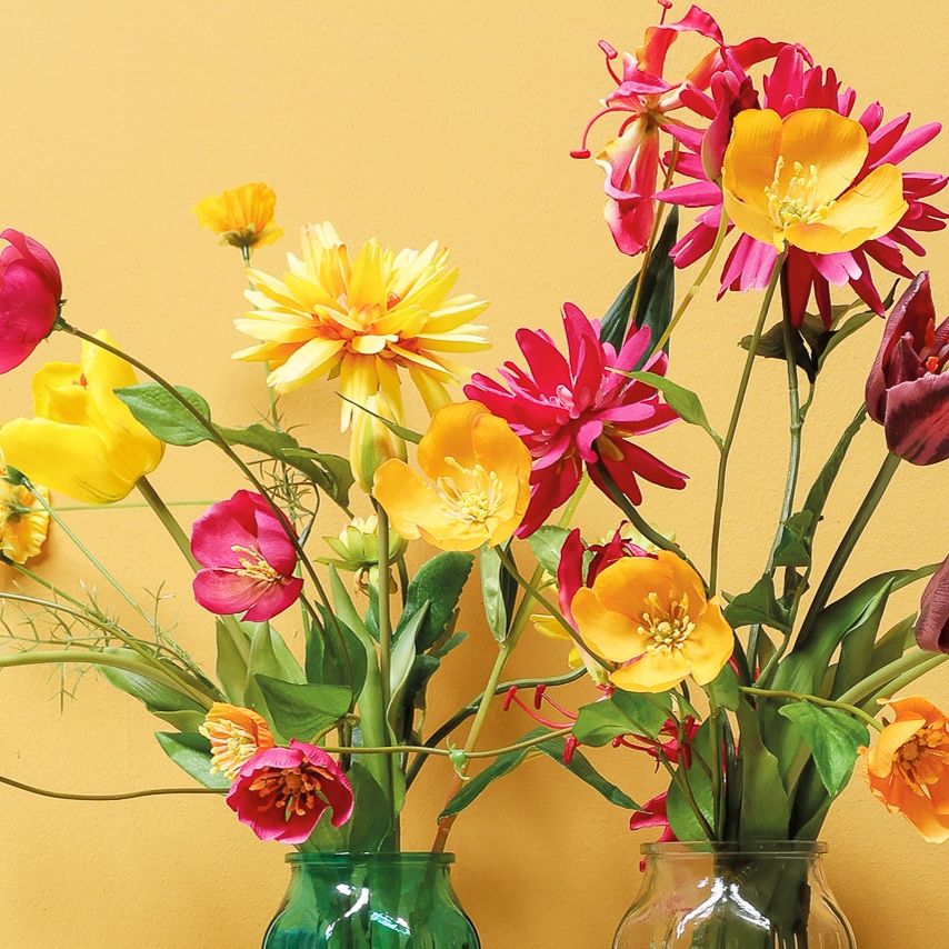 ¡Viva la vida, viva la fiesta, viva la noche! El nombre lo dice todo: este look tiene todo lo necesario para celebrar la vida y el verano con todas sus fiestas y noches cálidas. Ya sea para el día a día en casa, como decoración en una fiesta de verano o en una noche de fiesta, las brillantes dalias, los exóticos tulipanes papagayo y las gloriosas, las caléndulas y los ranúnculos llenan los elegantes jarrones de cristal y desprenden pura alegría de vivir. ¡Compra el look!