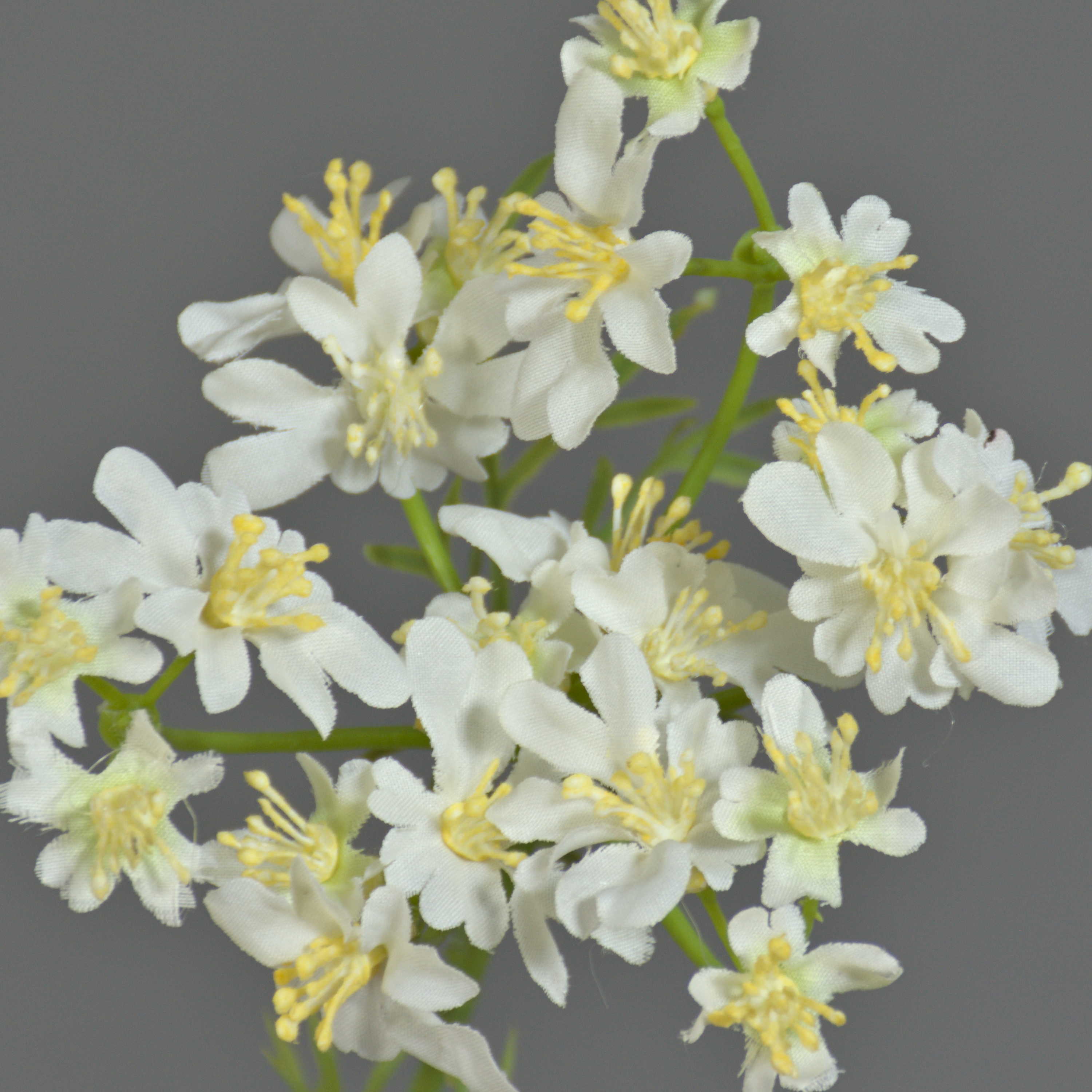 La rama con flores falsas KALOMIRA de color blanco posee una dimensión total de aprox. 85 cm y se encuentra unida a un tallo.